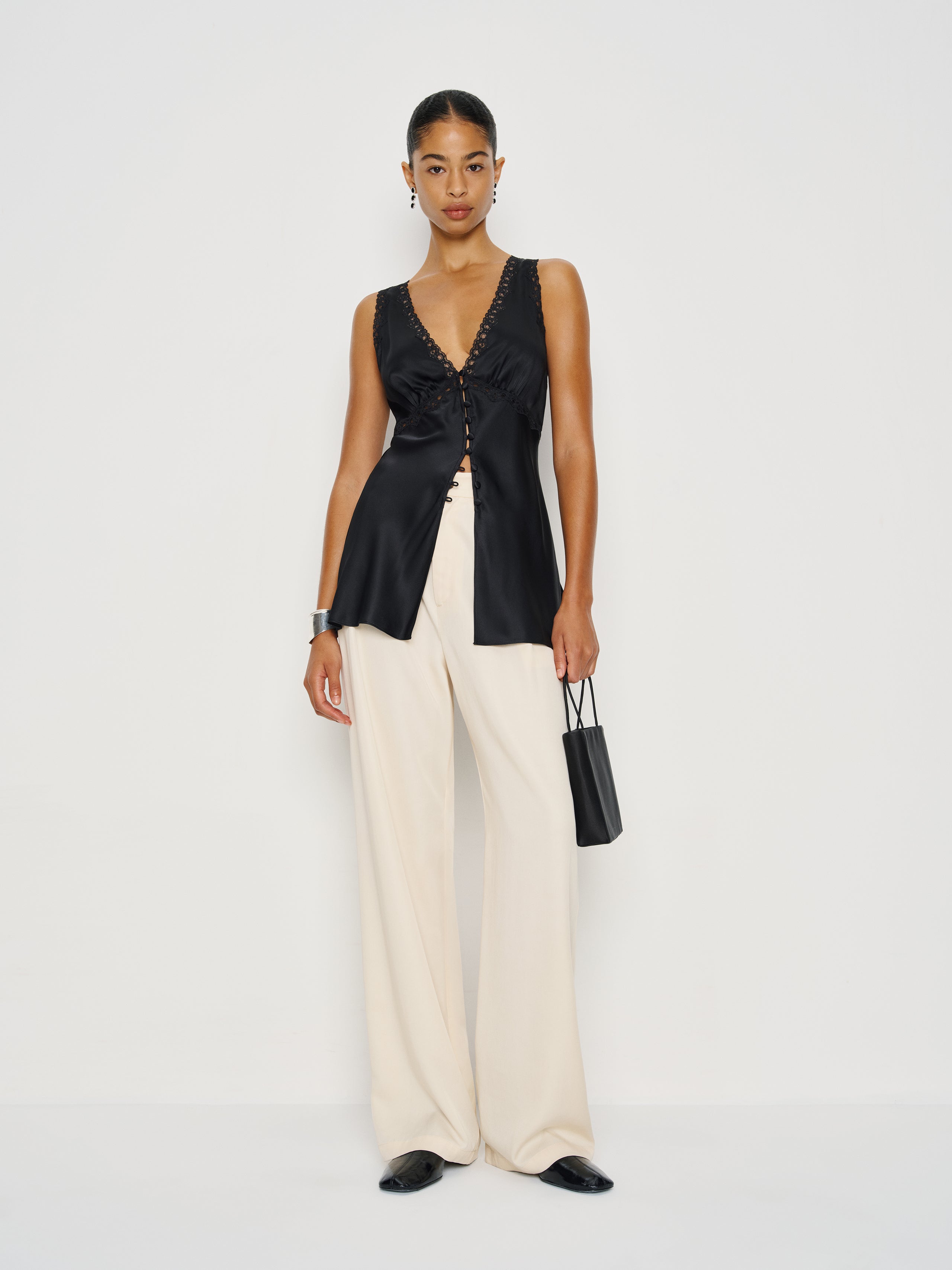 Romance alert. Shop the Addie Silk Top from Reformation, a sleeveless top with a V-neckline, button front, lace detailing, and adjustable tie in the back.