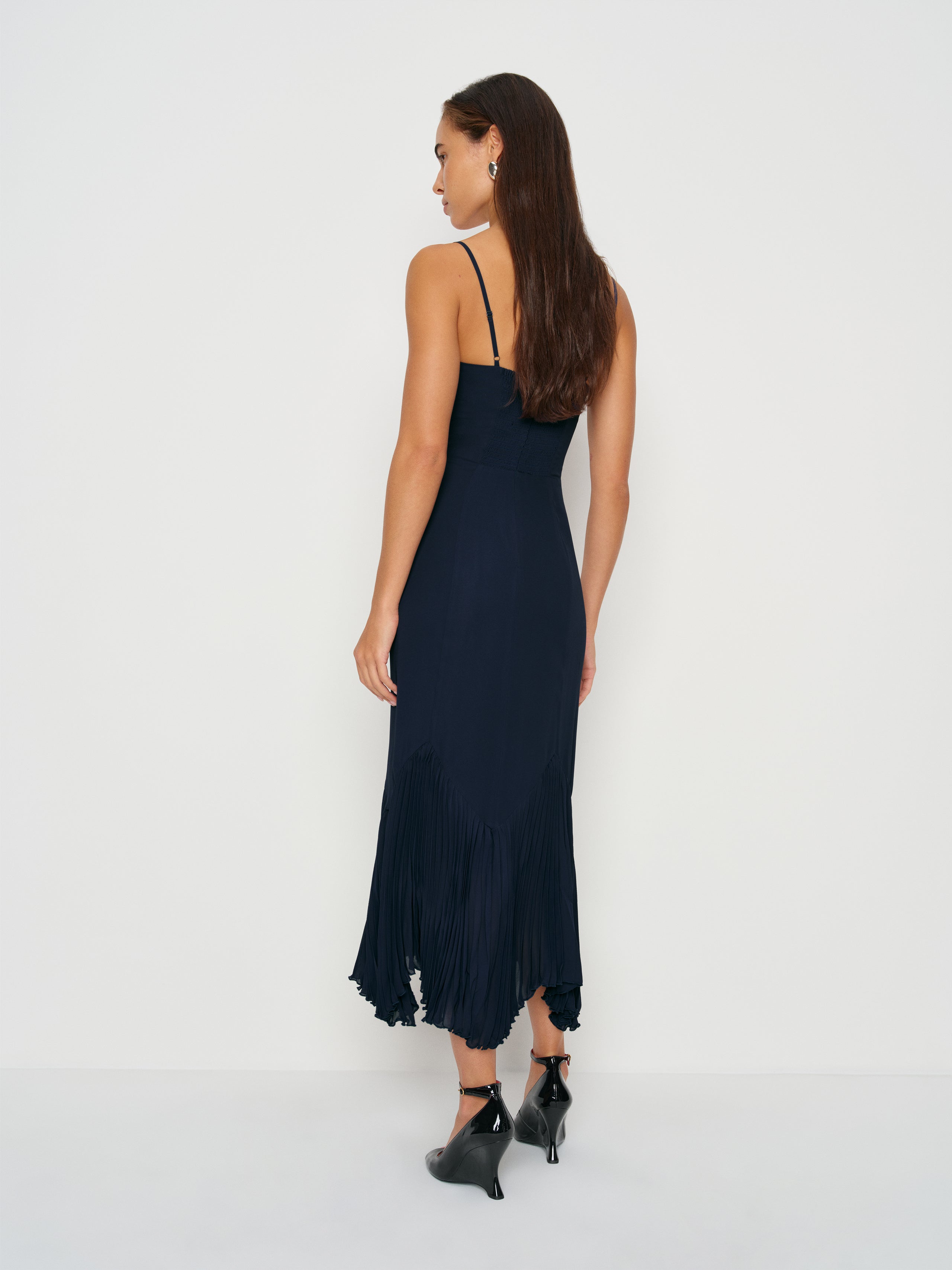 How dreamy. Shop the Aiko Dress from Reformation, a midi length dress with a sweetheart neckline, bust cup seams, ruffling at the neckline, and a pleated hem.