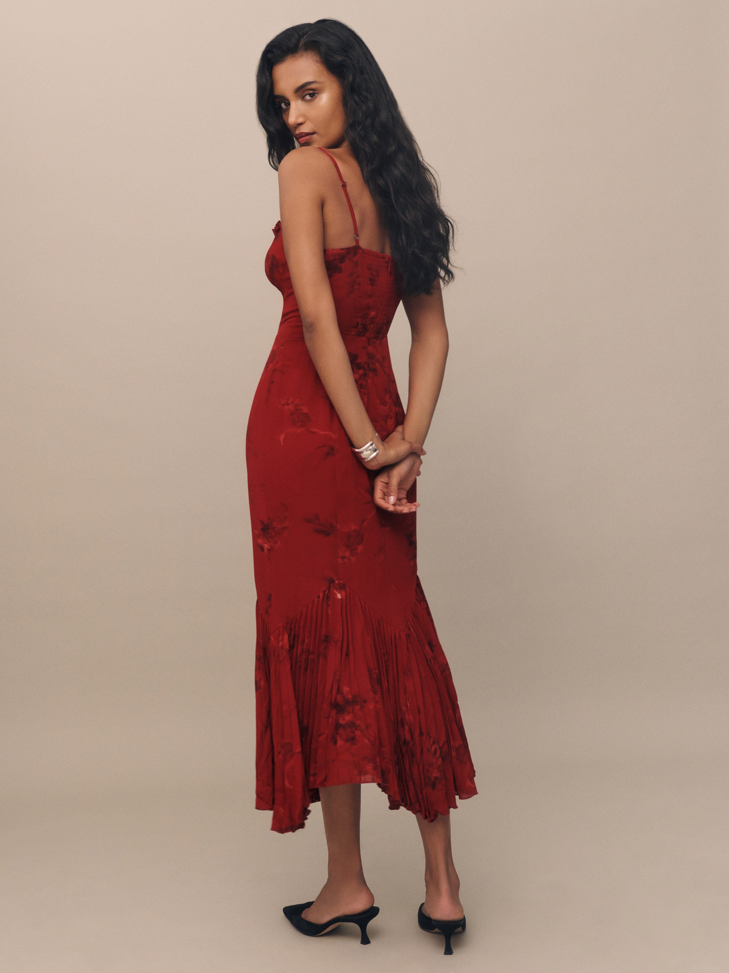 How dreamy. Shop the Aiko Dress from Reformation, a midi length dress with a sweetheart neckline, bust cup seams, ruffling at the neckline, and a pleated hem.
