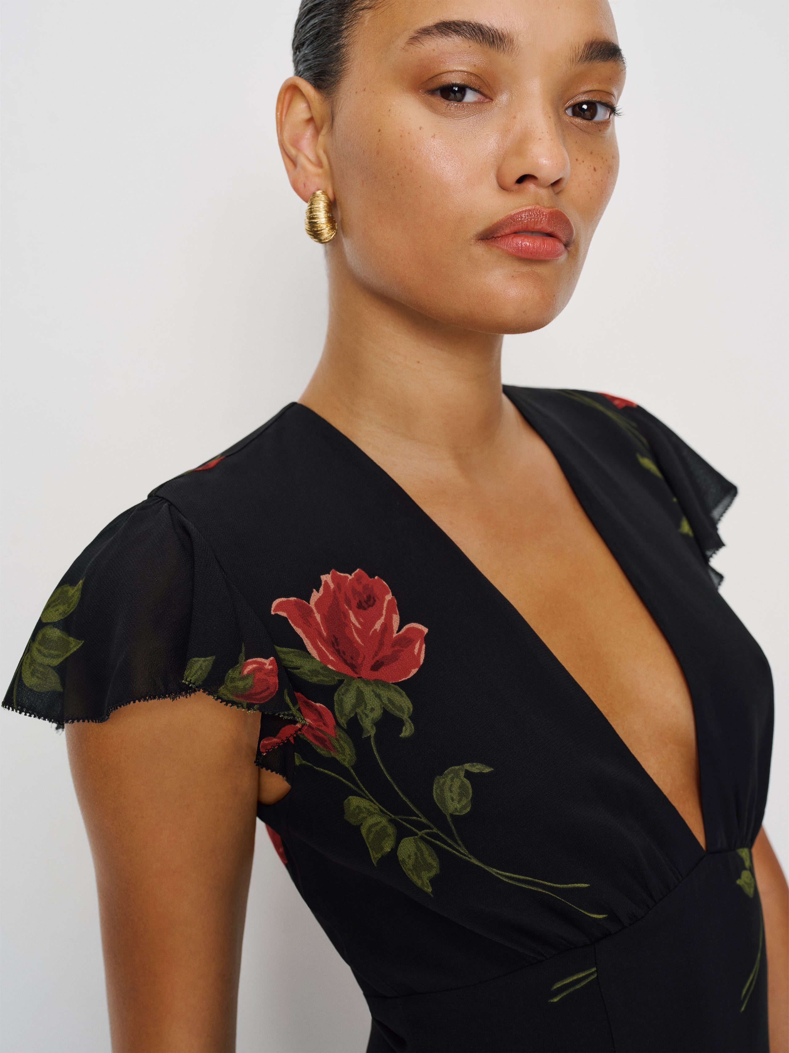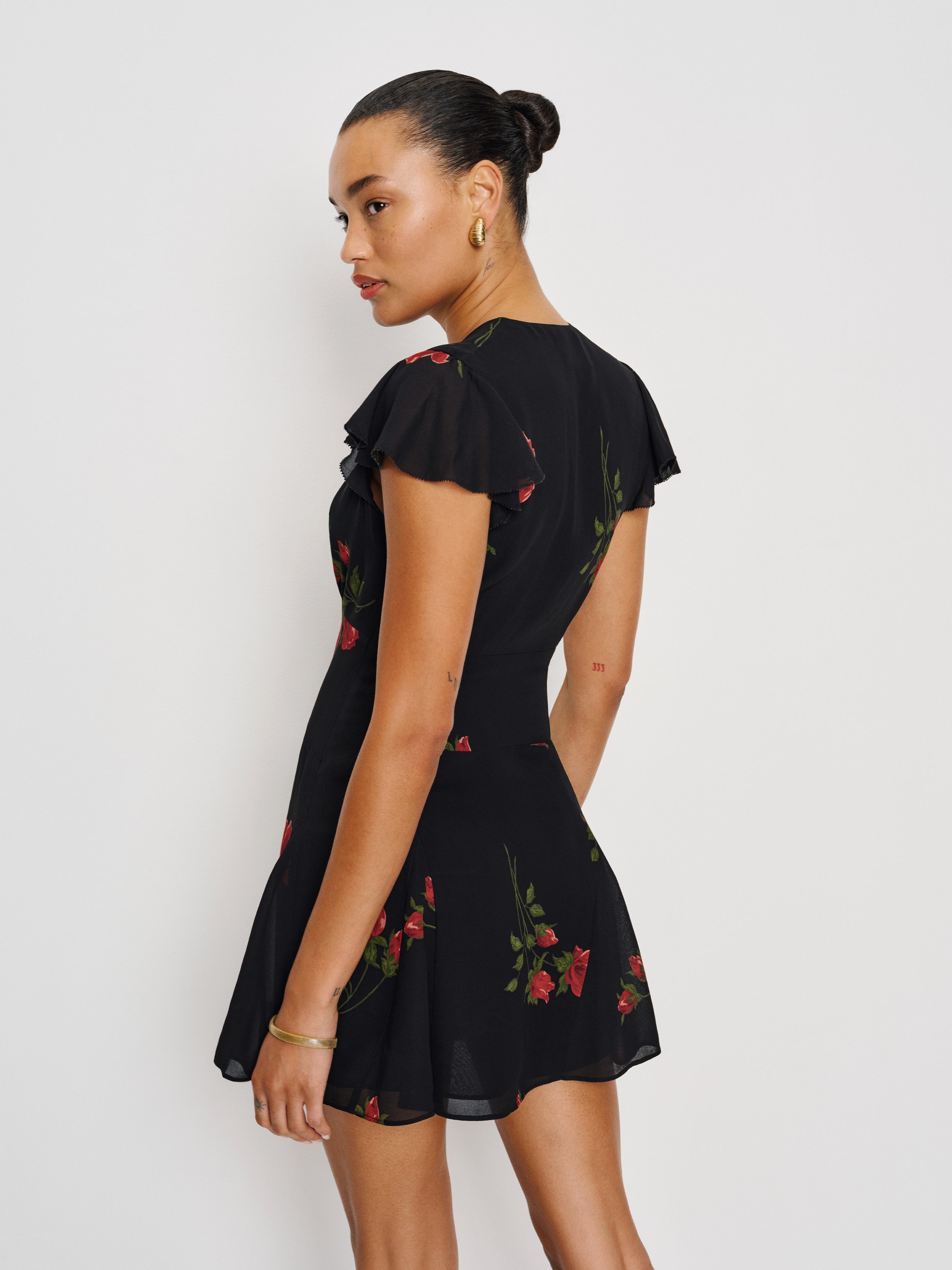 You make it look easy. Shop the Alain Dress from Reformation, a short-sleeved mini dress with a V-neckline, an A-line shape, and a flutter sleeve.
