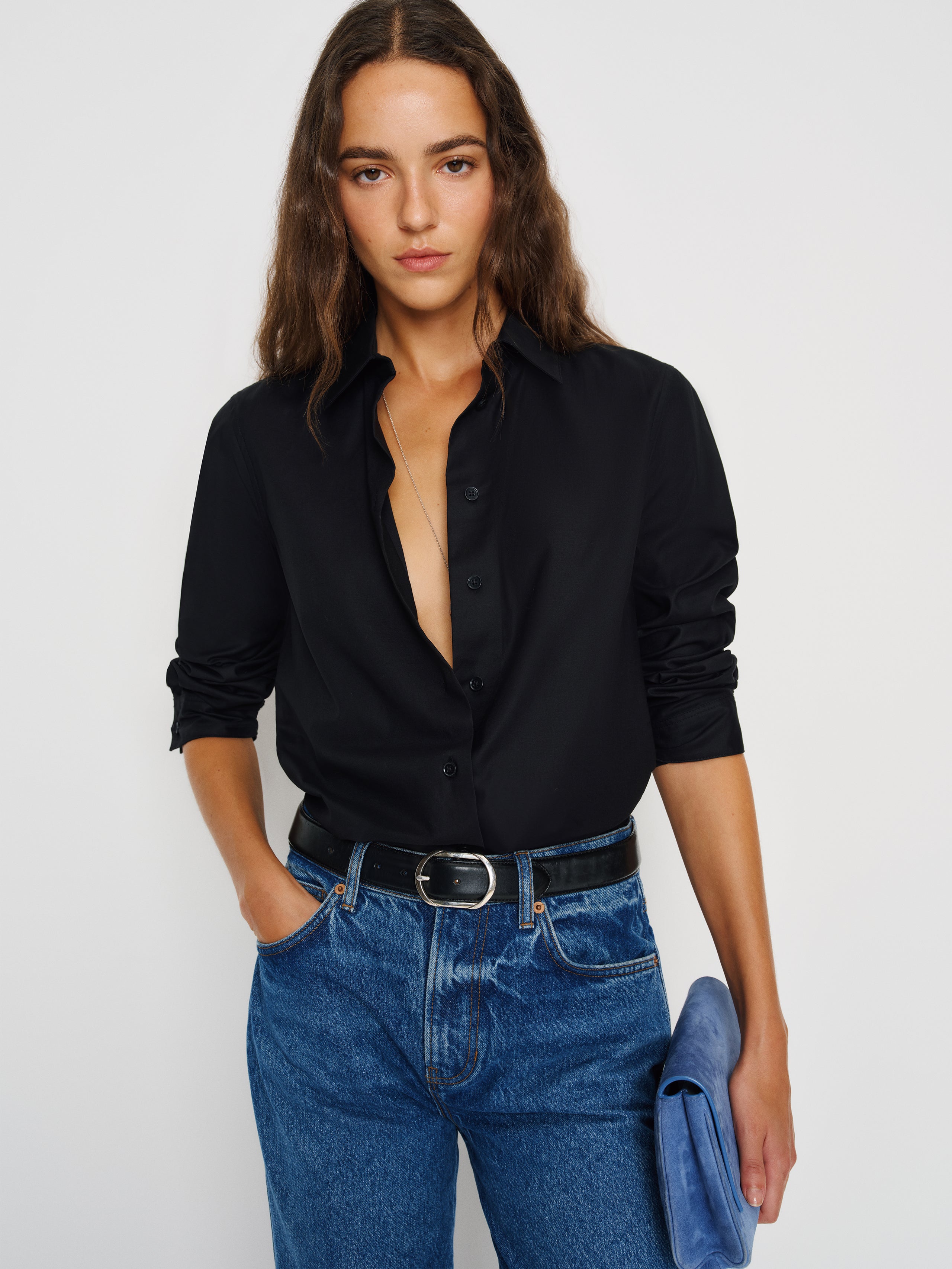 Up top. Shop the Alfie Relaxed Shirt from Reformation, a long-sleeved shirt with a collared neckline and...
