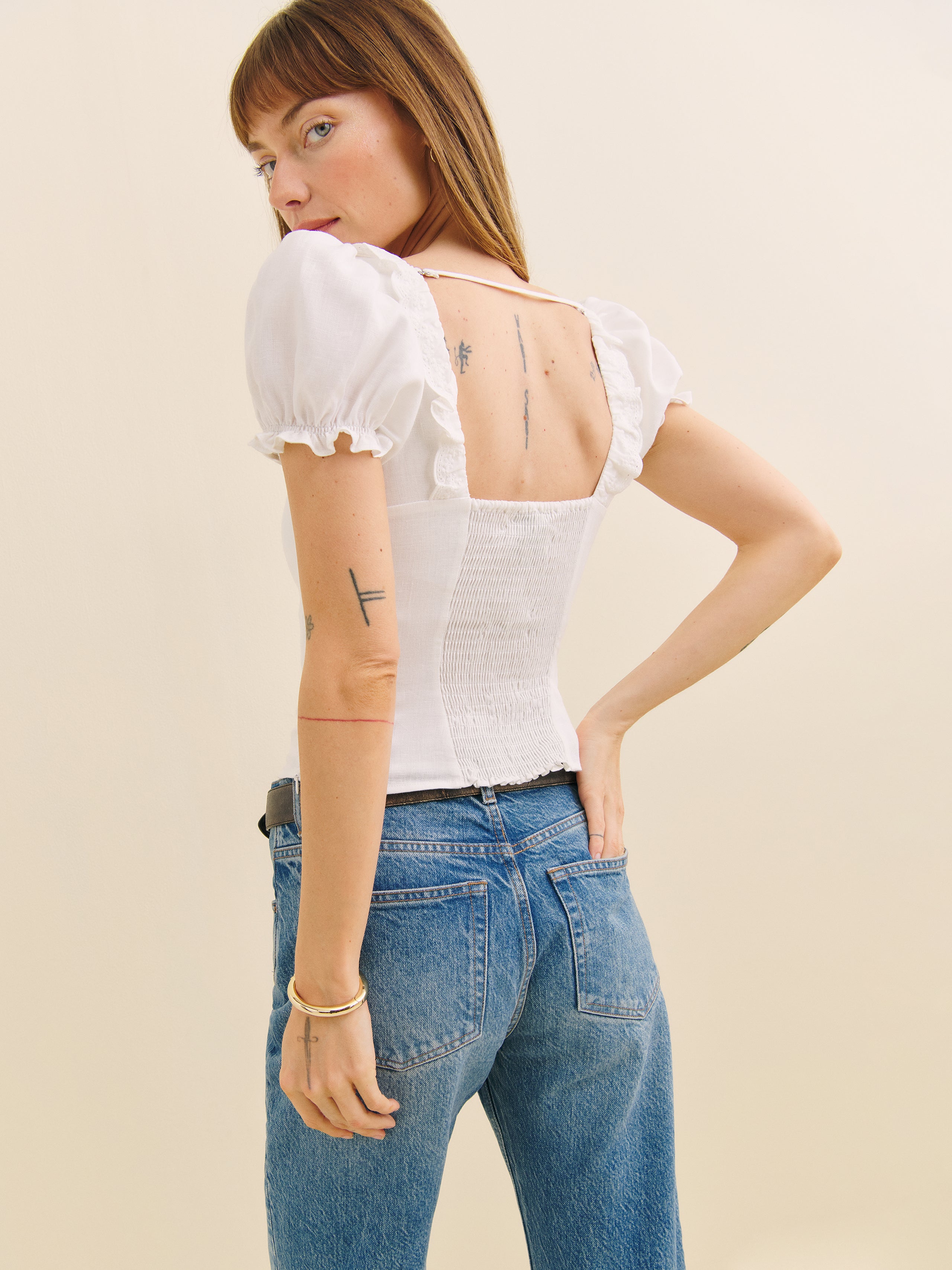Up top. Shop the Alice Linen Top from Reformation, a short-sleeved top with a straight neckline, puff sleeves, and ruffle detailing.
