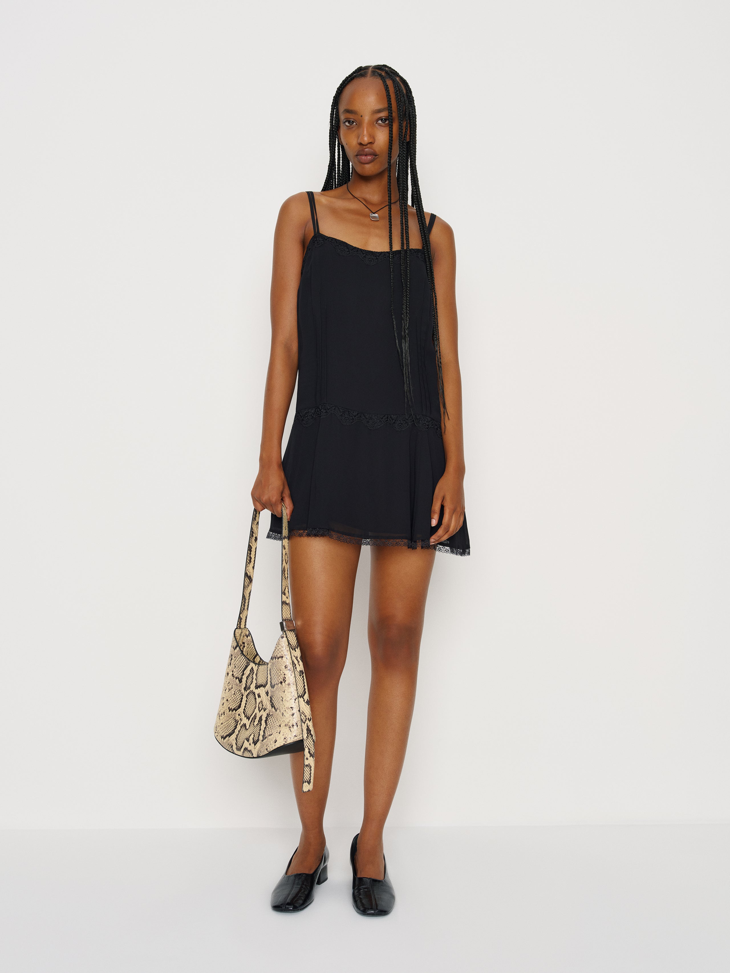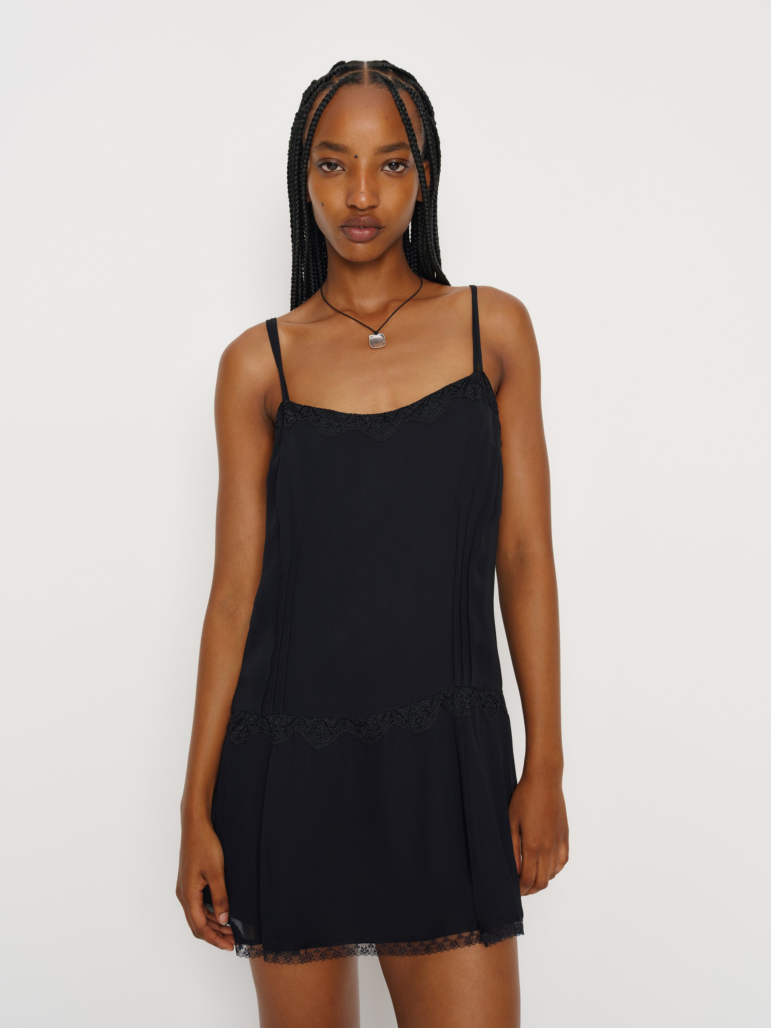 Short and sweet. Shop the Allis Dress from Reformation, a sleeveless mini dress with a curved neckline, adjustable straps, and lace detailing.