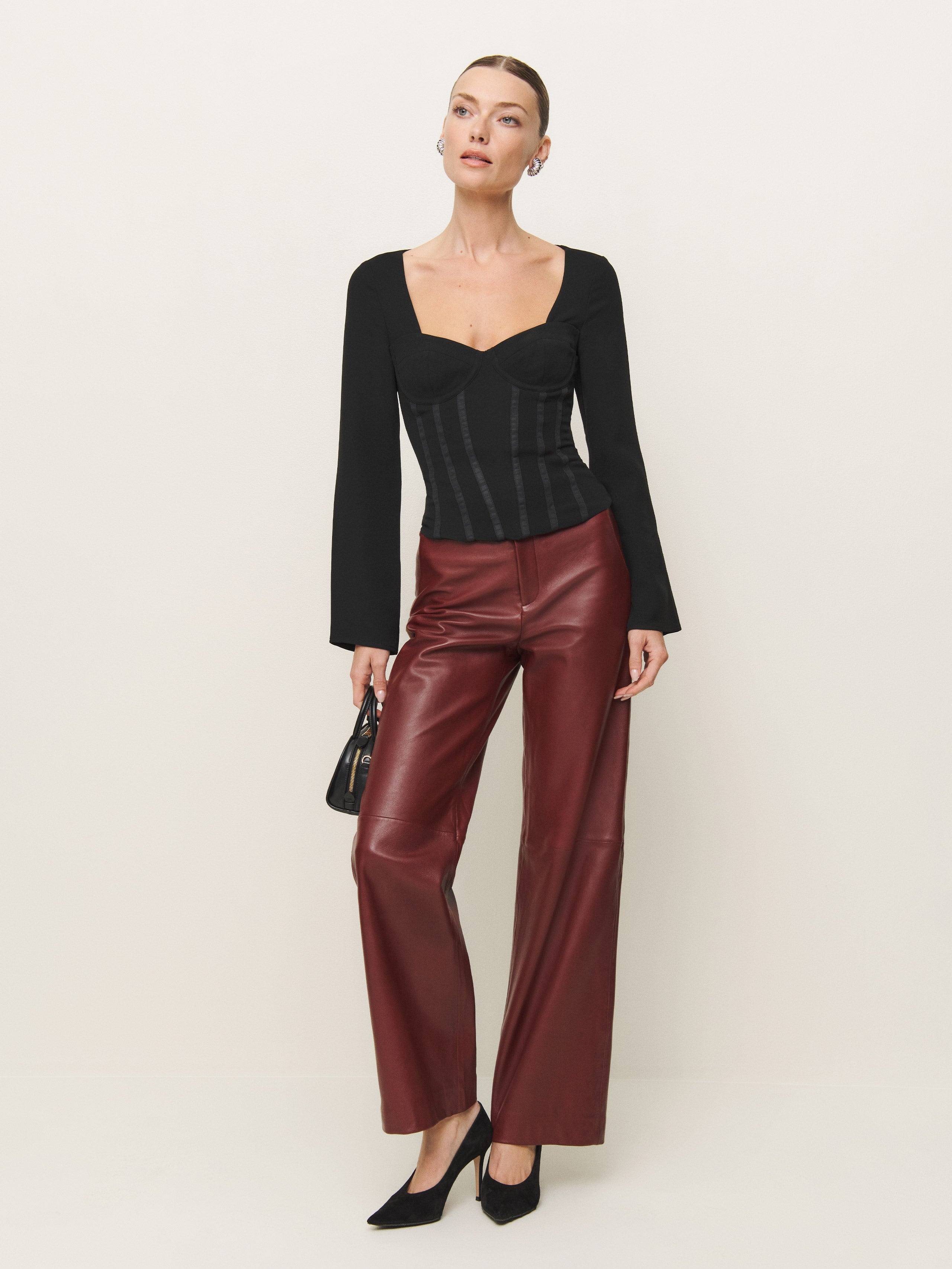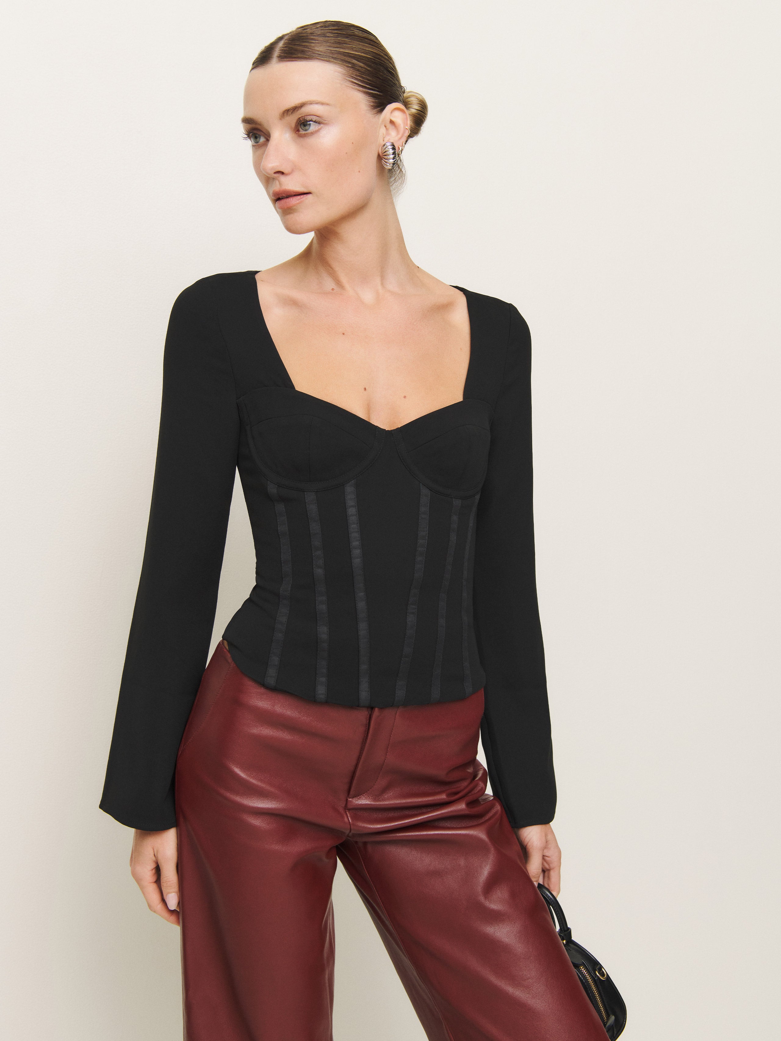 Up top. Shop the Amina Top from Reformation, a long sleeve top with a sweetheart neckline, bust cup detailing, and boning throughout the bodice.