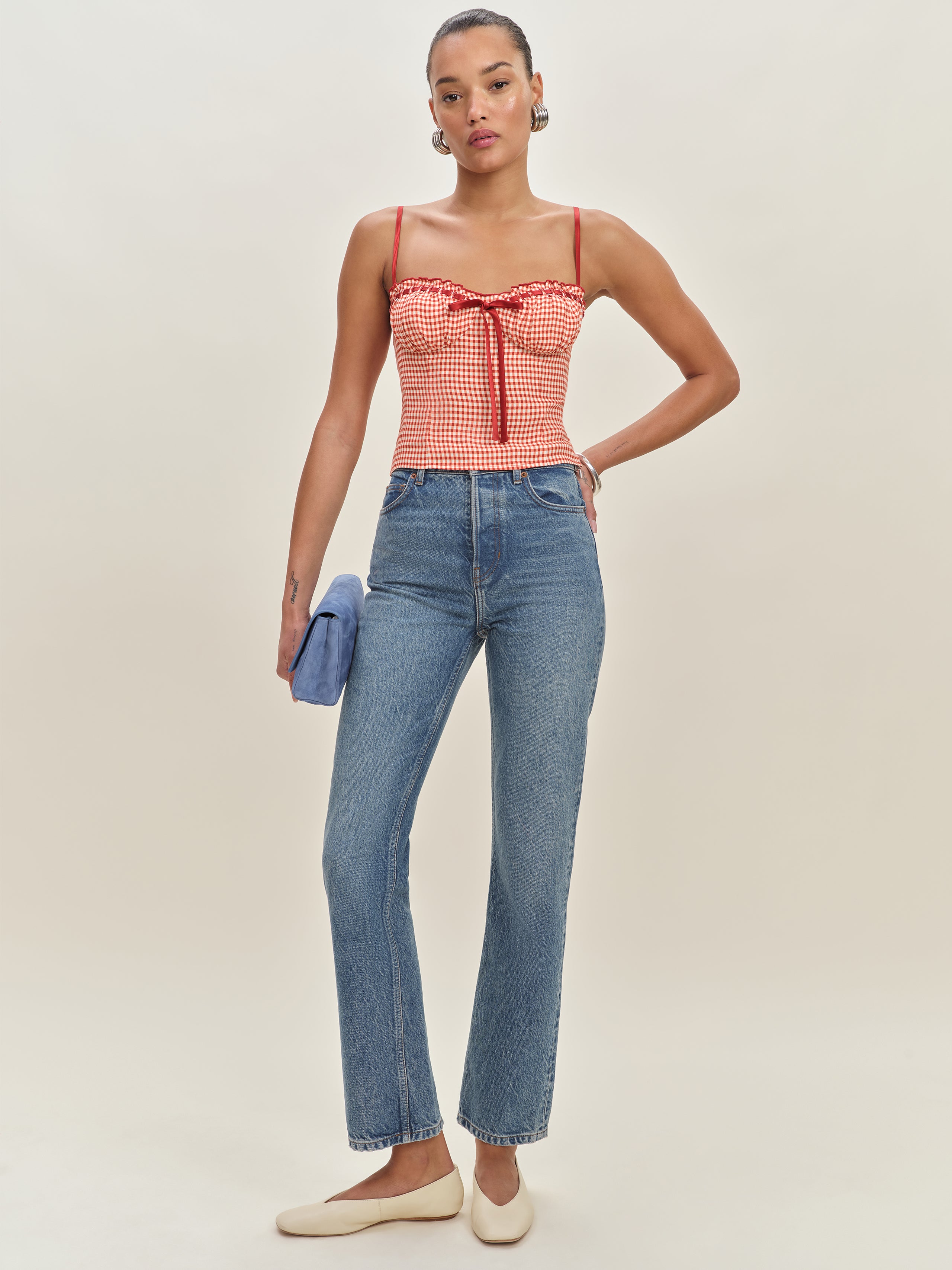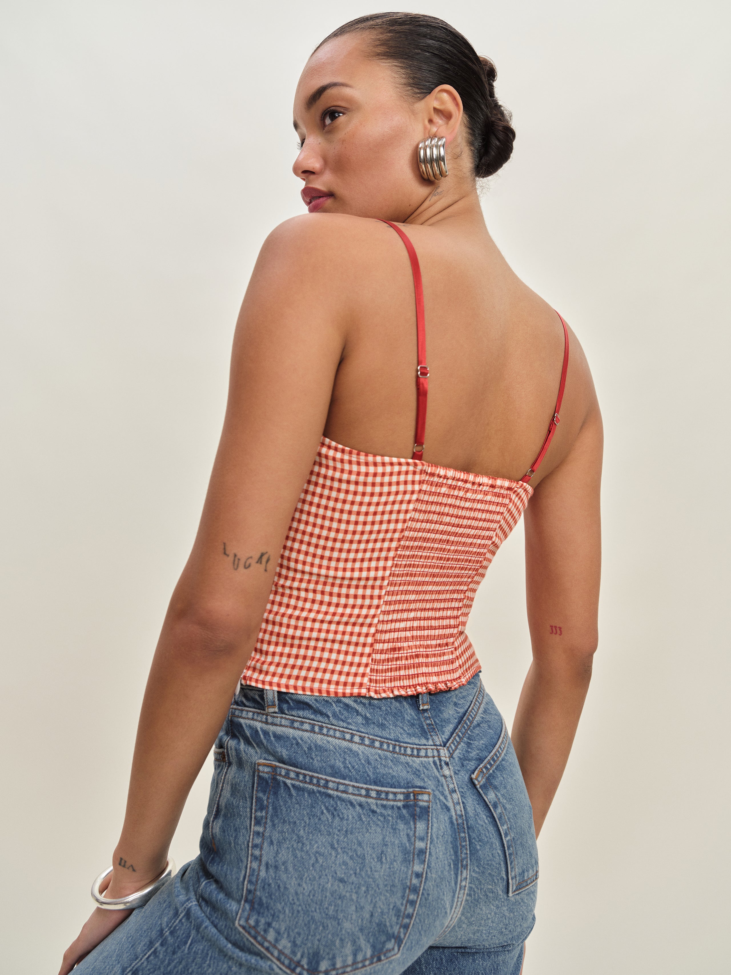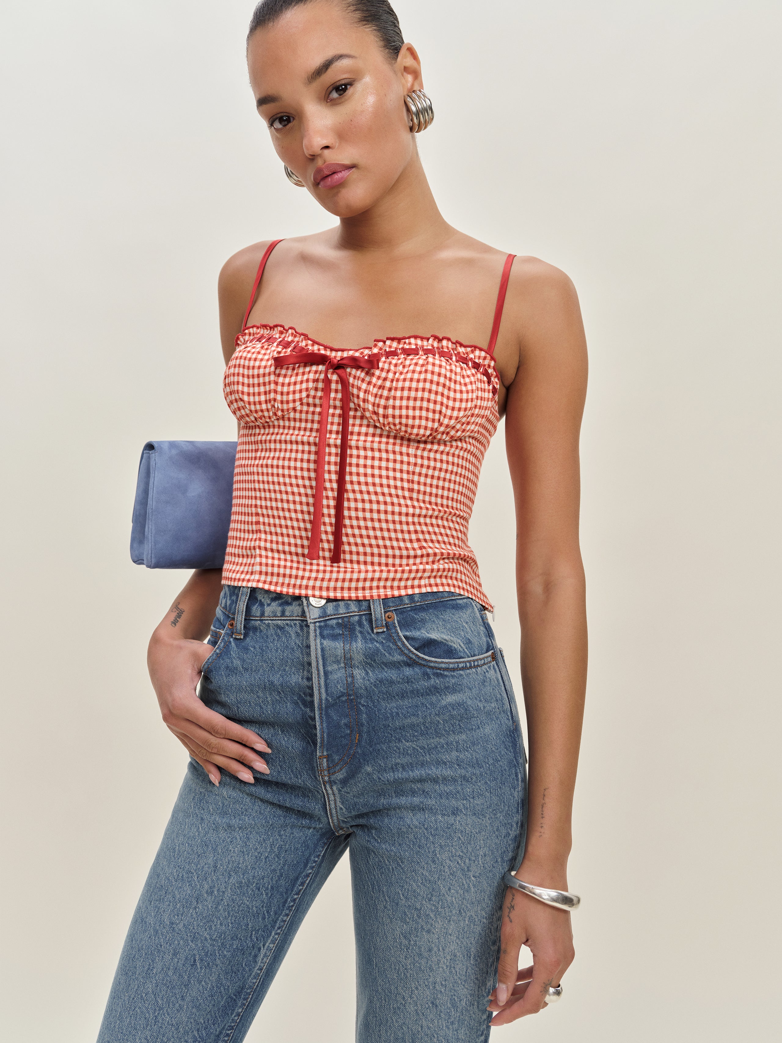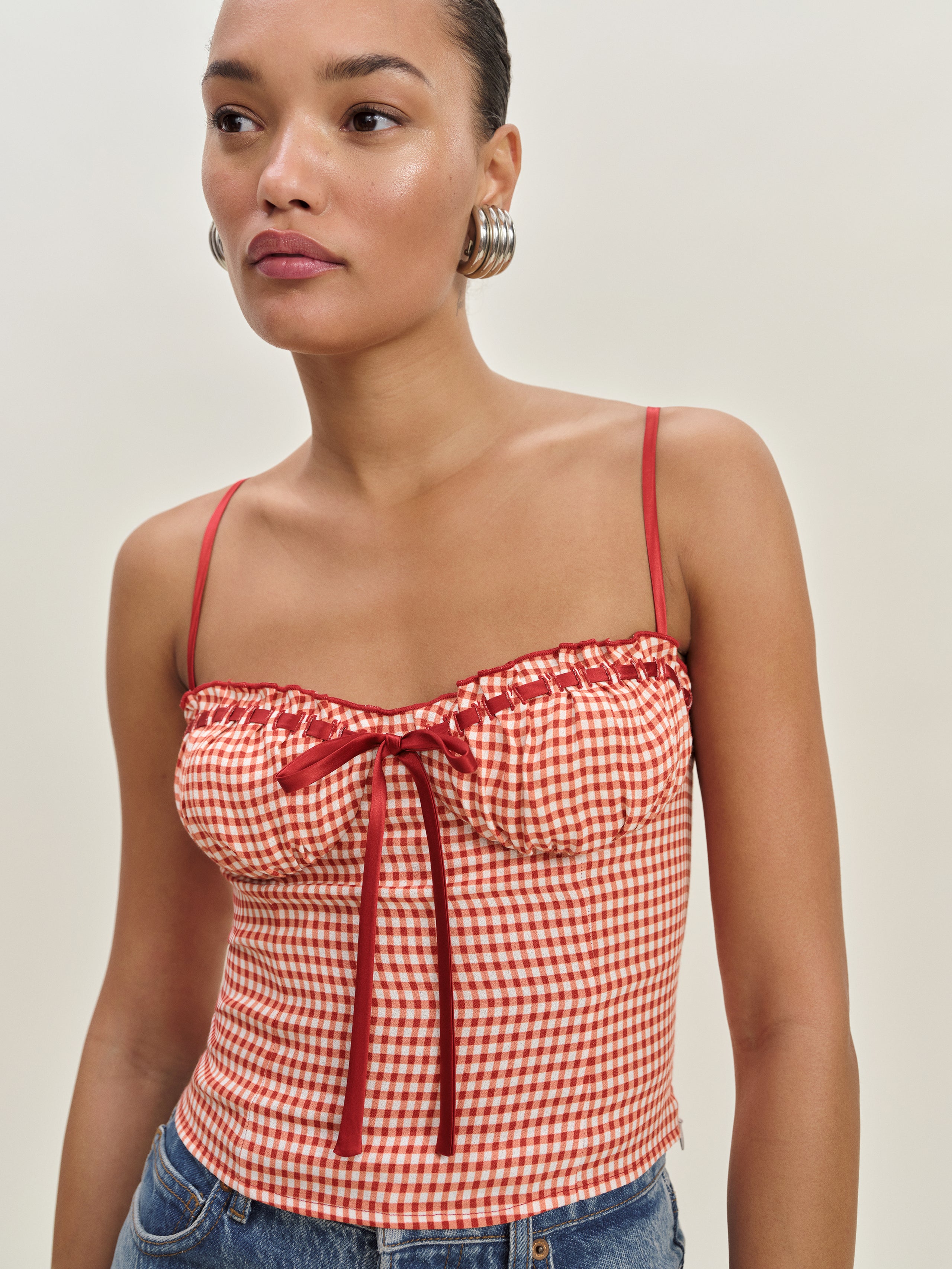 Shop the Andrea Top from Reformation, a sleeveless top with a sweetheart neckline, ruching at the neckline, and an adjustable tie.