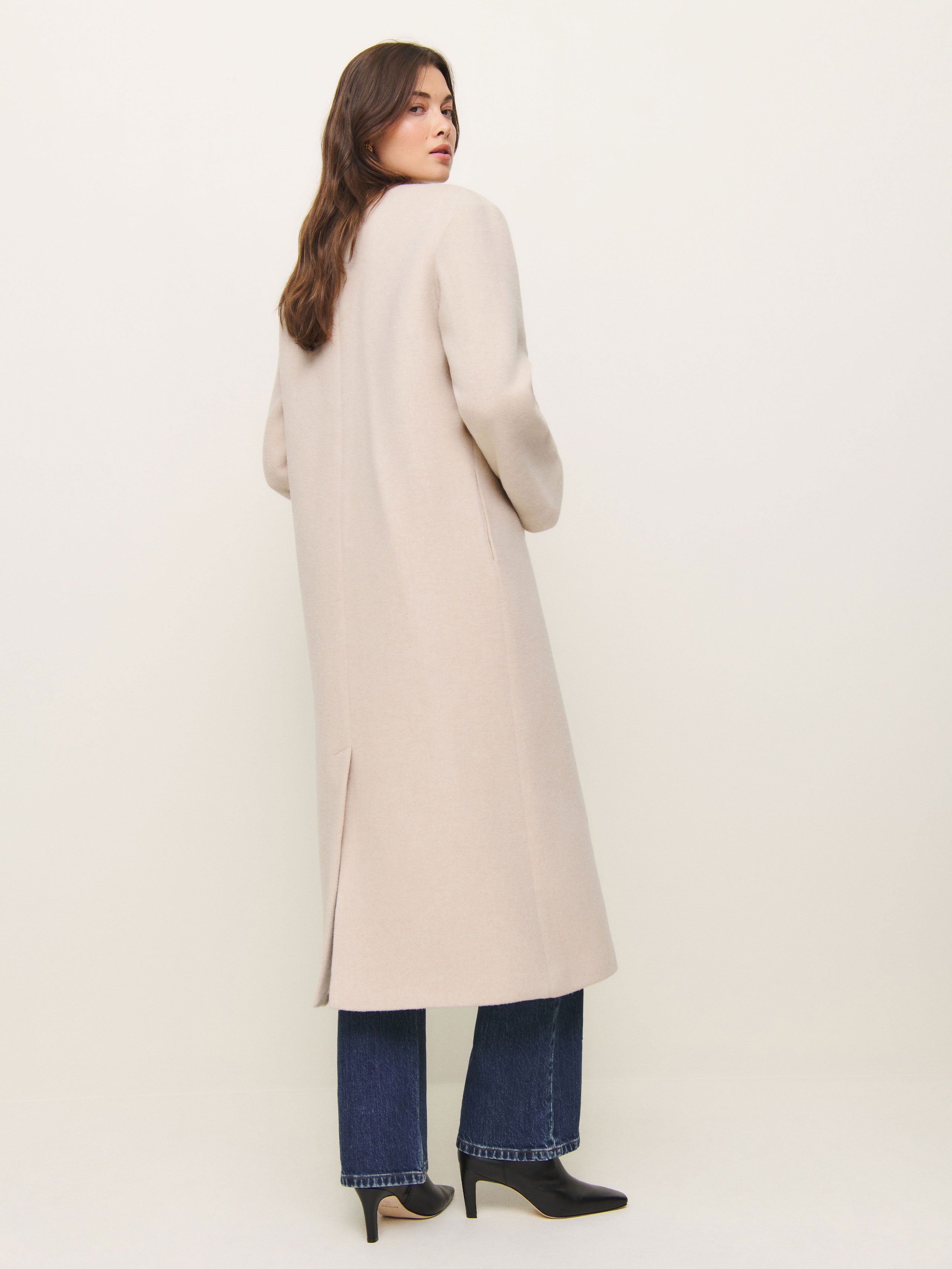 Cozy up. Shop the Asher Coat from Reformation, a full-length, collarless coat with a detachable neck scarf.