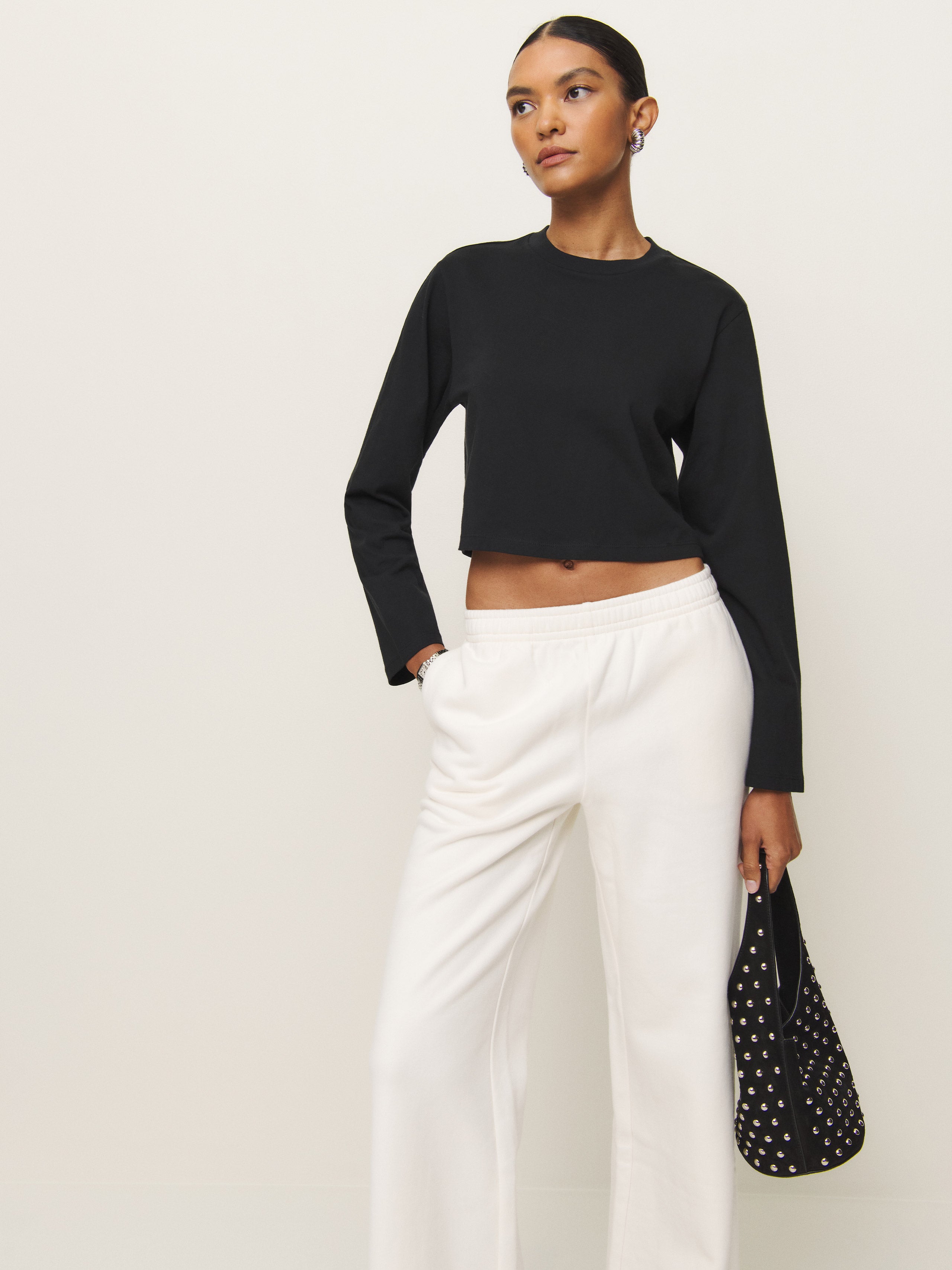 Shop the Asher Cropped Oversized Longsleeve Tee from Reformation, a cropped sweatshirt with a relaxed fit and crew neckline.