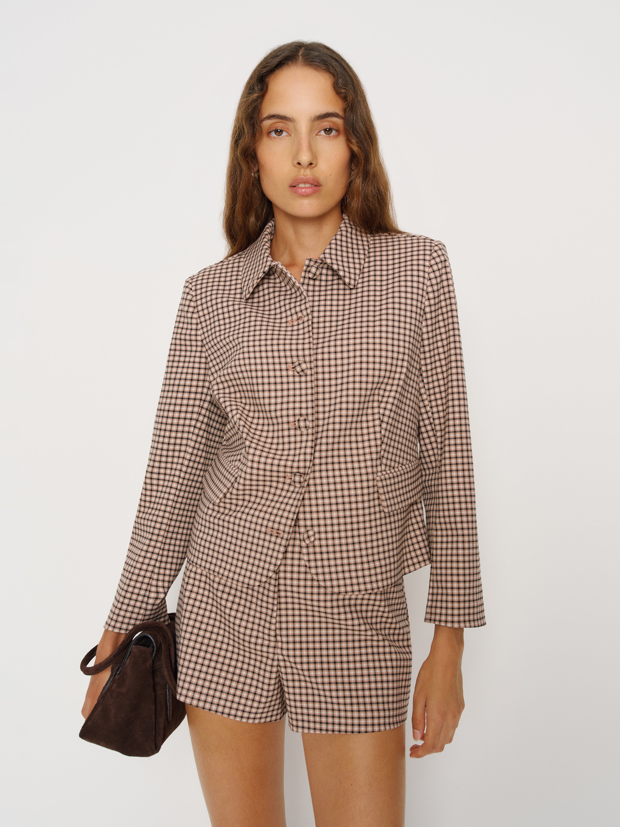 Get some compliments. Shop the Ashton Two Piece from Reformation, a long-sleeved collared top with a functional button front and matching shorts.