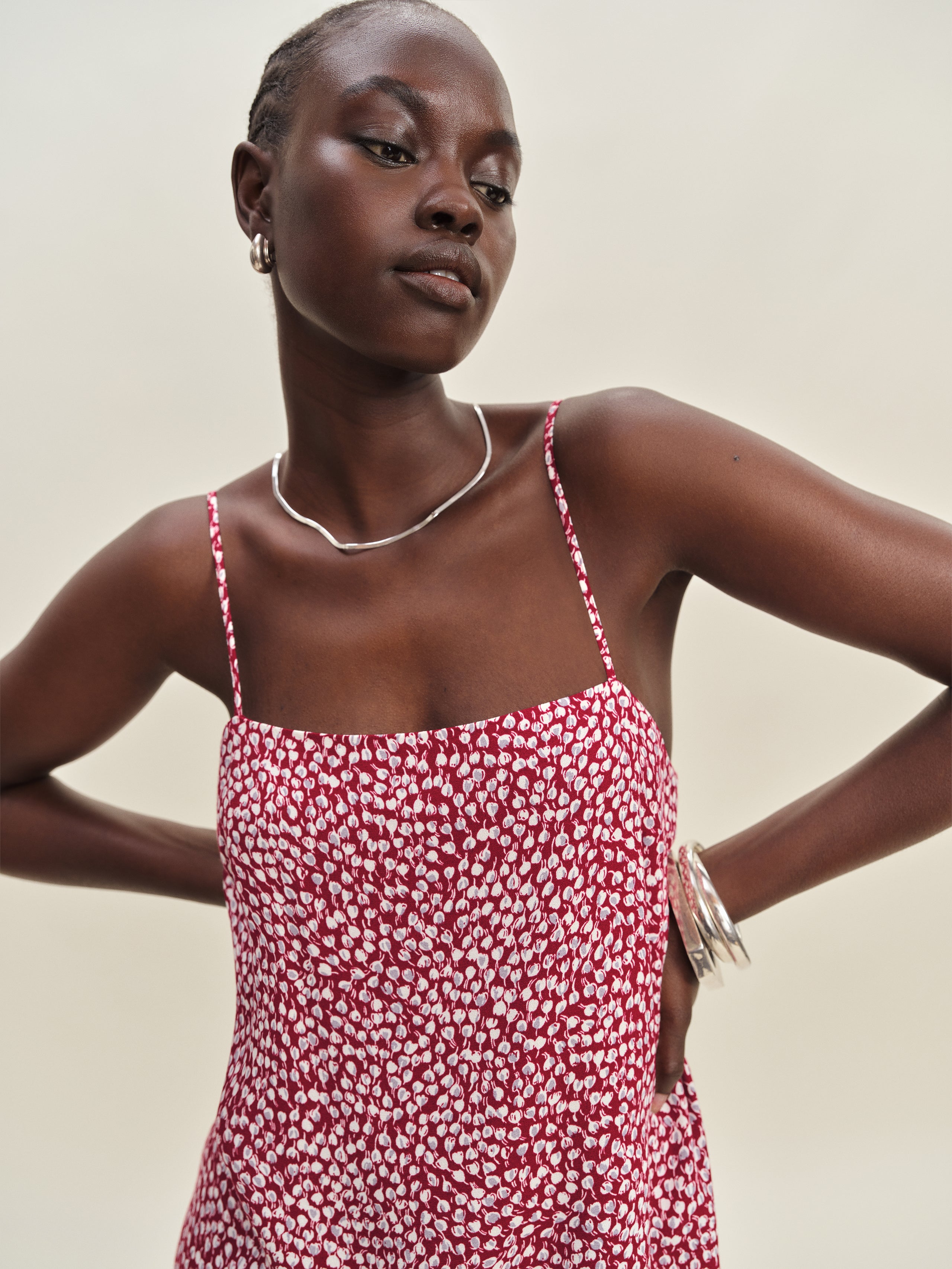 Shop the Aubree Dress from Reformation, a sleeveless mini dress with a square neckline.