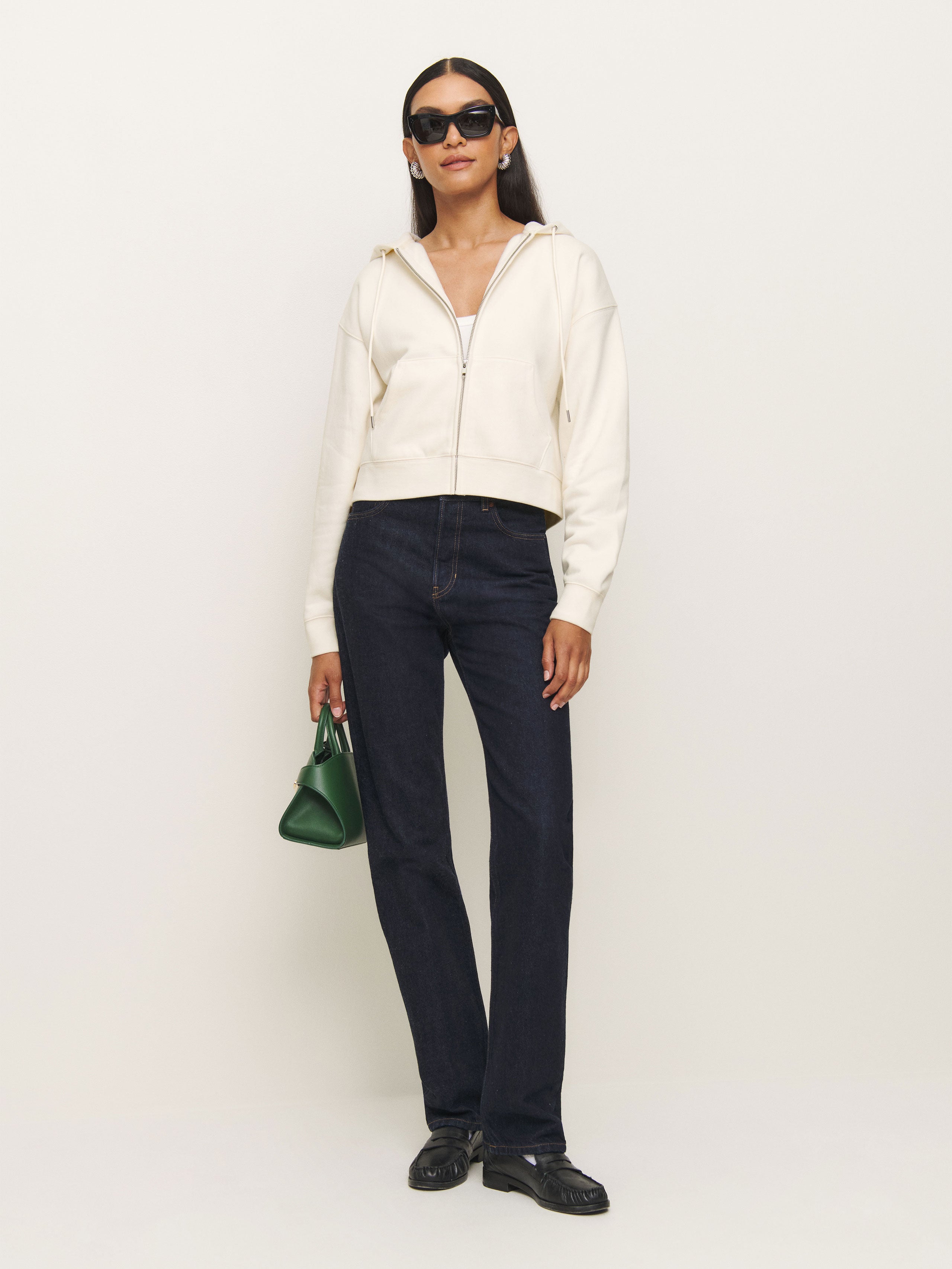 Shop the Austin Zip Up Hoodie from Reformation, a cropped sweatshirt with a zipper and hood.