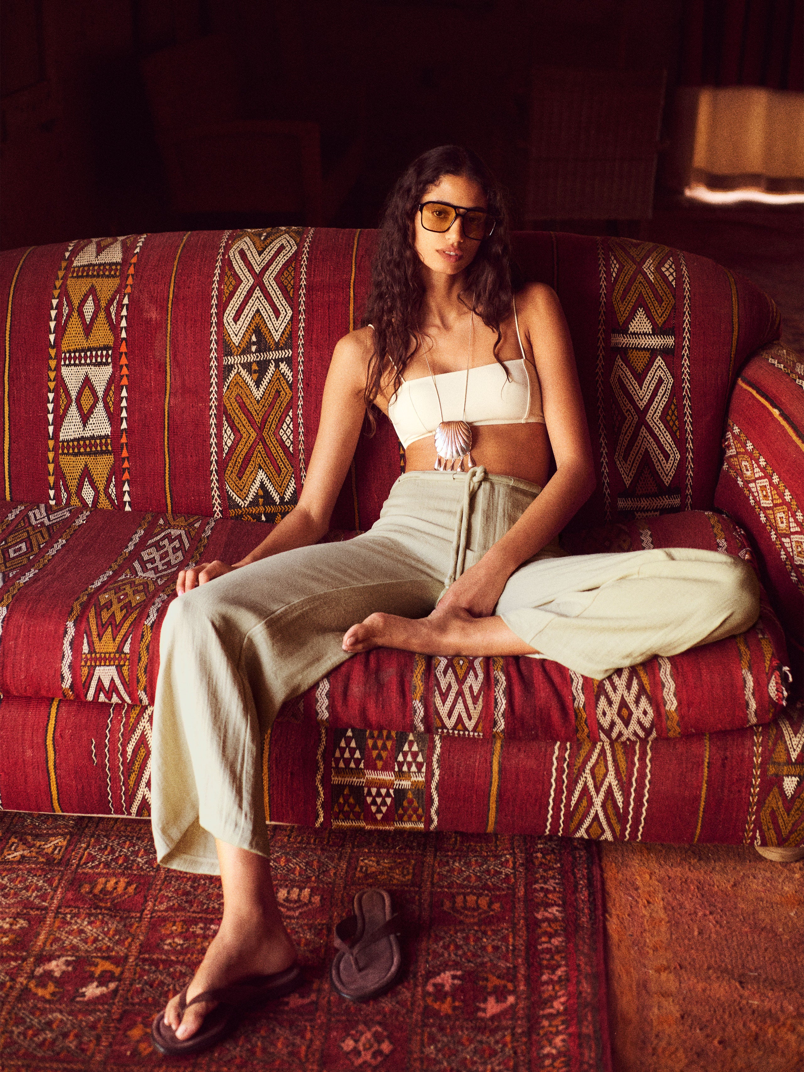 Shop the Avery Pant from Reformation, a high rise pant with a wide leg and adjustable tie waist.