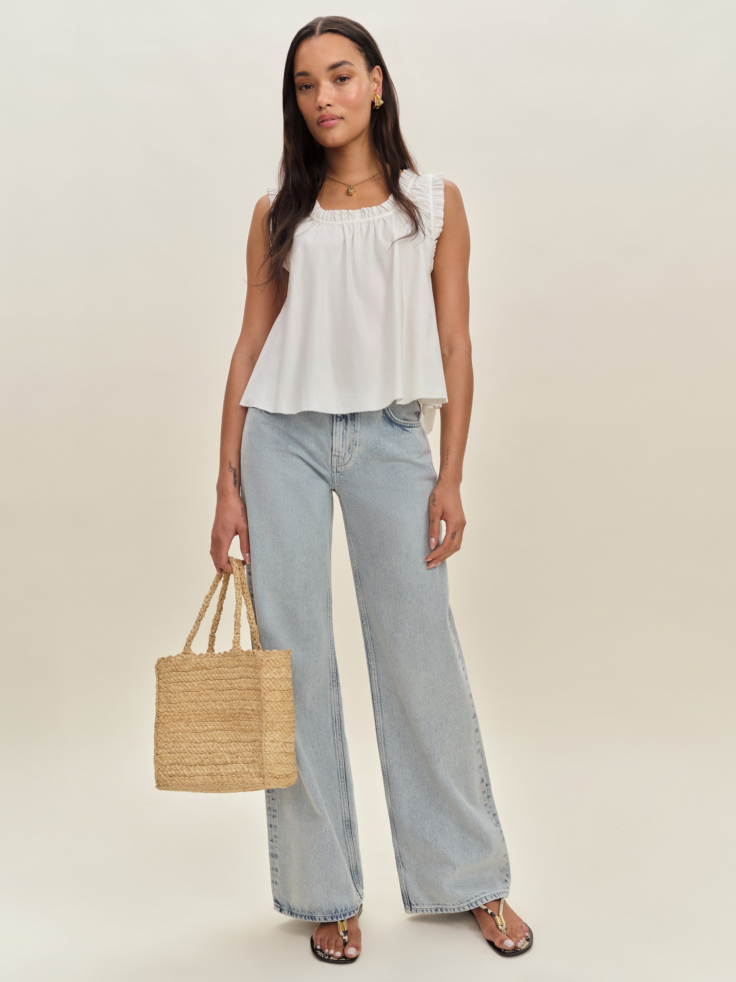 Up top. Shop the Aviana Top from Reformation, a sleeveless top with ruching at the neckline and straps.