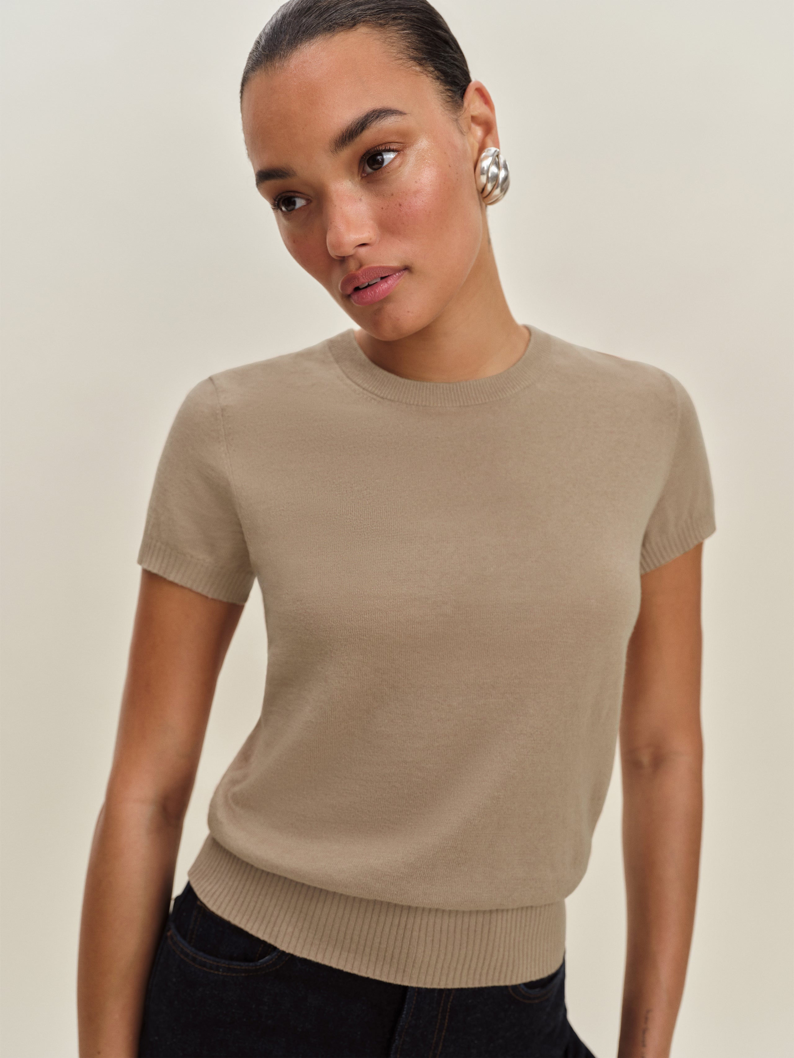 Up top. Shop the Aviva Linen Cotton Crew from Reformation, a short sleeve sweater with a crew neckline and ribbing at the hem, collar, and sleeves.