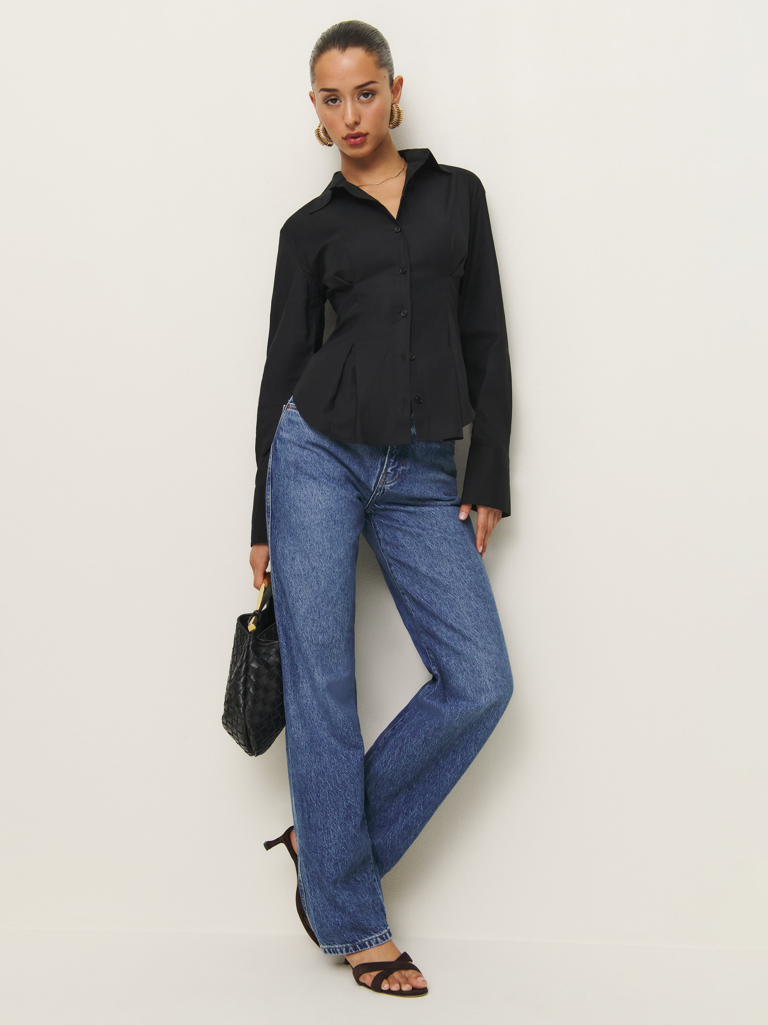 Buttoned up. Shop the Becker Shirt from Reformation, a long-sleeve top with a collared neckline, button front,...