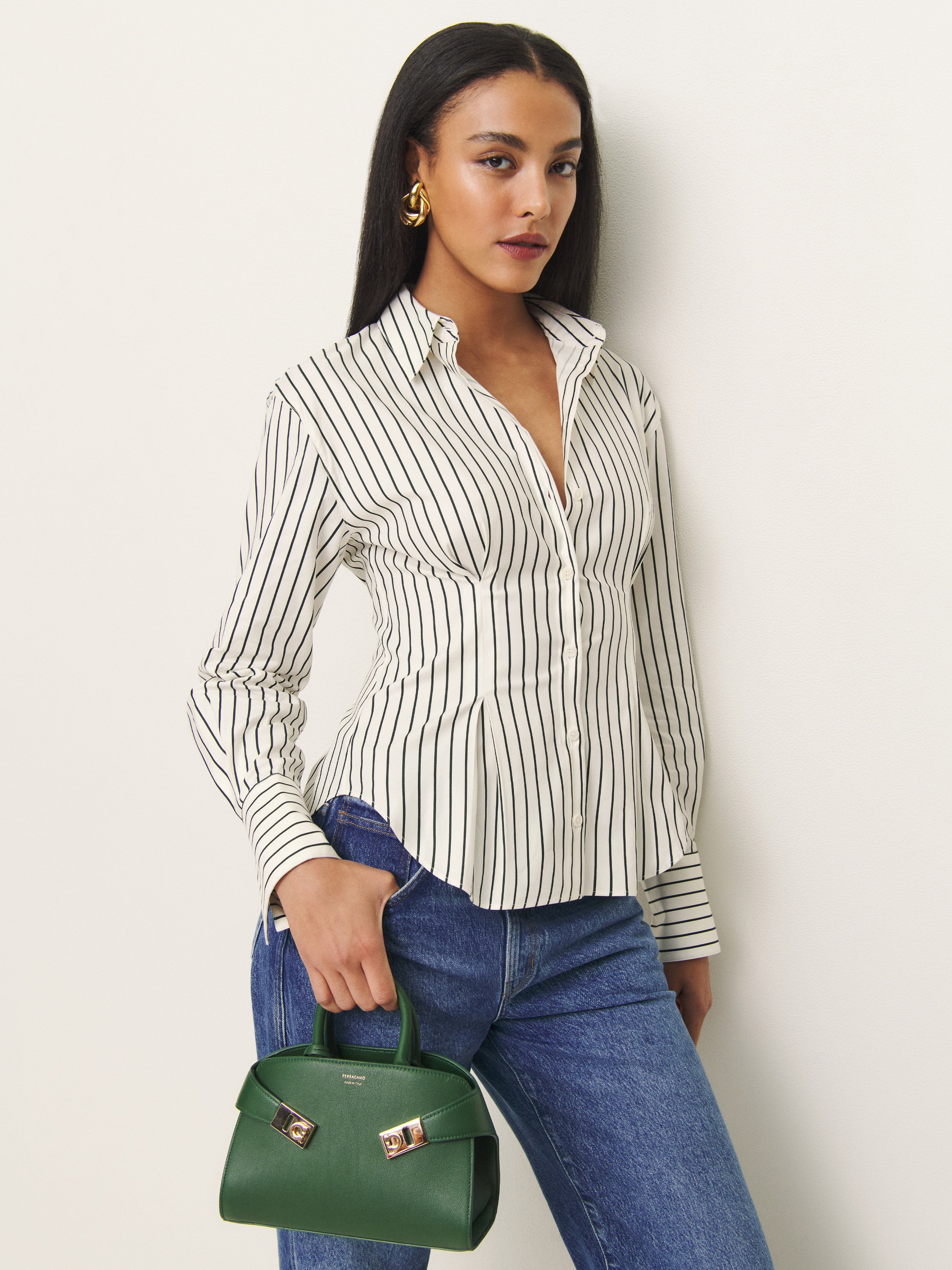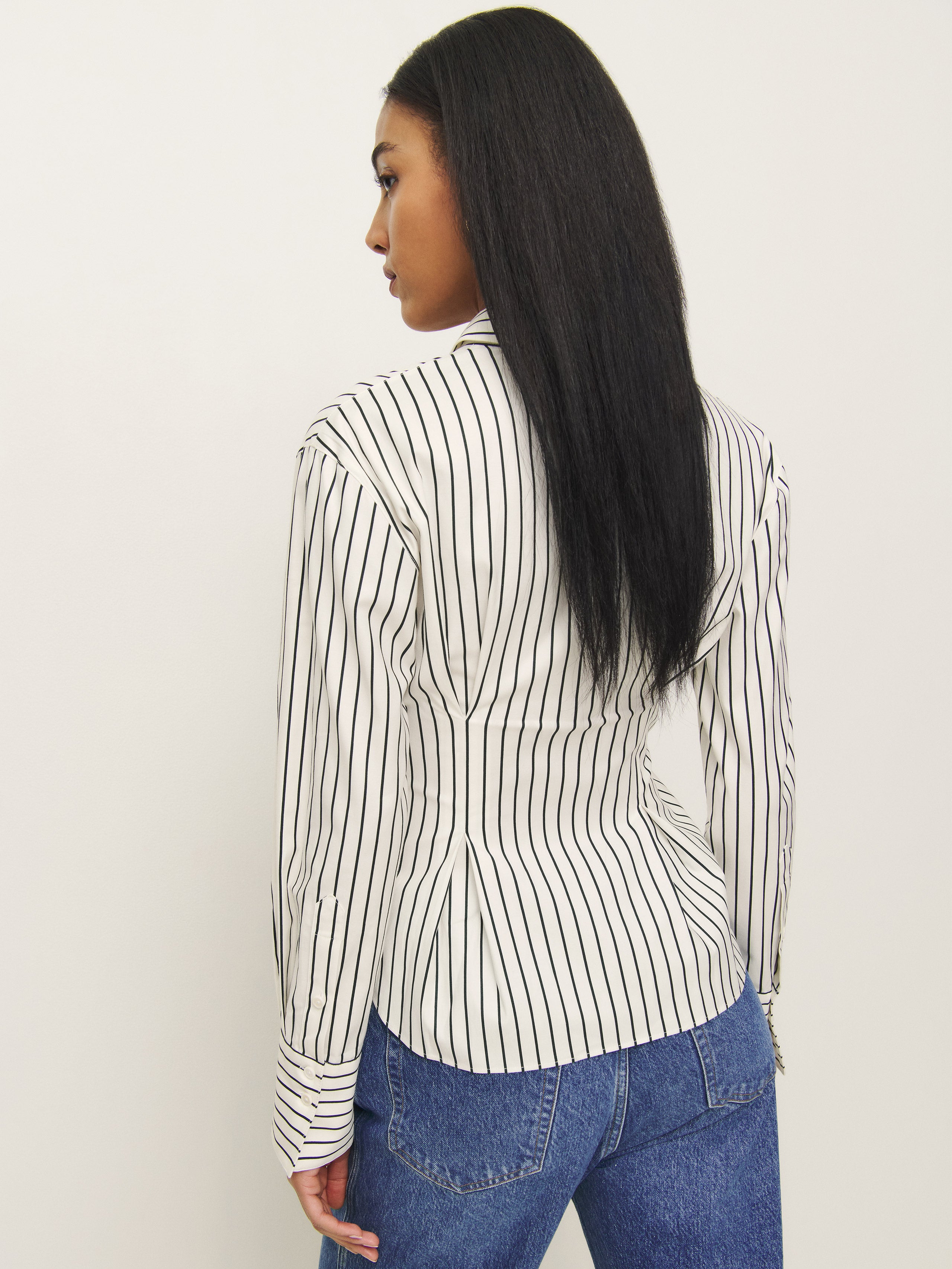 Buttoned up. Shop the Becker Shirt from Reformation, a long-sleeve top with a collared neckline, button front,...