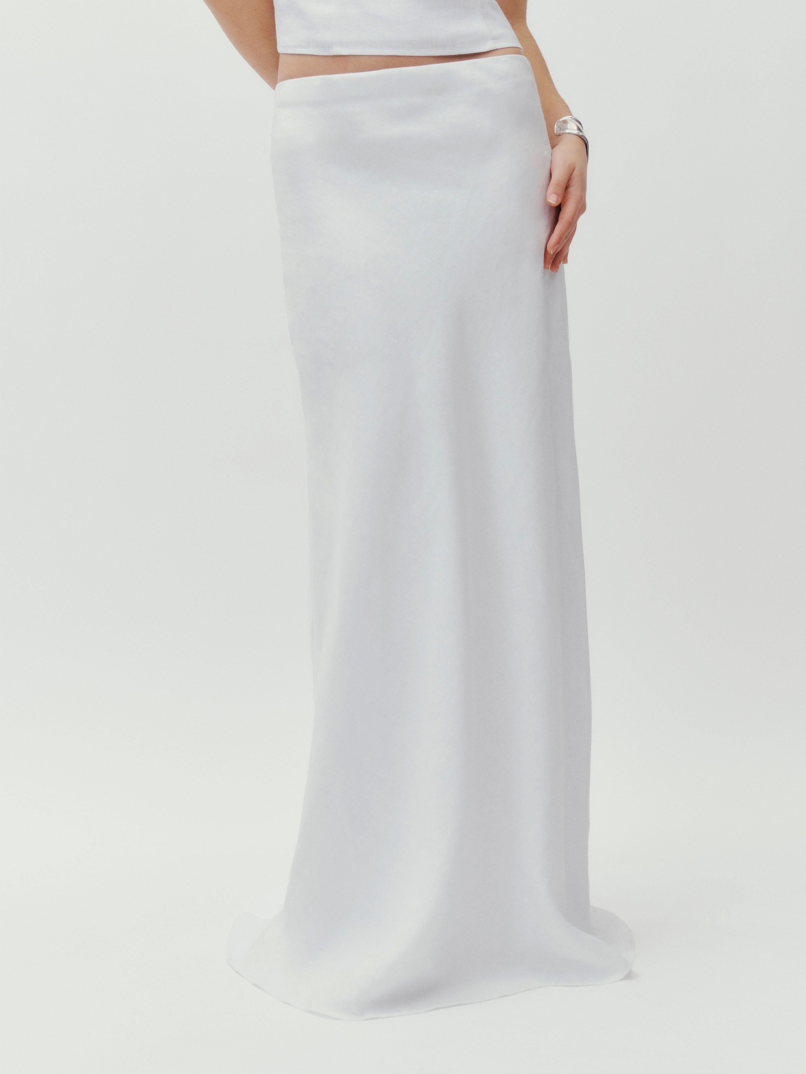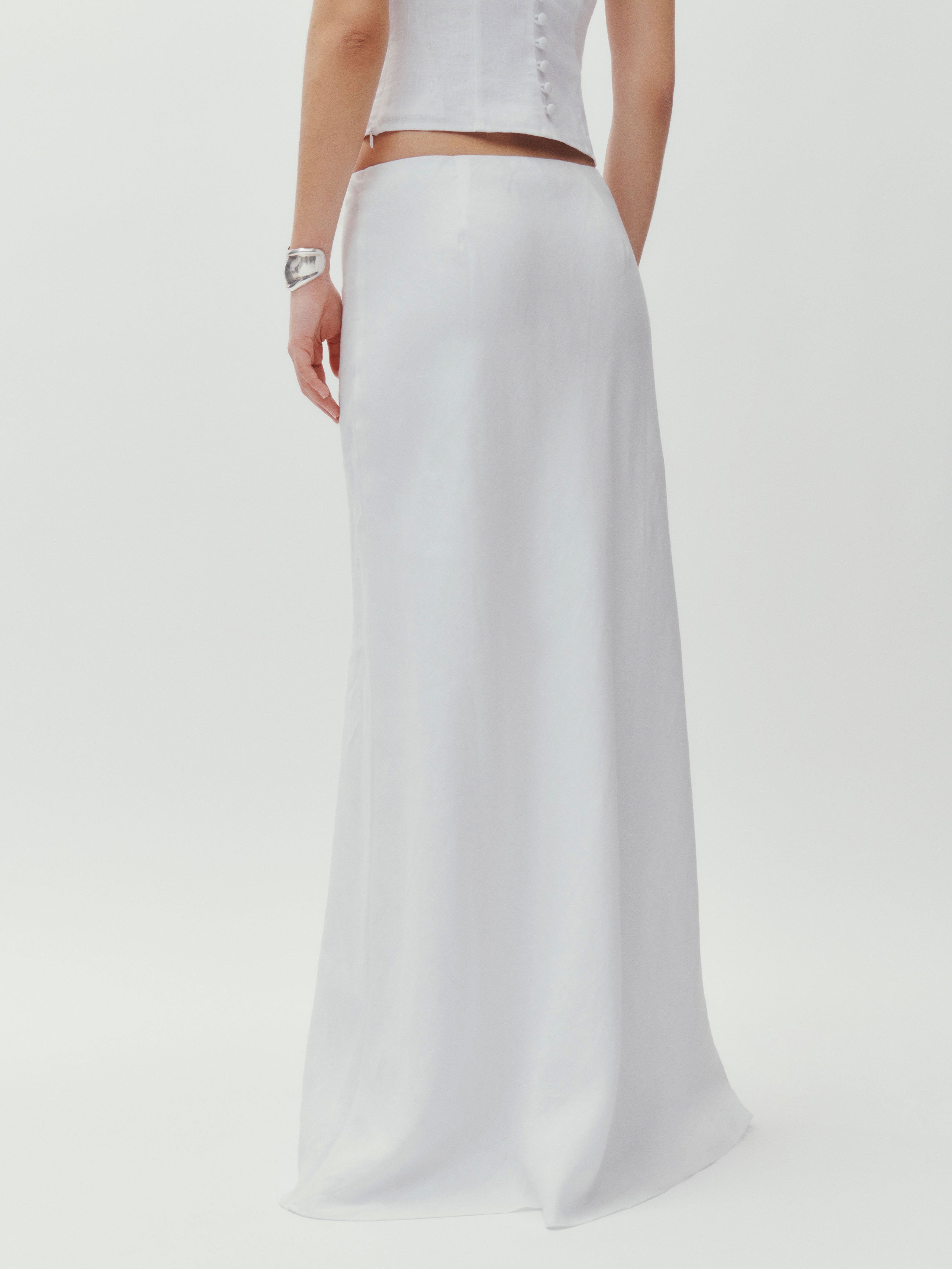 Let your skirt do the talking. Shop the Bella Linen Skirt from Reformation, a bias cut maxi skirt with an elasticated waist.