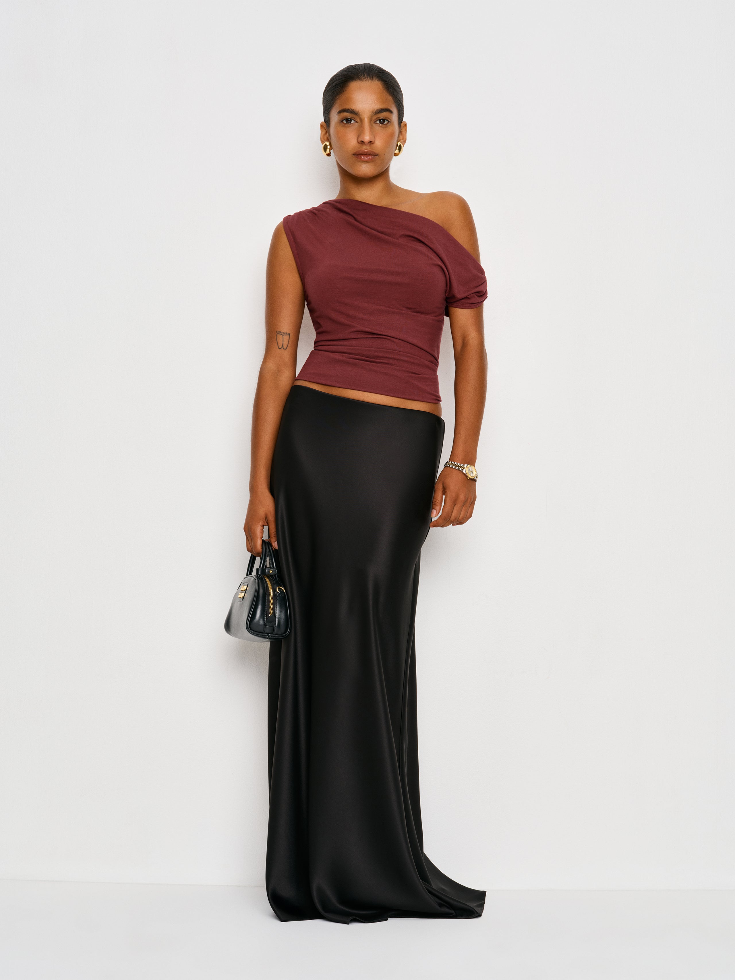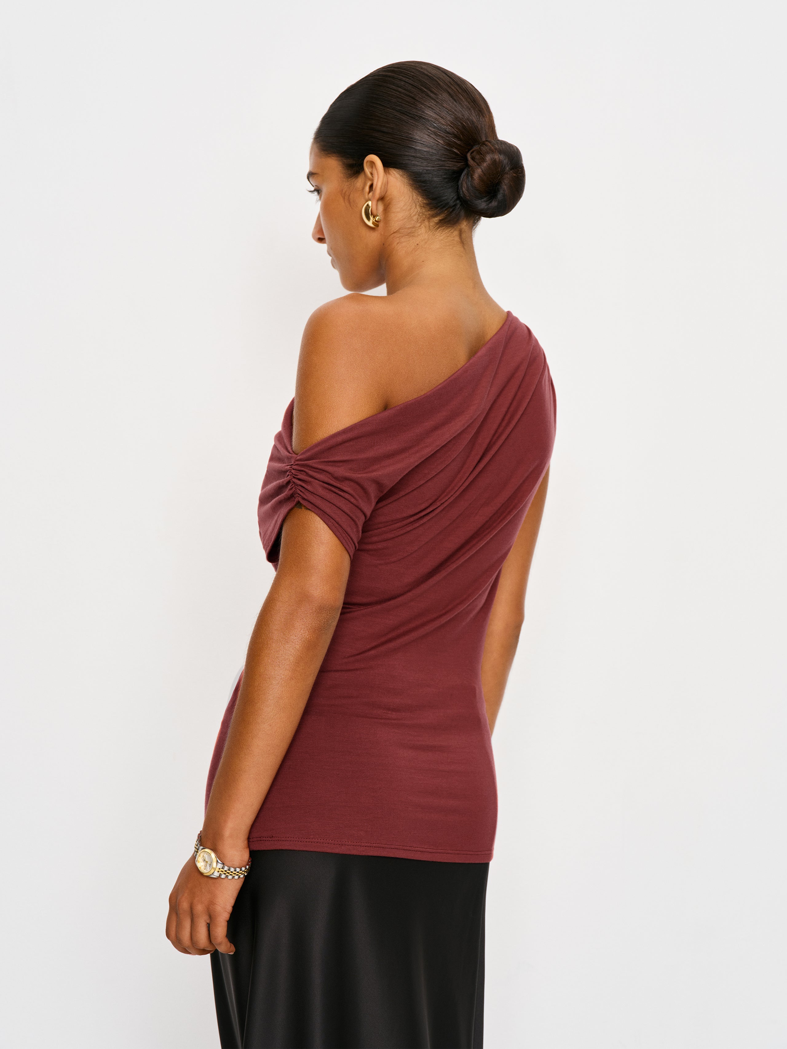You flirt. Shop the Belle Knit Top from Reformation, an off-the-shoulder, asymmetrical top with ruching throughout.