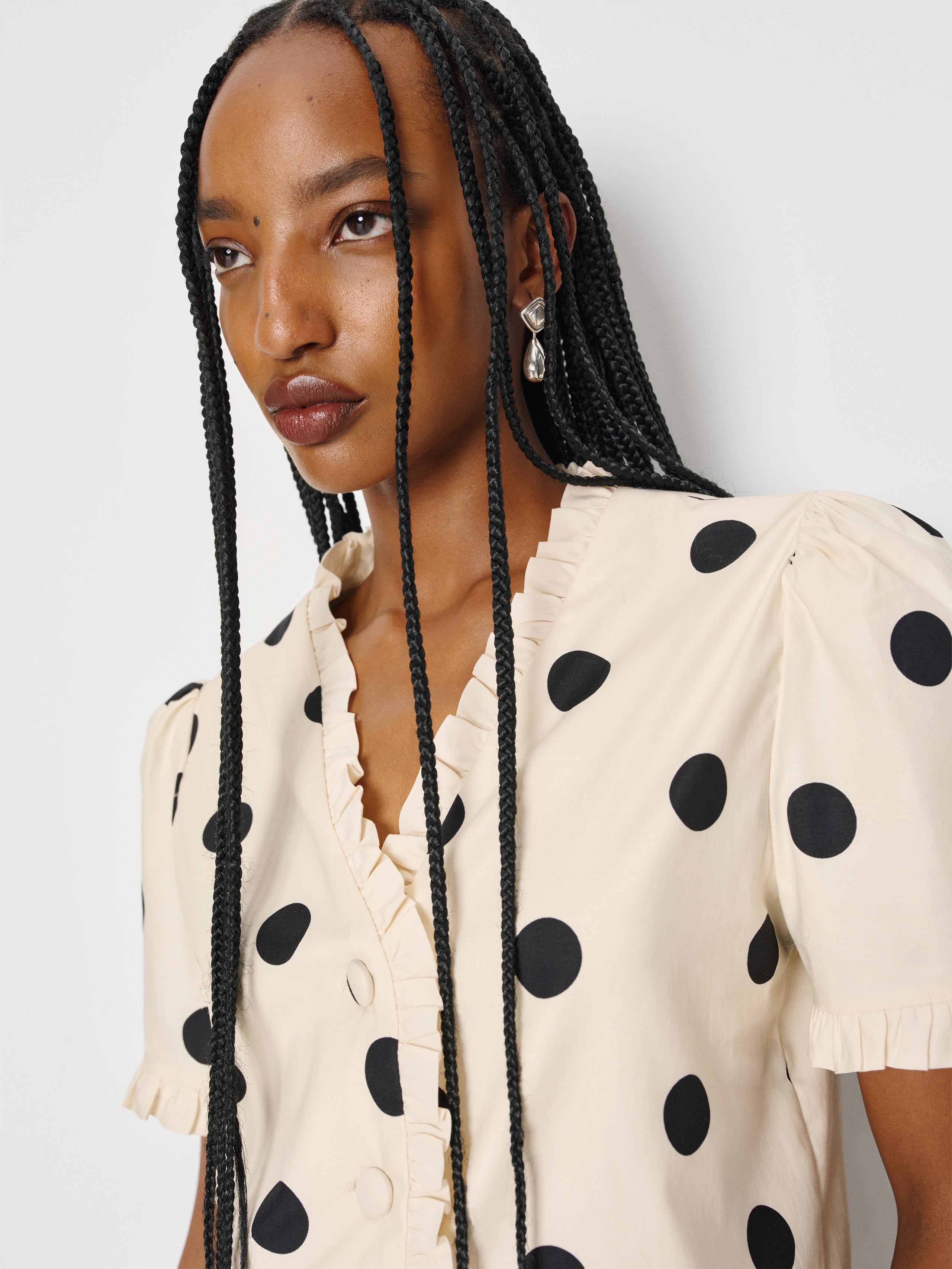 Up top. Shop the Bess Top from Reformation, a short-sleeve top with a high V-neckline, button front,...