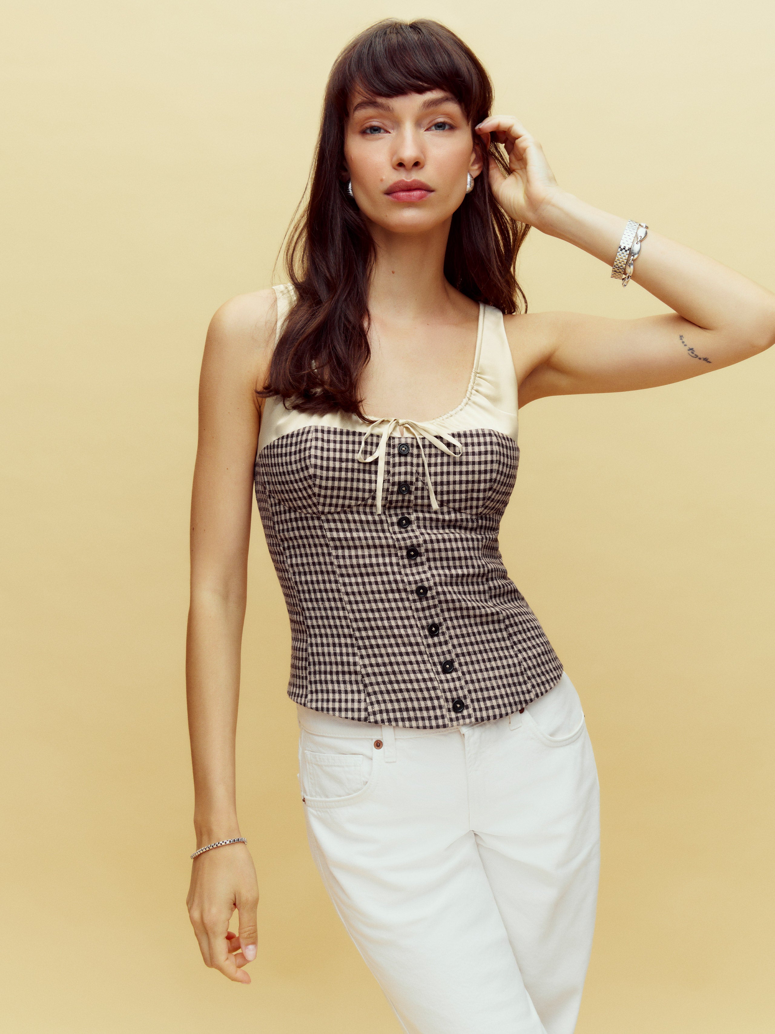 Up top. Shop the Beverly Top from Reformation, a sleeveless top with a scoop neckline, button front,...