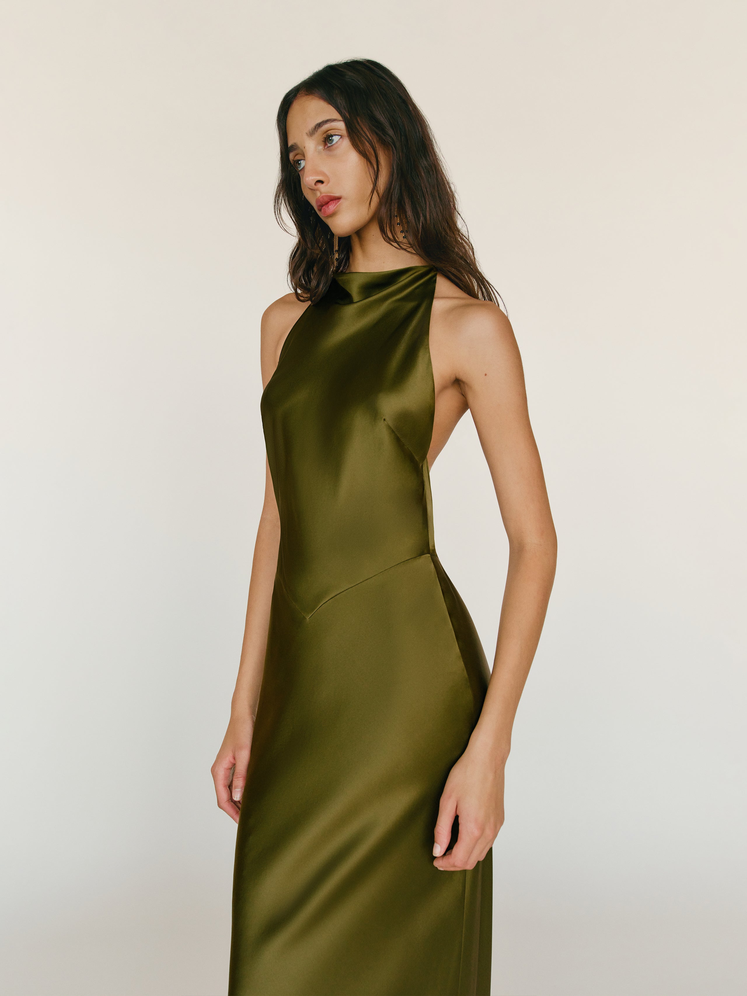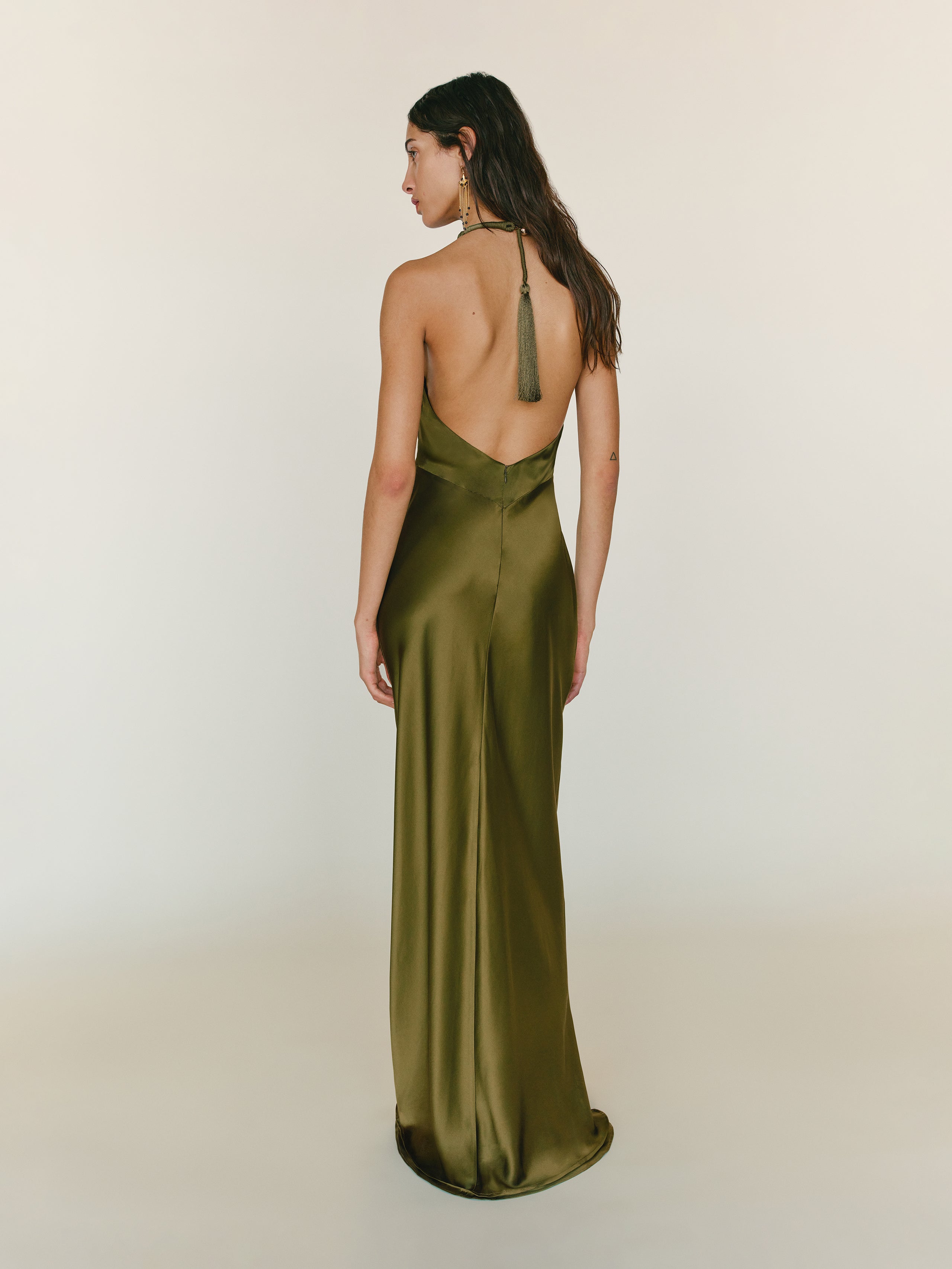 On my way. Shop the Bianca Silk Dress from Reformation, a dress with a high neckline and an open-back with a tassel detail. Engineered for getting compliments.