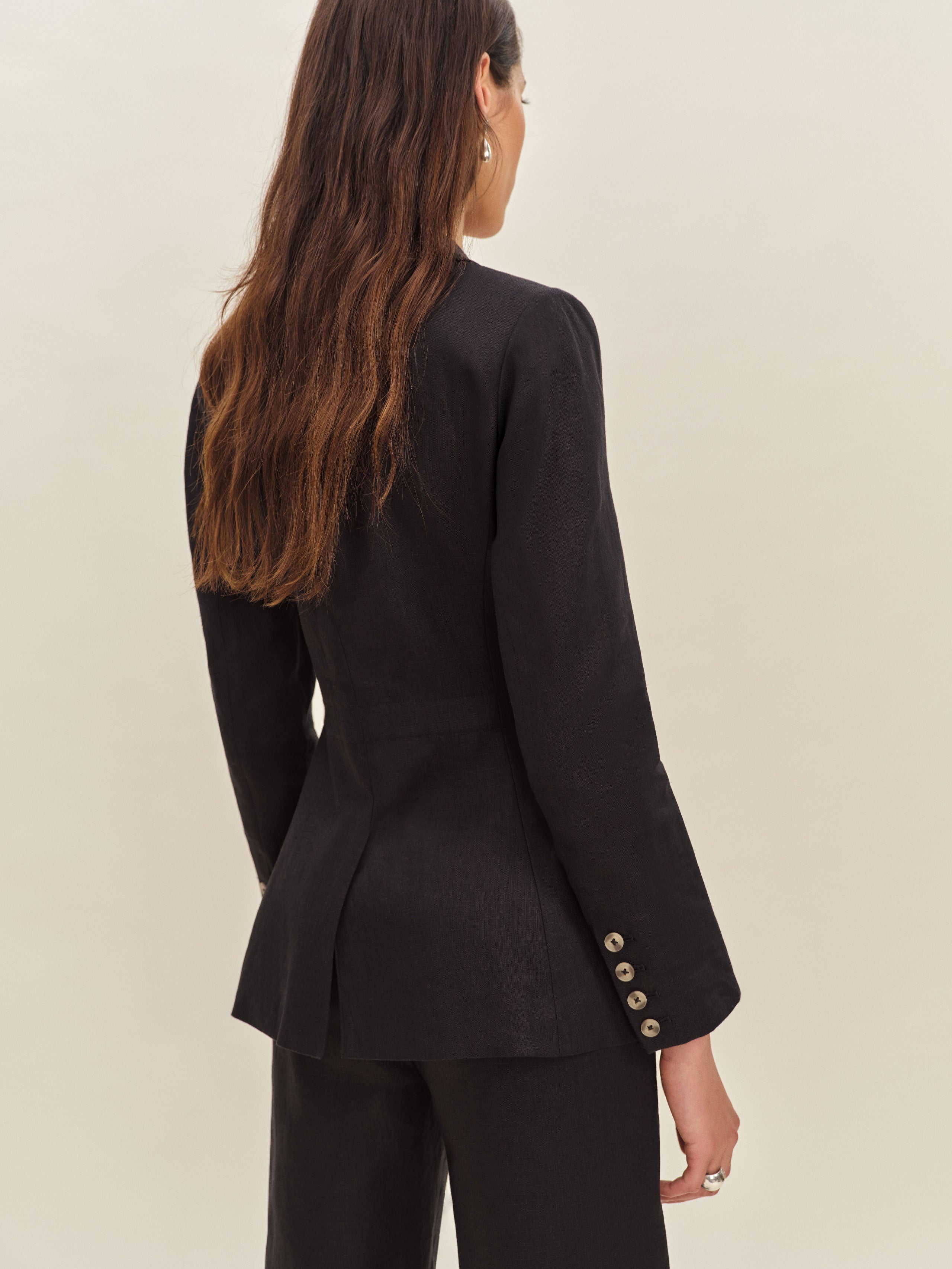 Layer up. Shop the Bondi Linen Blazer from Reformation, a slim fitting blazer with a collared neckline and button front.