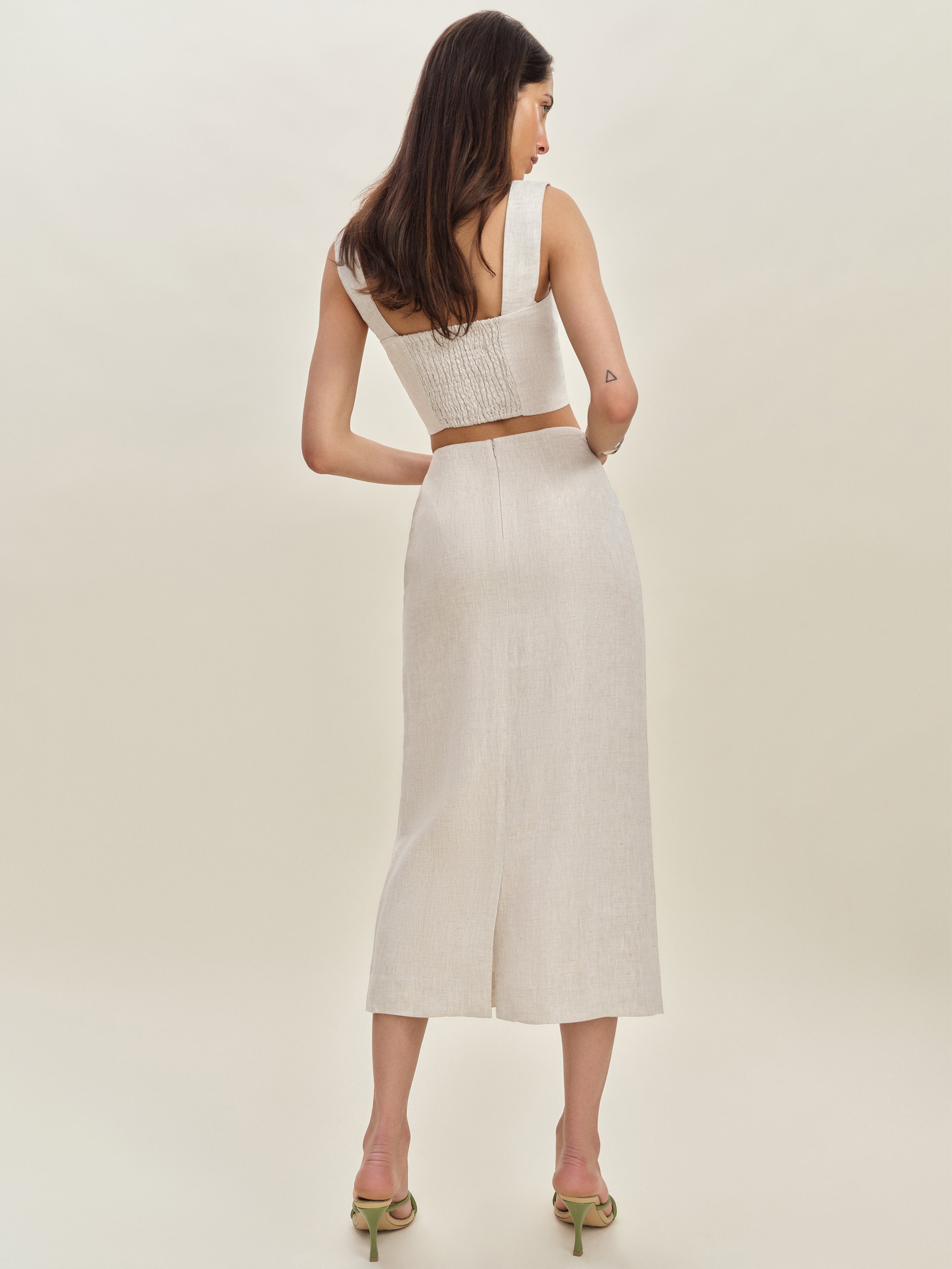 Wear the skirt. Shop the Britt Linen Skirt from Reformation, a high rise maxi skirt with an...