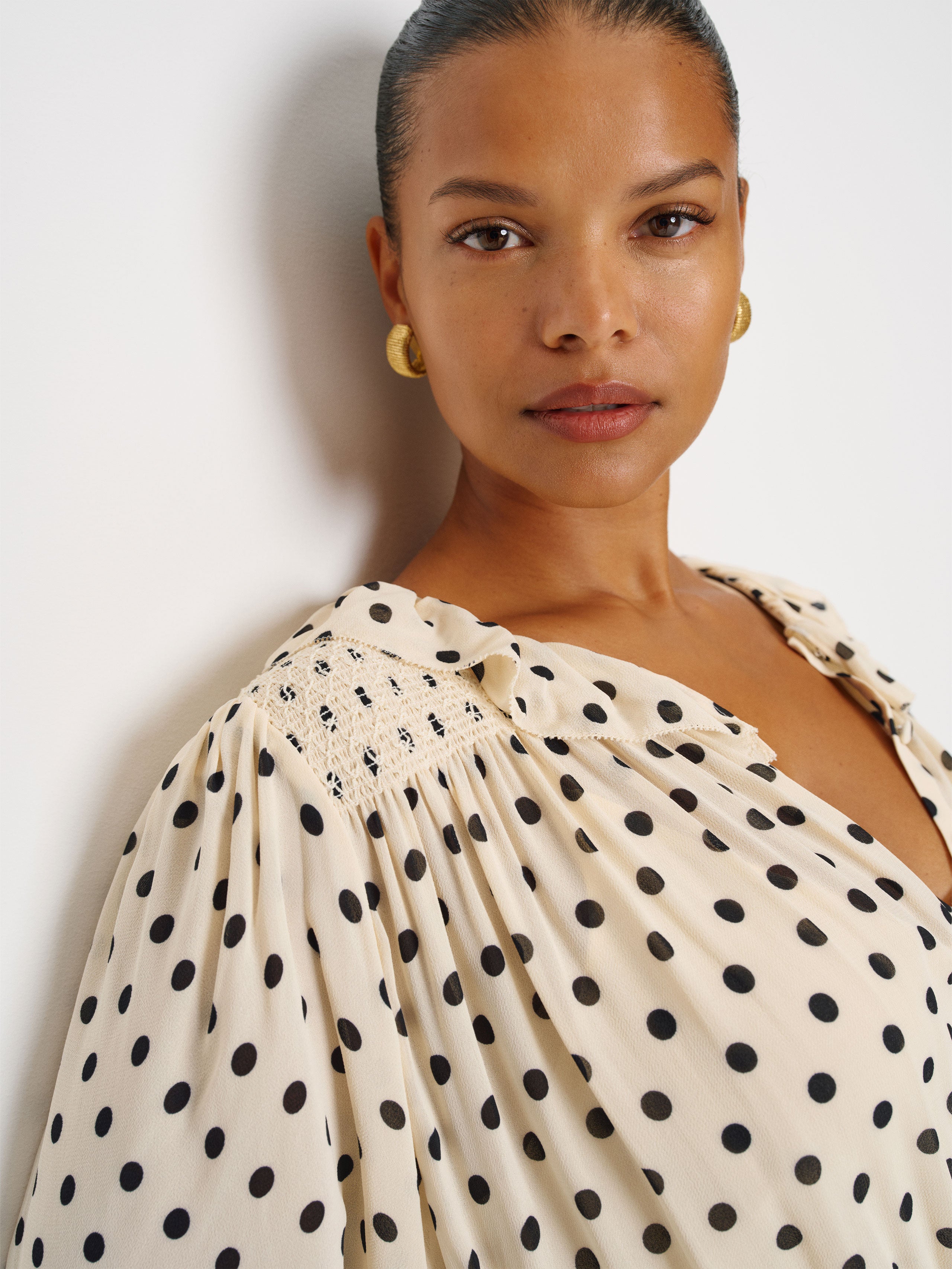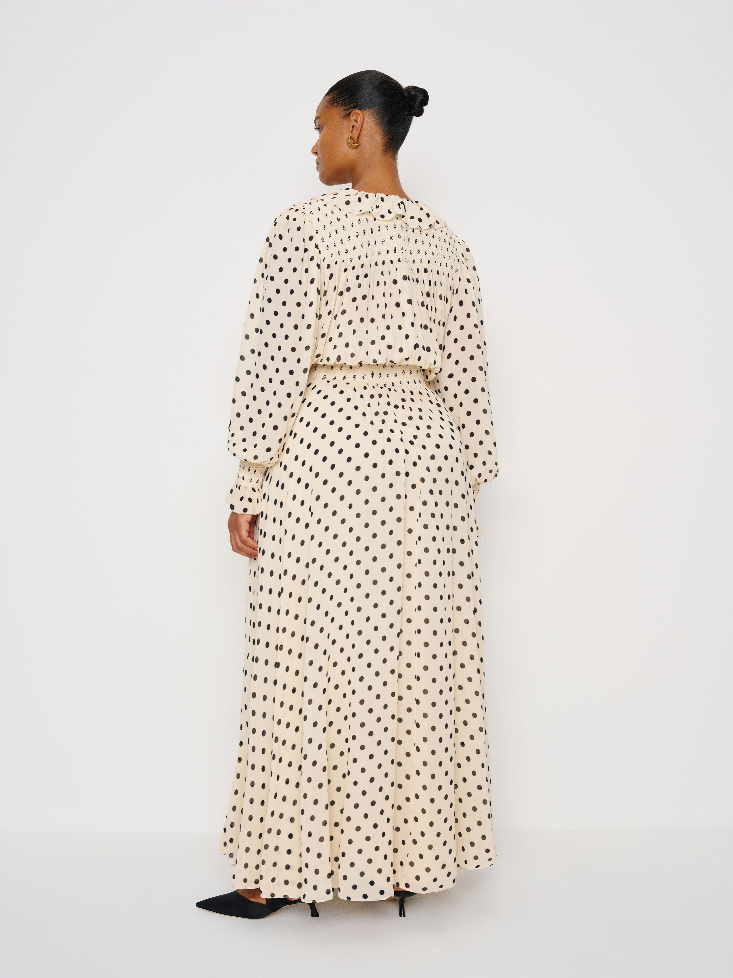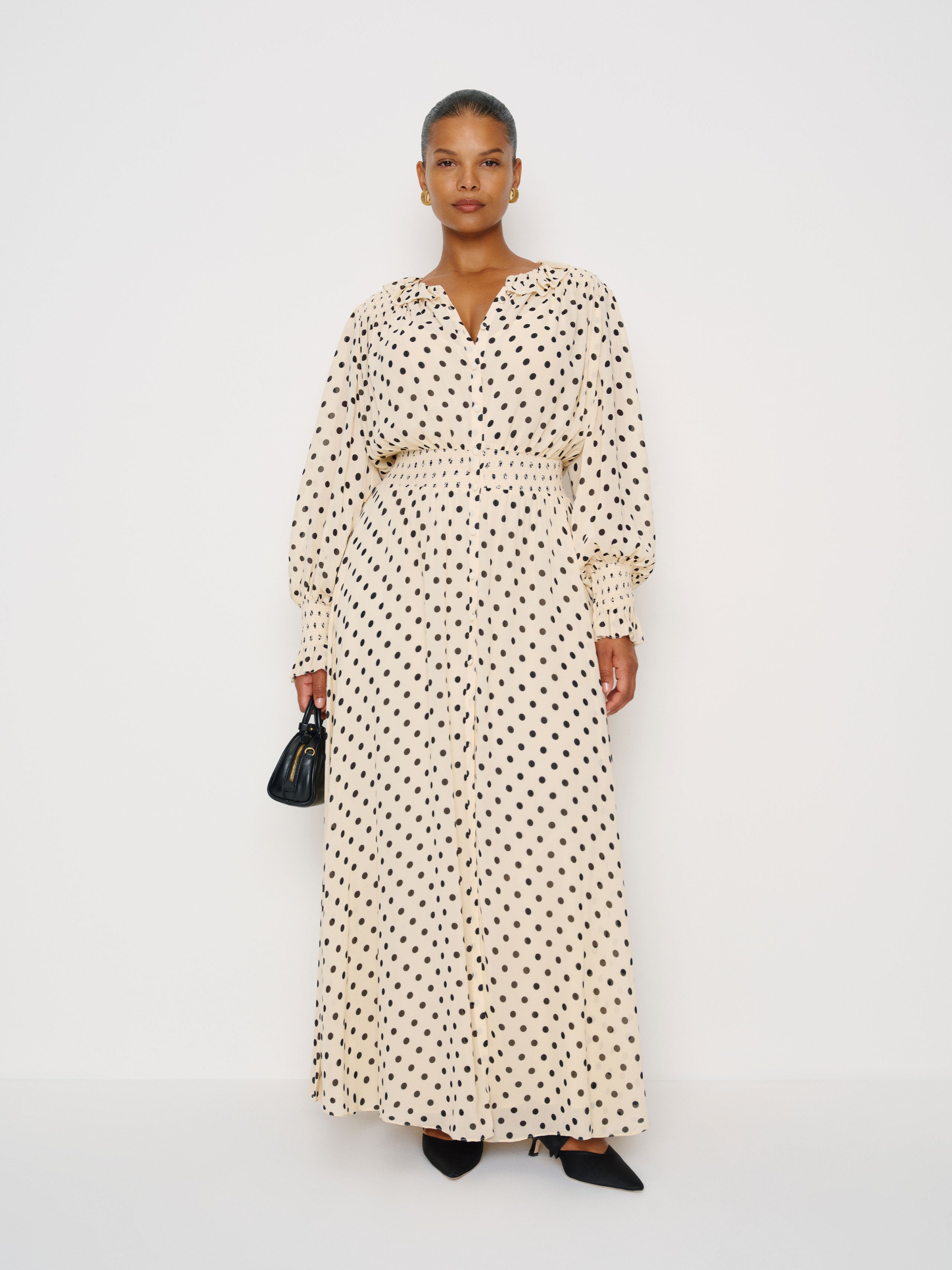 Easy breezy. Shop the Brown Sugar Ruffle Dress ES from Reformation, a long-sleeved maxi dress with puff sleeves, a button front, and smock detailing.