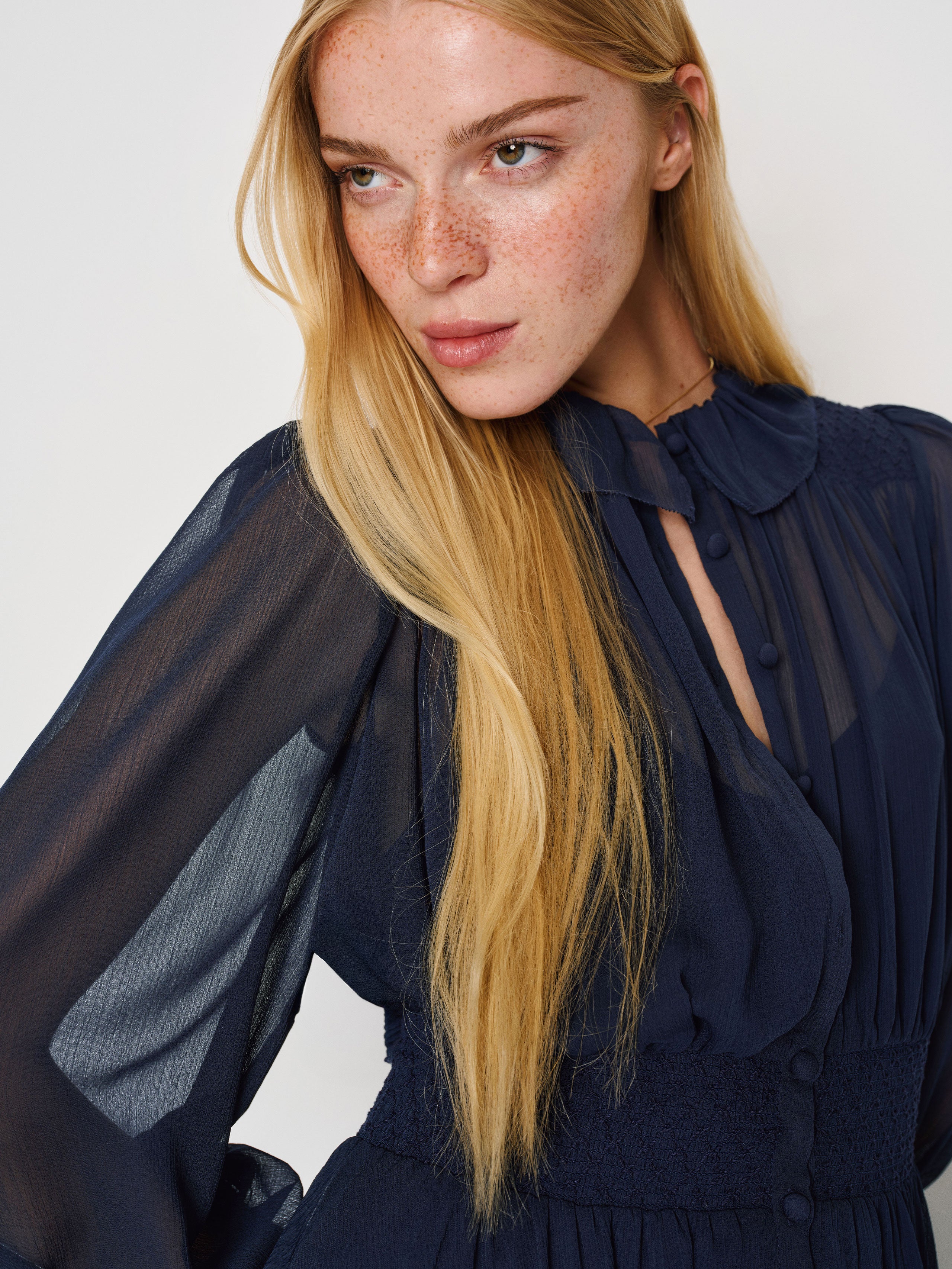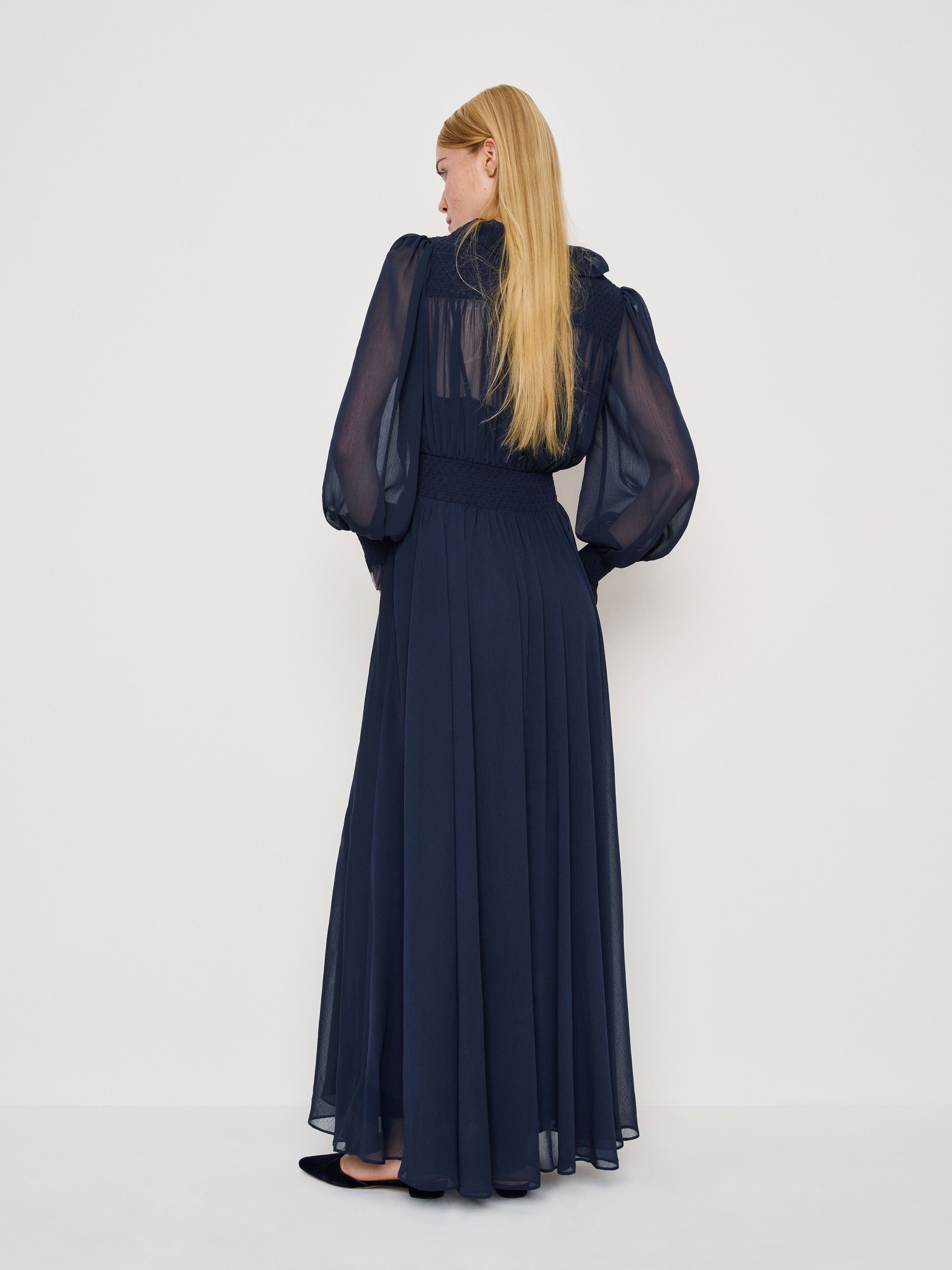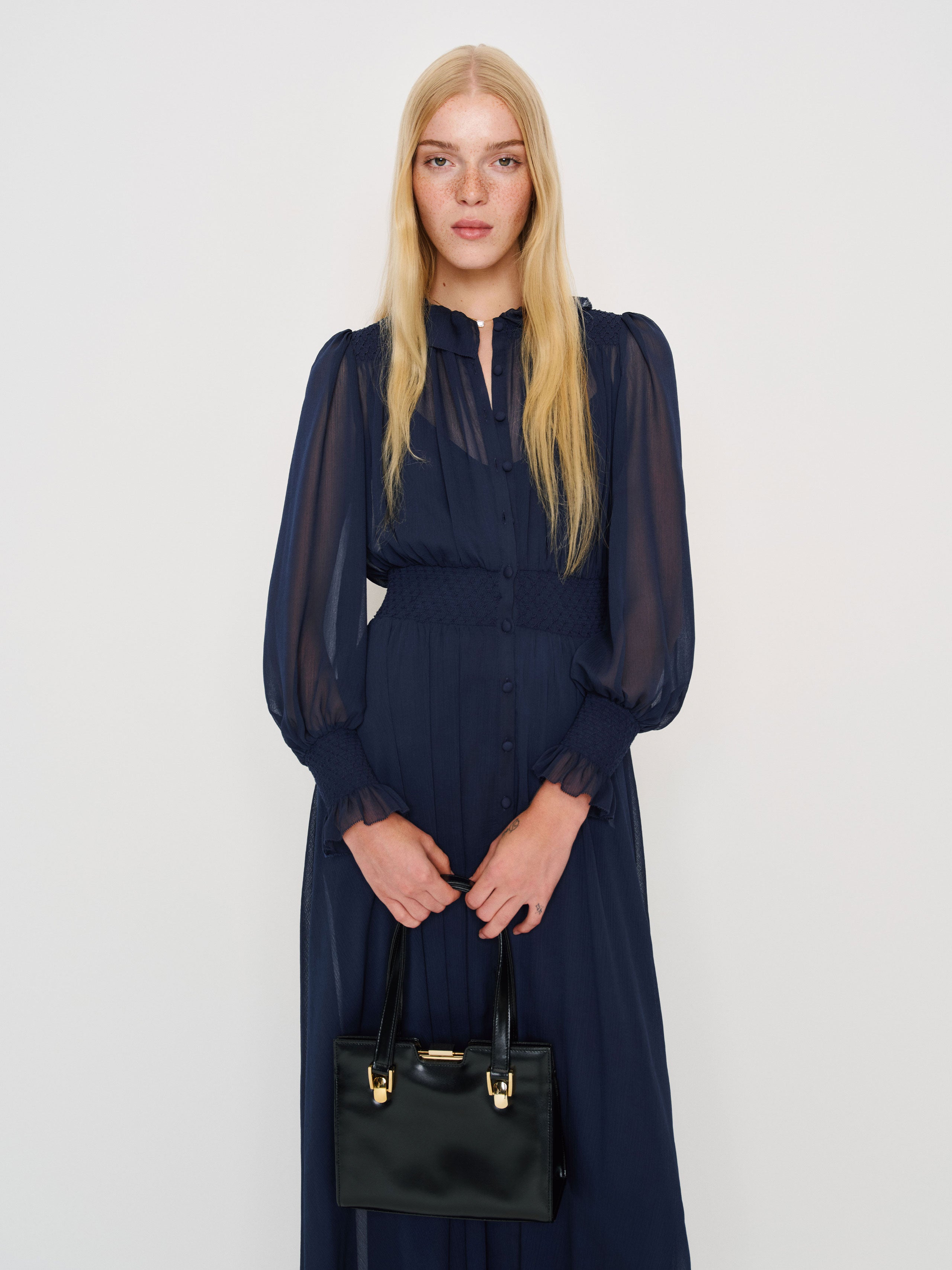 Easy breezy. Shop the Brown Sugar Ruffle Dress from Reformation, a long-sleeved maxi dress with puff sleeves, a button front, and smock detailing.