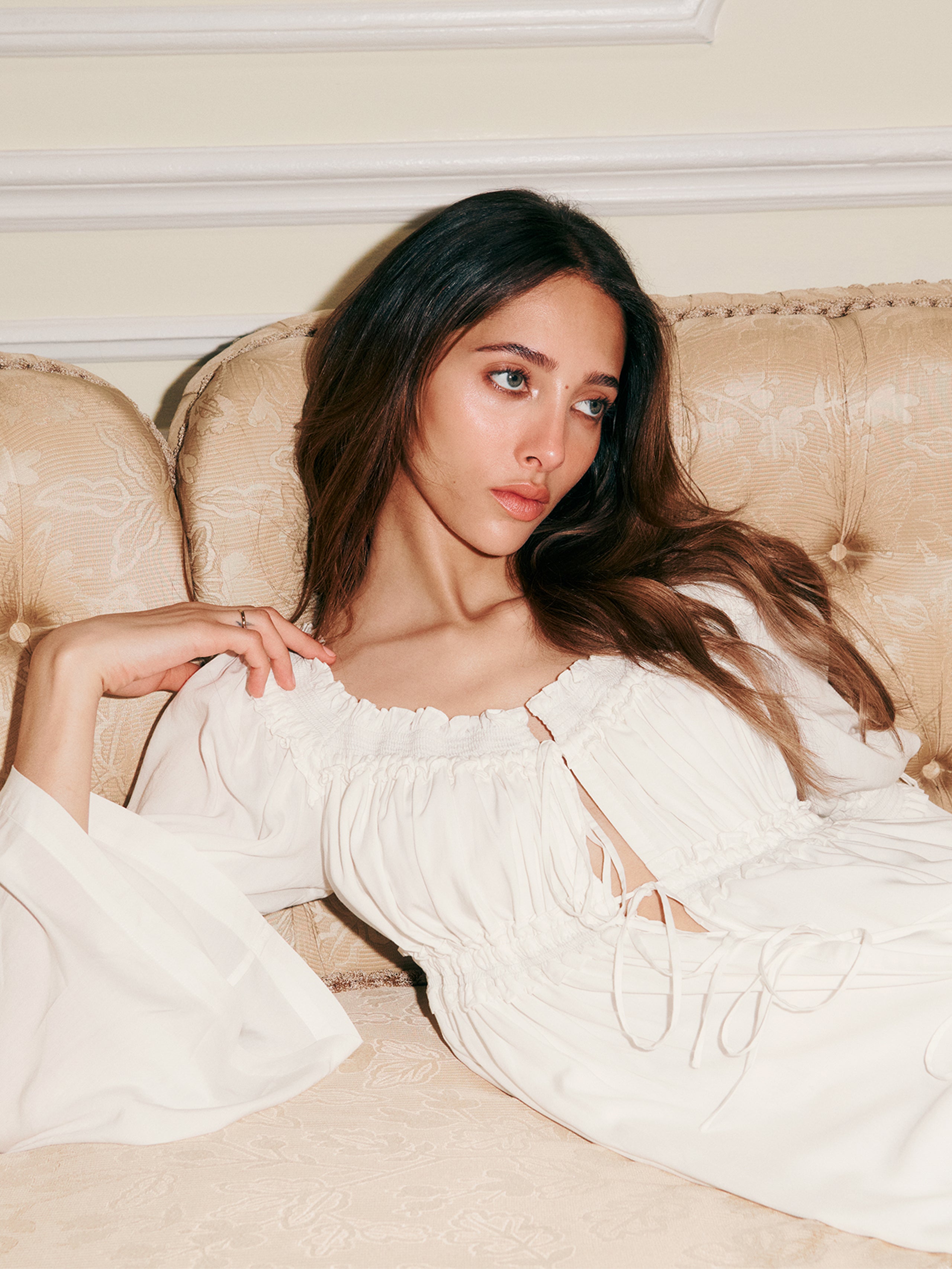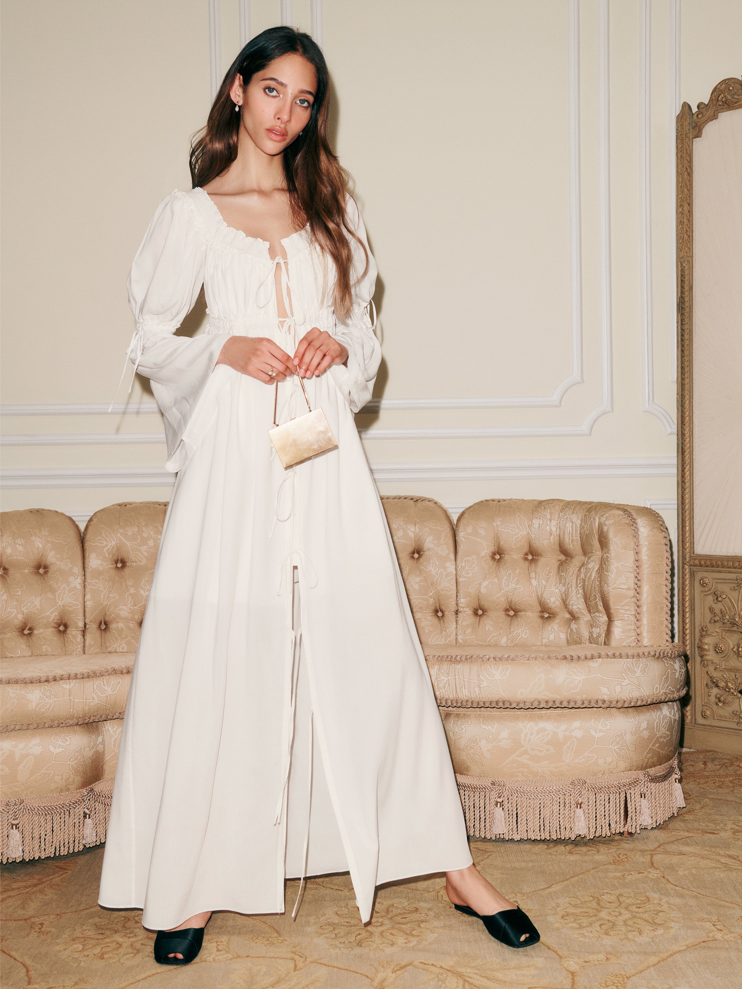 If you have to be fancy soon. Shop the Cabrini Dress from Reformation, a relaxed maxi dress with bell sleeves and a boat neckline.