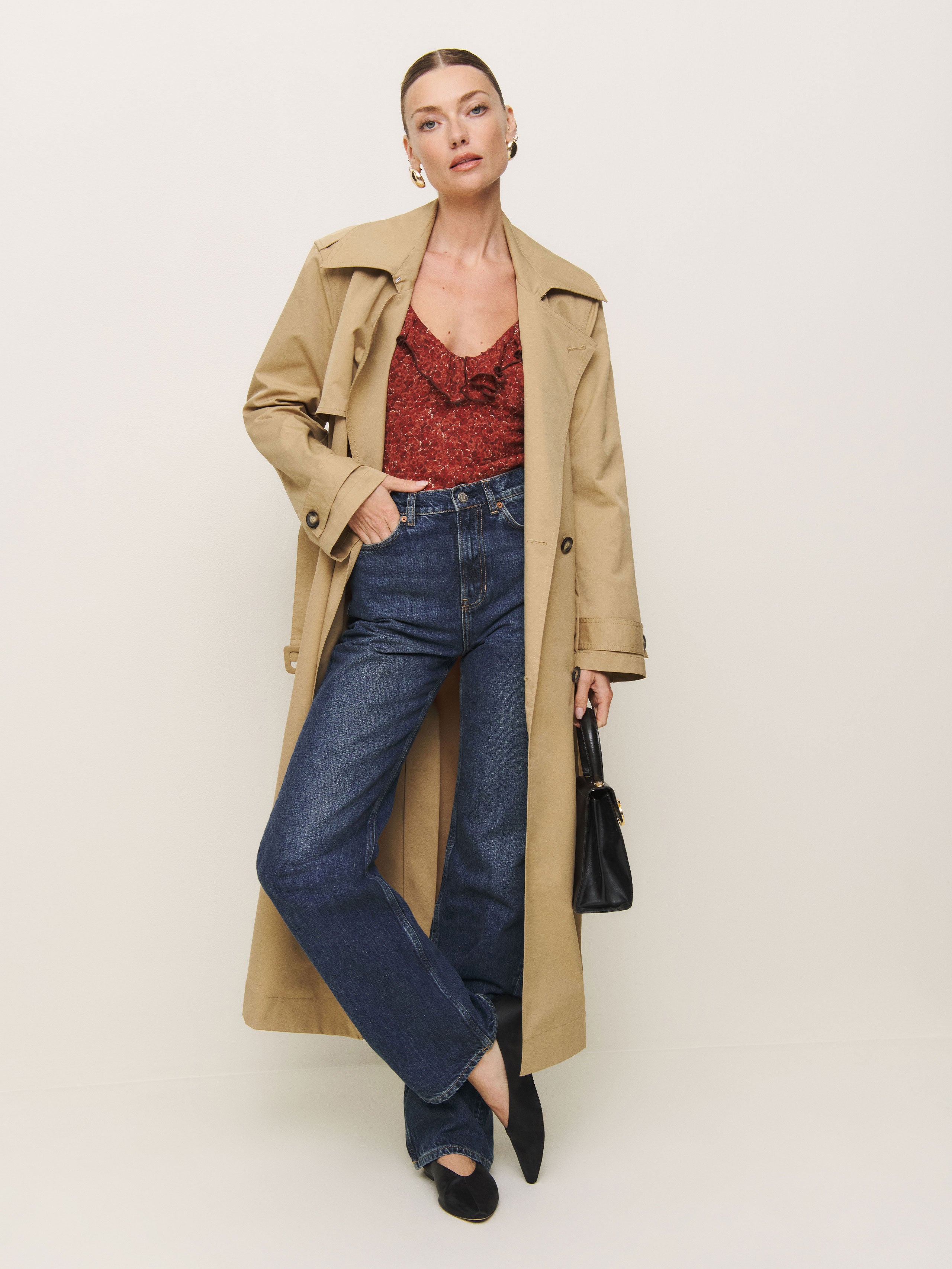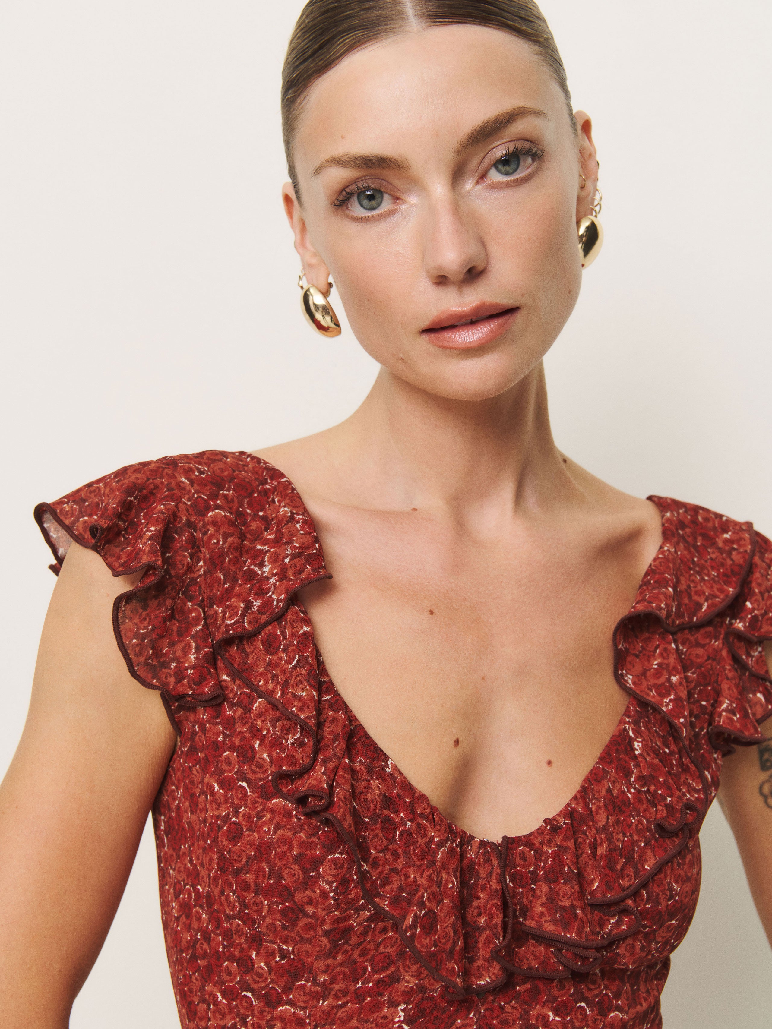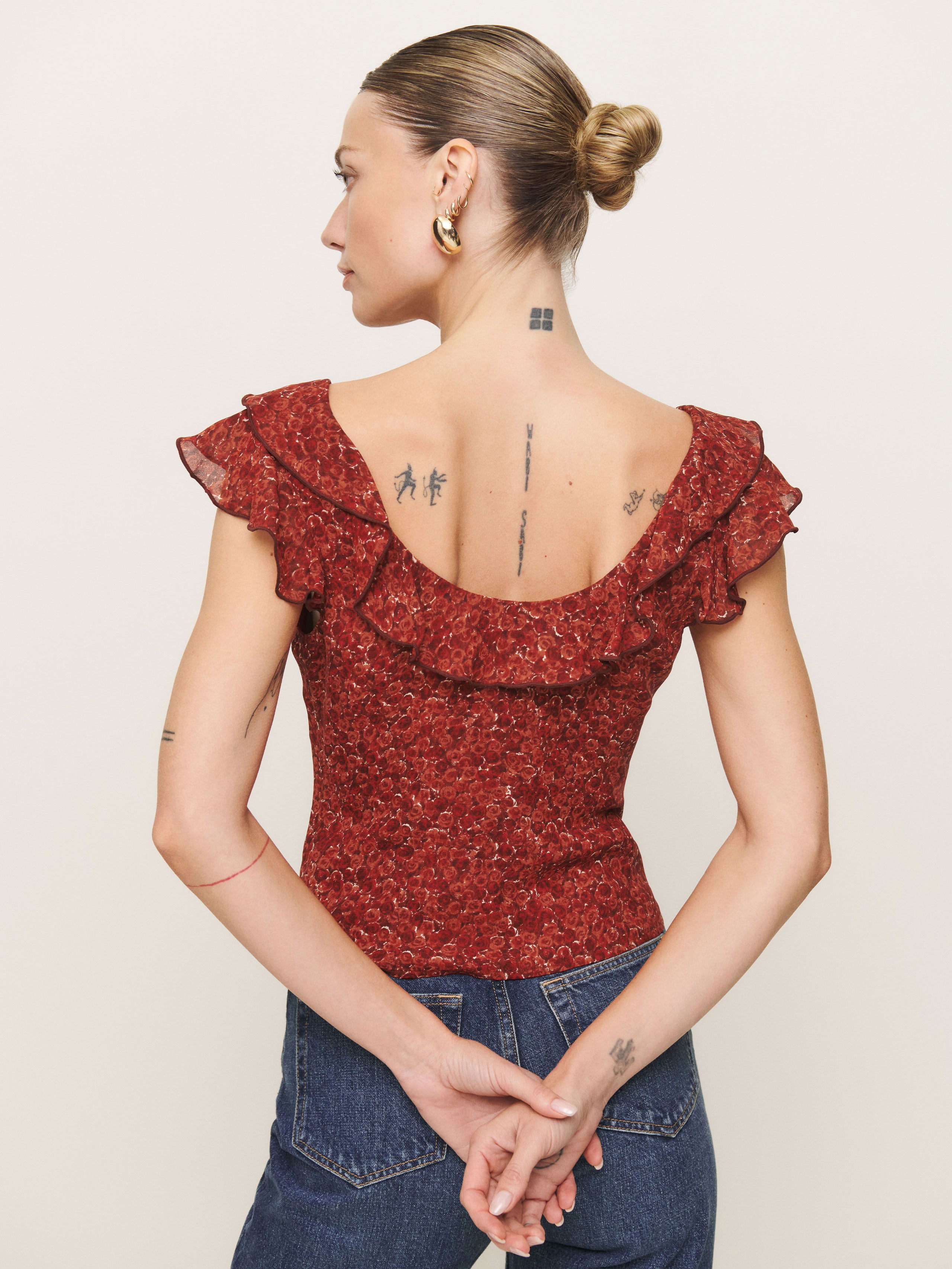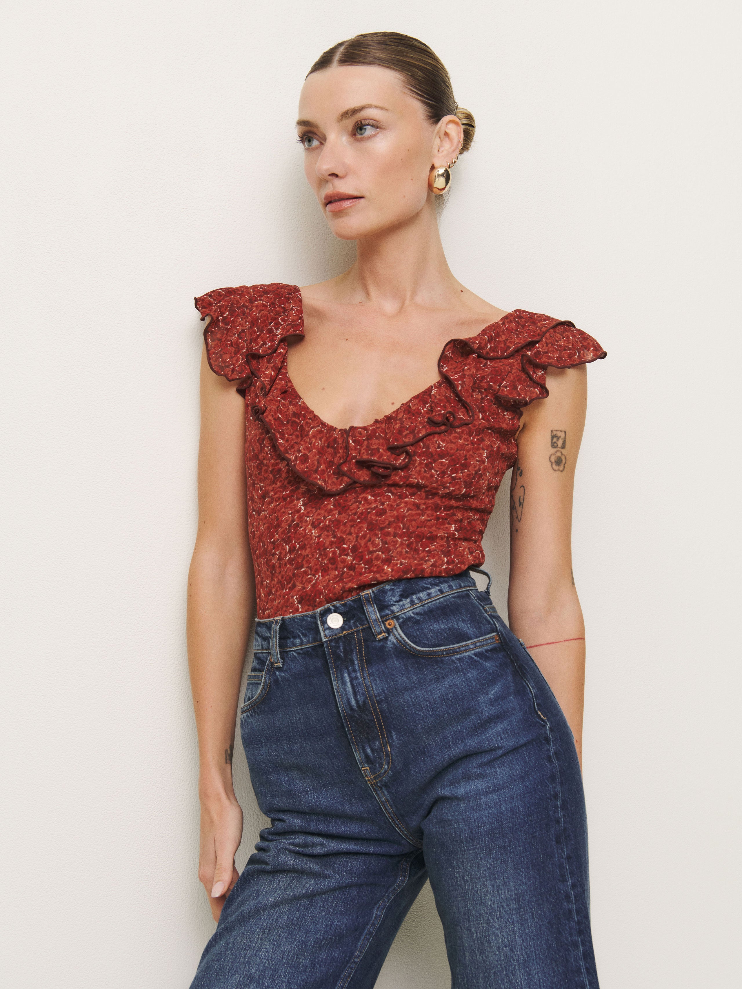 Up top. Shop the Cala Top from Reformation, a sleeveless top with a deep V-neckline, front seams, and ruffles at the neck.