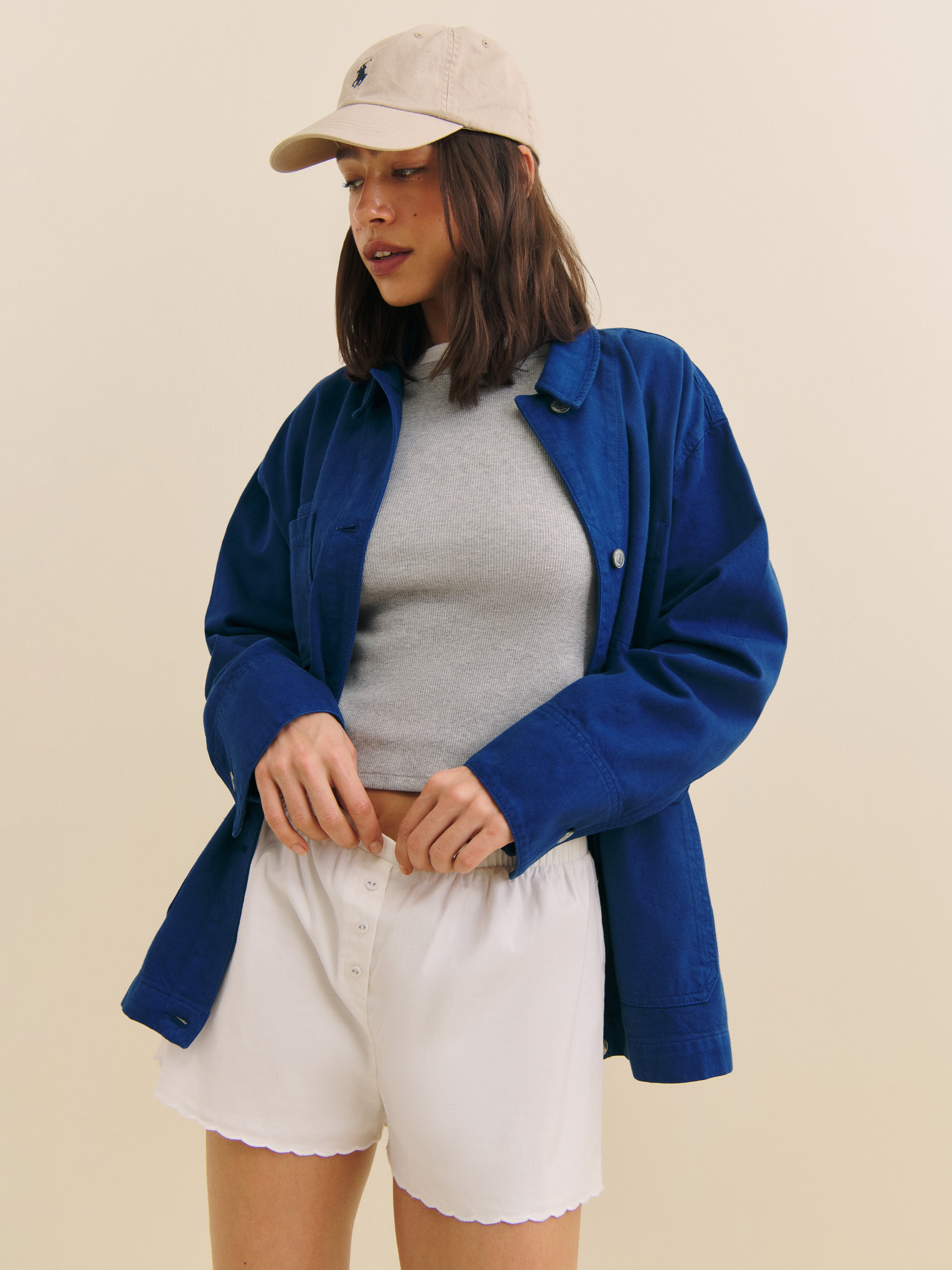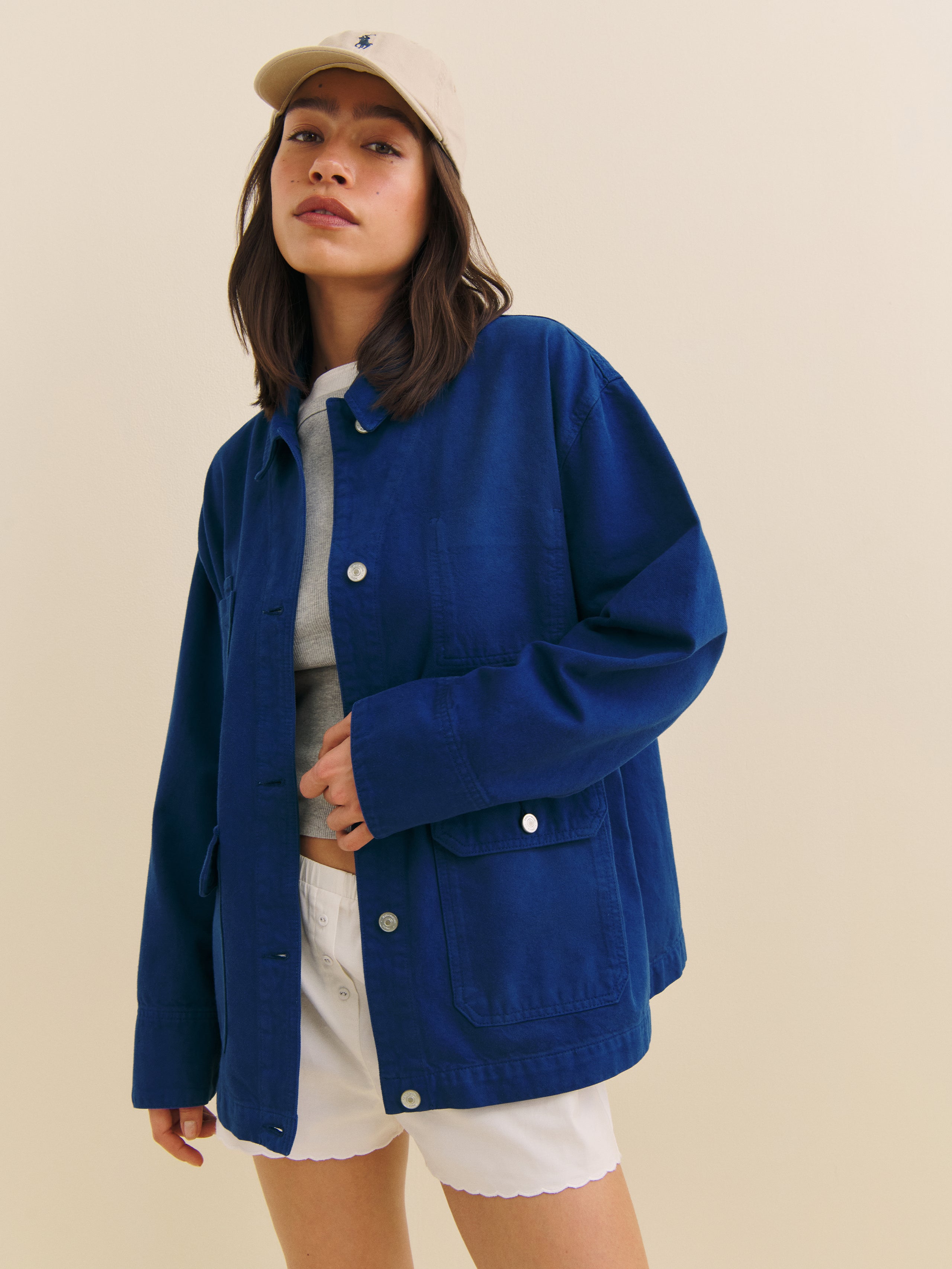 Denim time. Shop the Callum Denim Chore Jacket from Reformation, a denim chore jacket with a collared neckline, button front, and pockets.