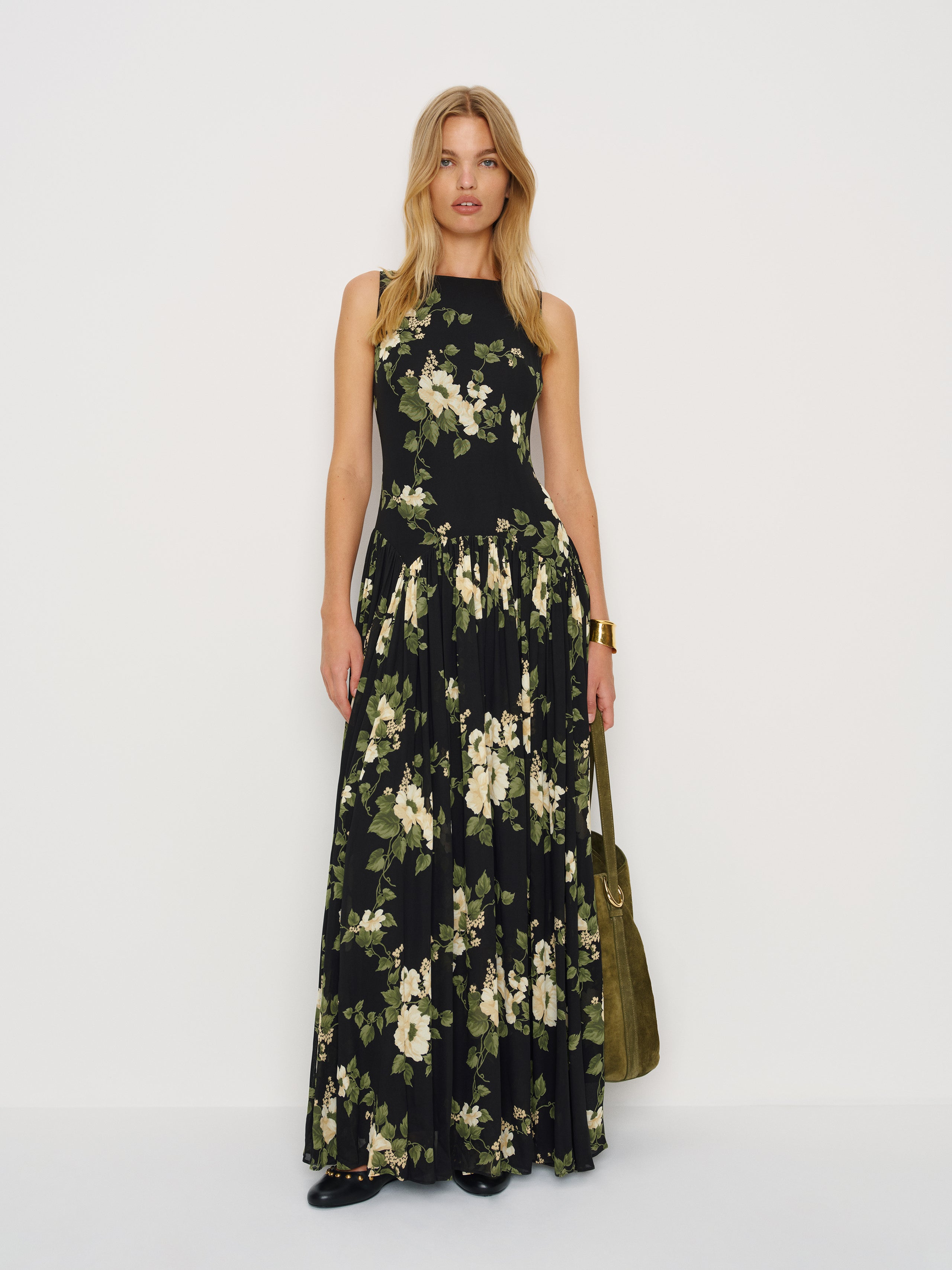 Wear the dress. Shop the Camella Dress from Reformation, a sleeveless full-length dress with a high boat neckline, drop waist, and pleated skirt.