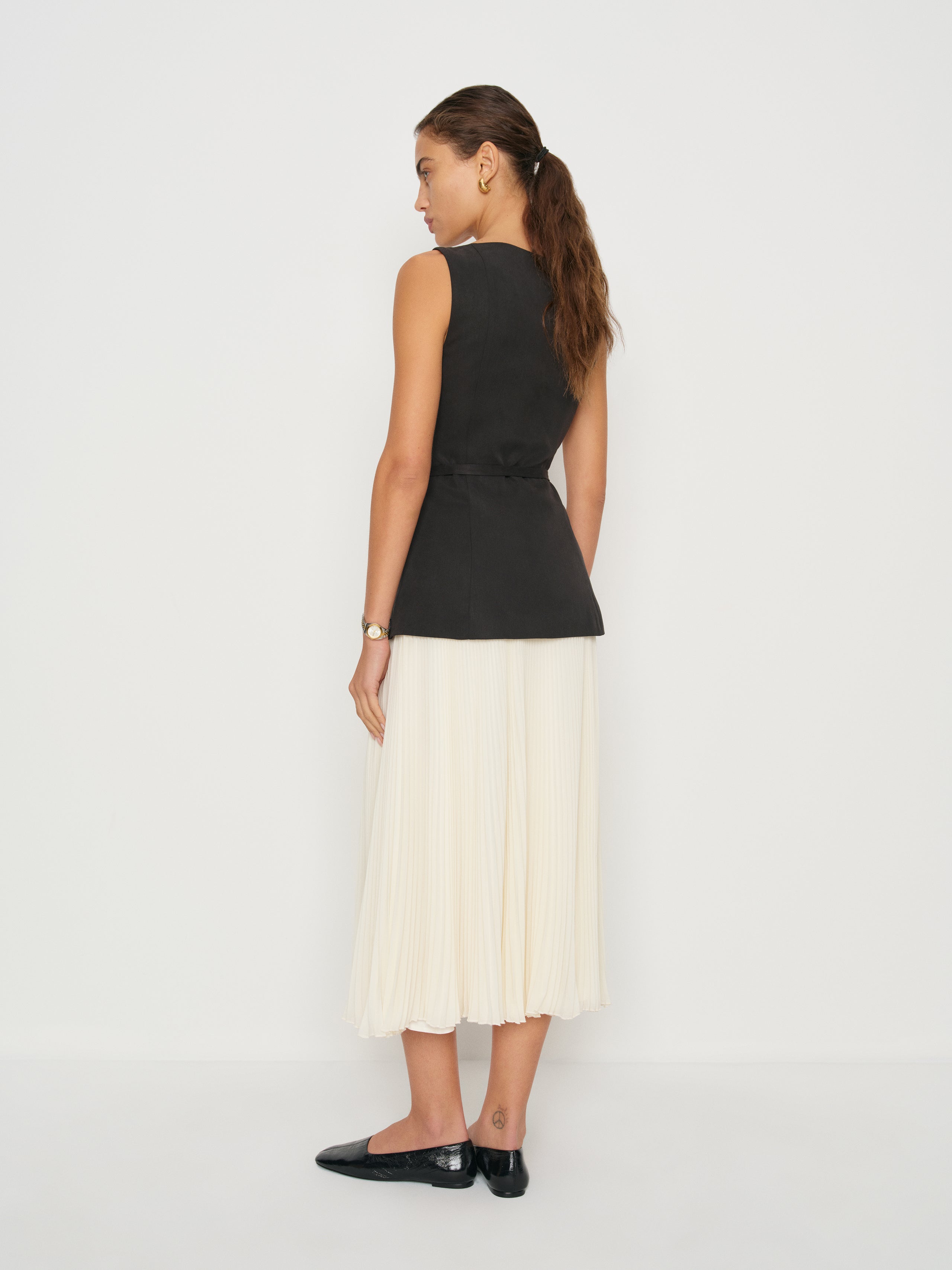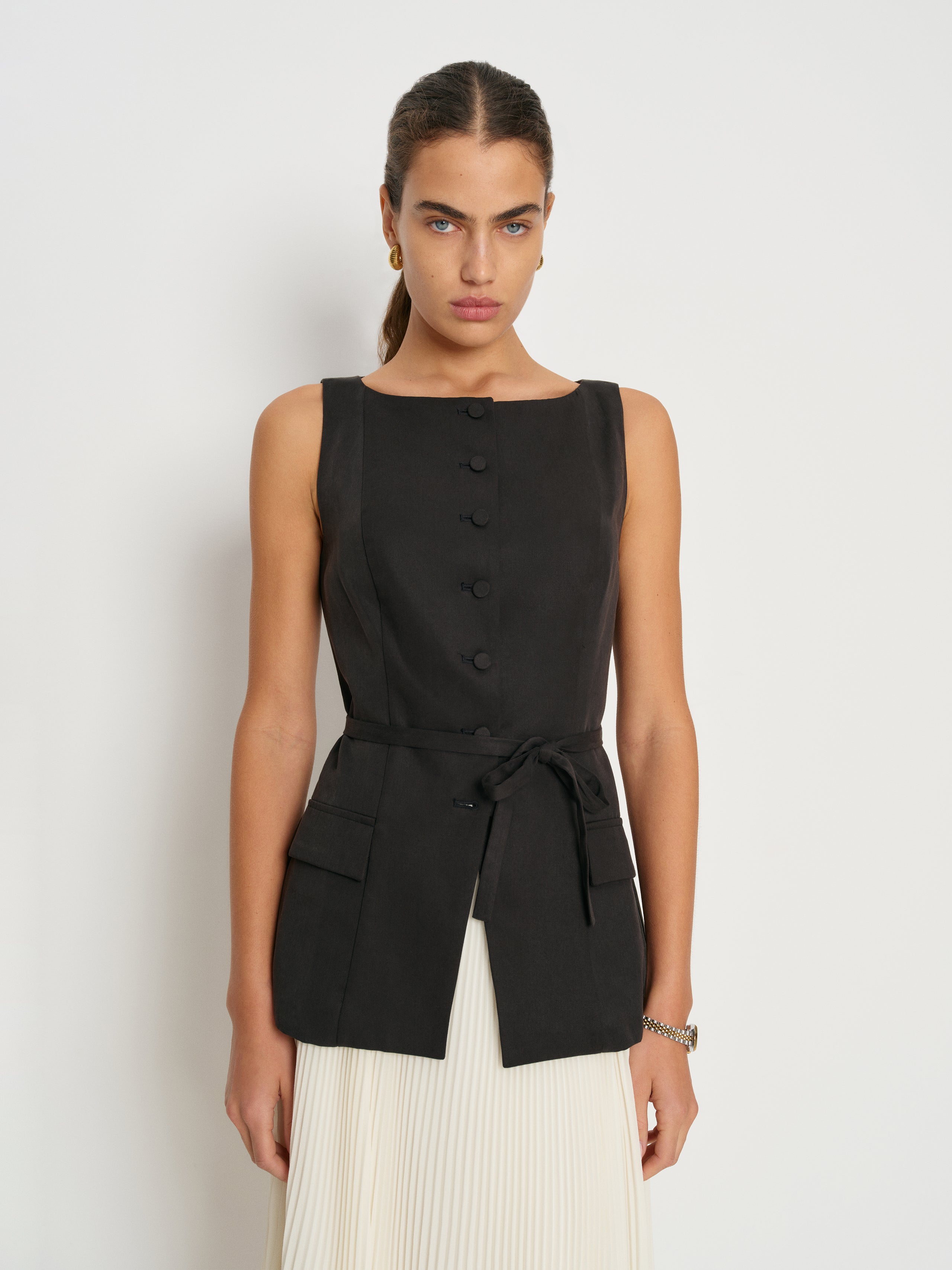 Cute top. Shop the Camellia Top from Reformation, a sleeveless top with a high neckline, center front buttons, and an adjustable tie at the waist.