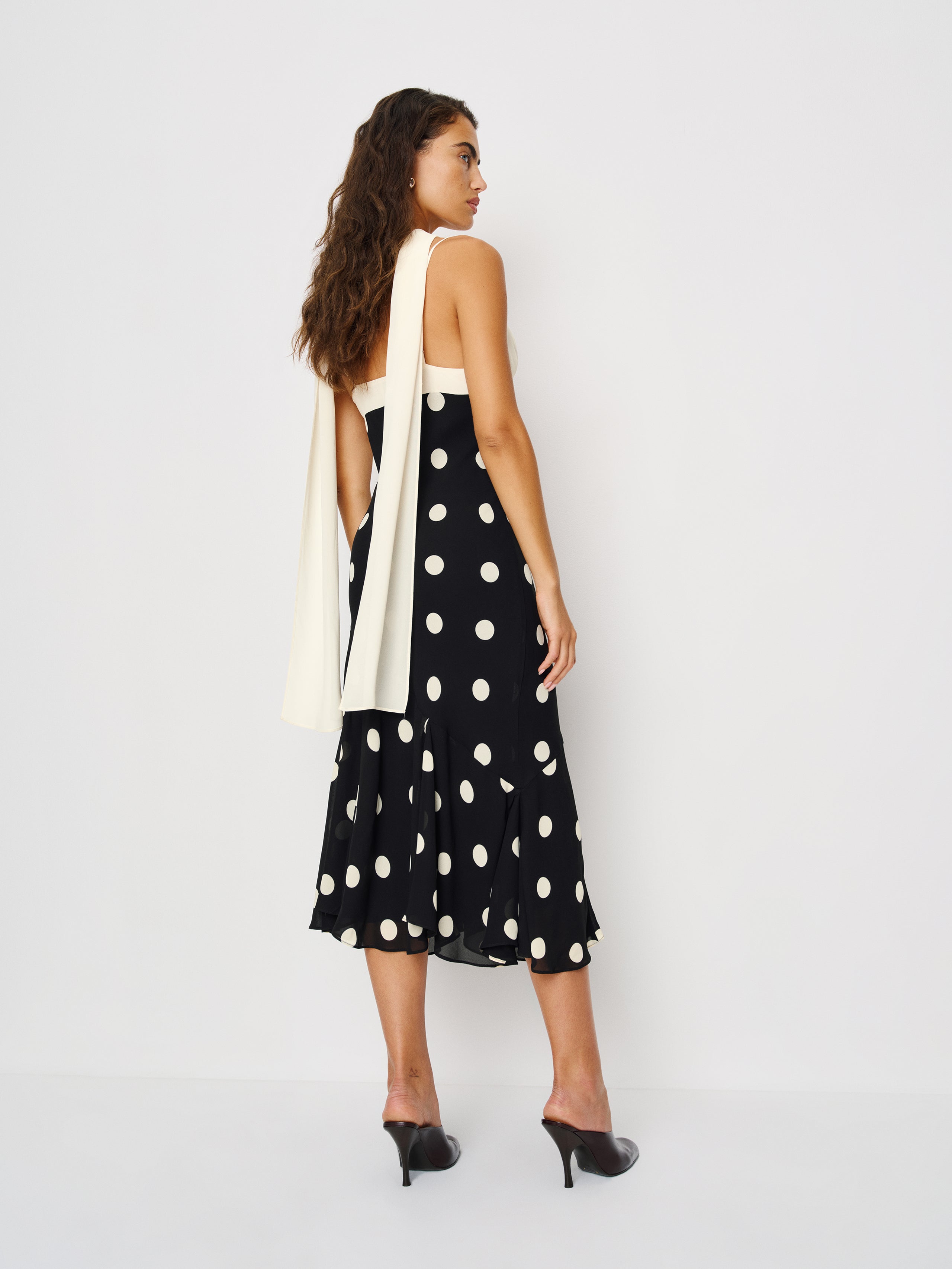 You must be new. Shop the Caprina Dress from Reformation, a sleeveless midi dress with a V-neckline, ruffle hem, and removable scarf.
