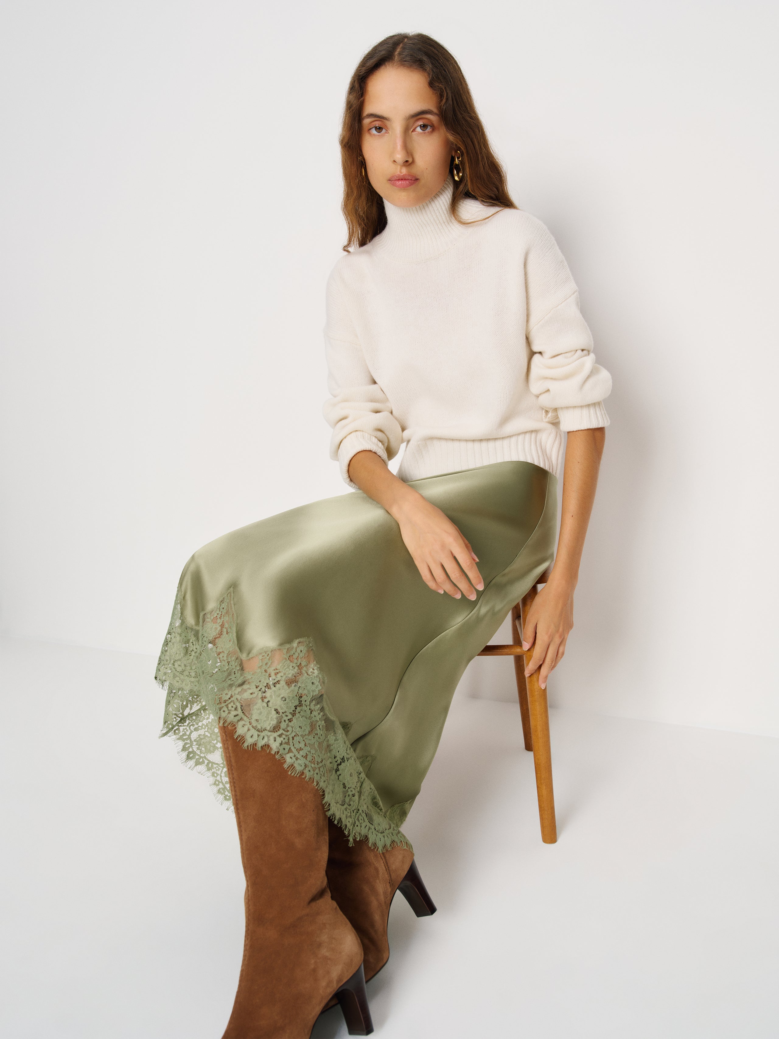 Looks great with a gust of wind. Shop the Carolina Silk Skirt from Reformation, a mid-rise midi skirt with a lace hem.