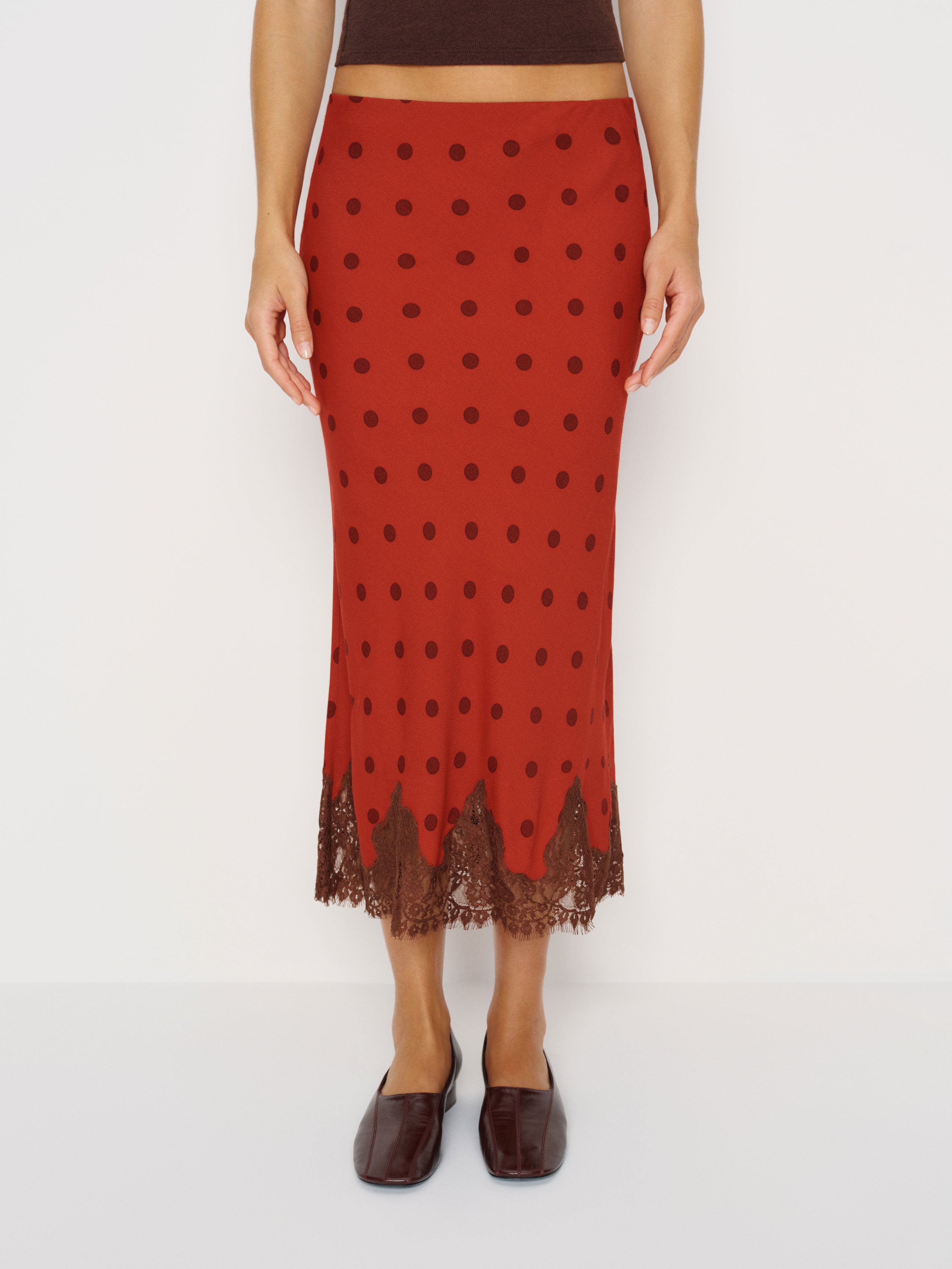 Get some compliments. Shop the Carolina Skirt from Reformation, a midi slip style skirt with a lace hem. Good for date night, as long as your date doesn't suck.