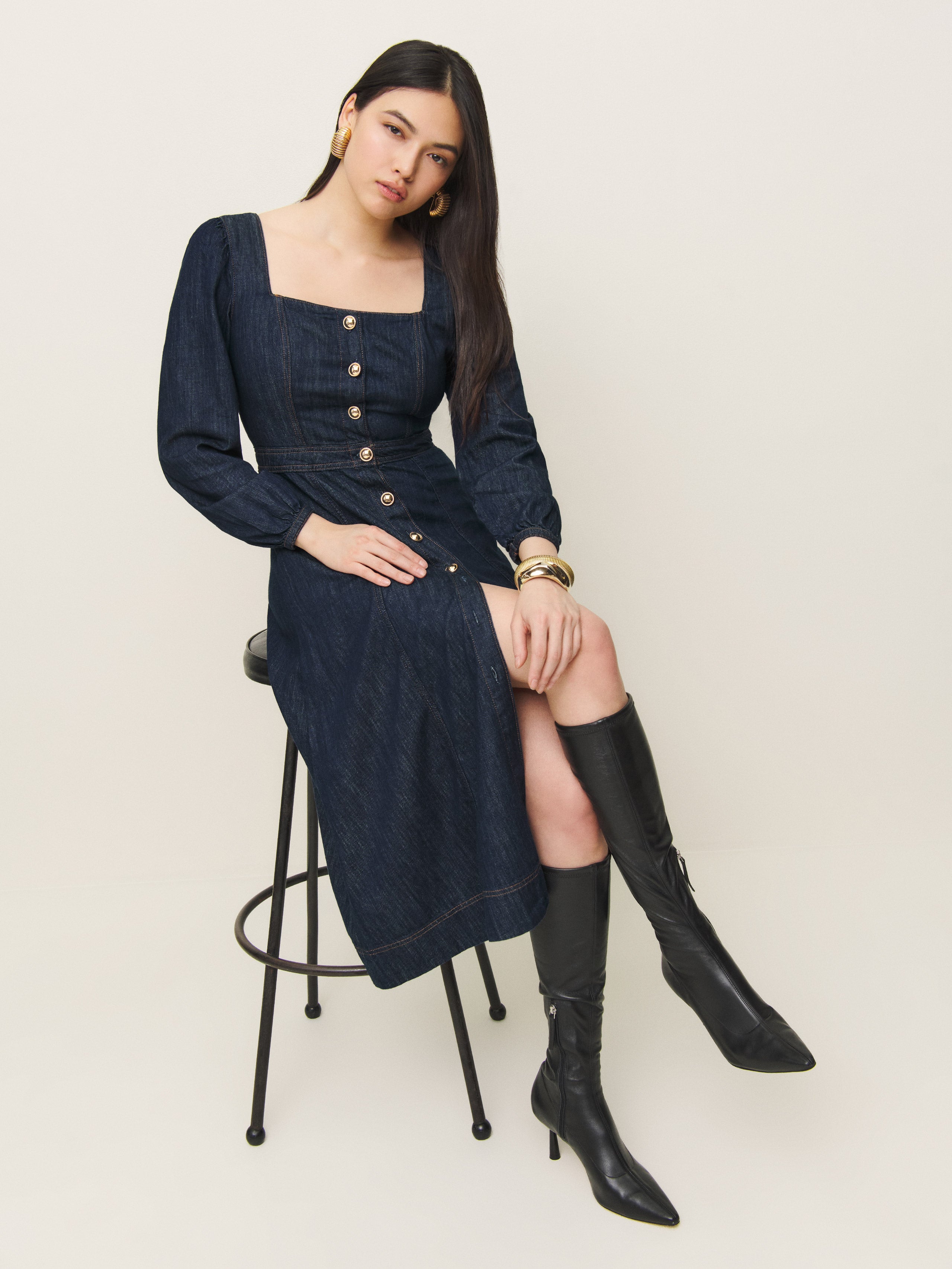 Wear the dress. Shop the Celeste Denim Midi Dress from Reformation, a long-sleeved midi dress with a square neckline, puff sleeves, and a button front.