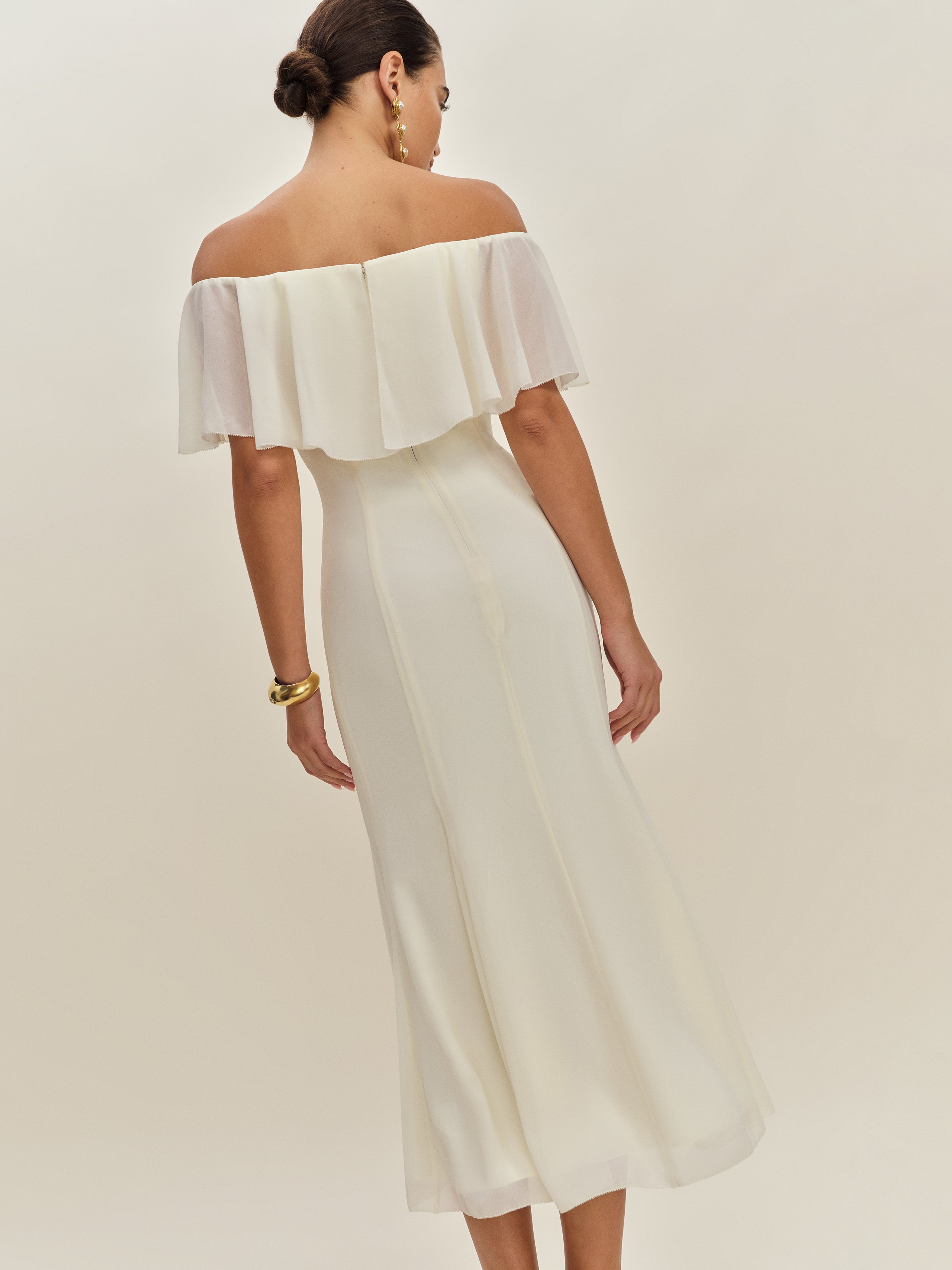 How classic. Shop the Charee Dress from Reformation, an off the shoulder midi dress with ruffles at the neckline.