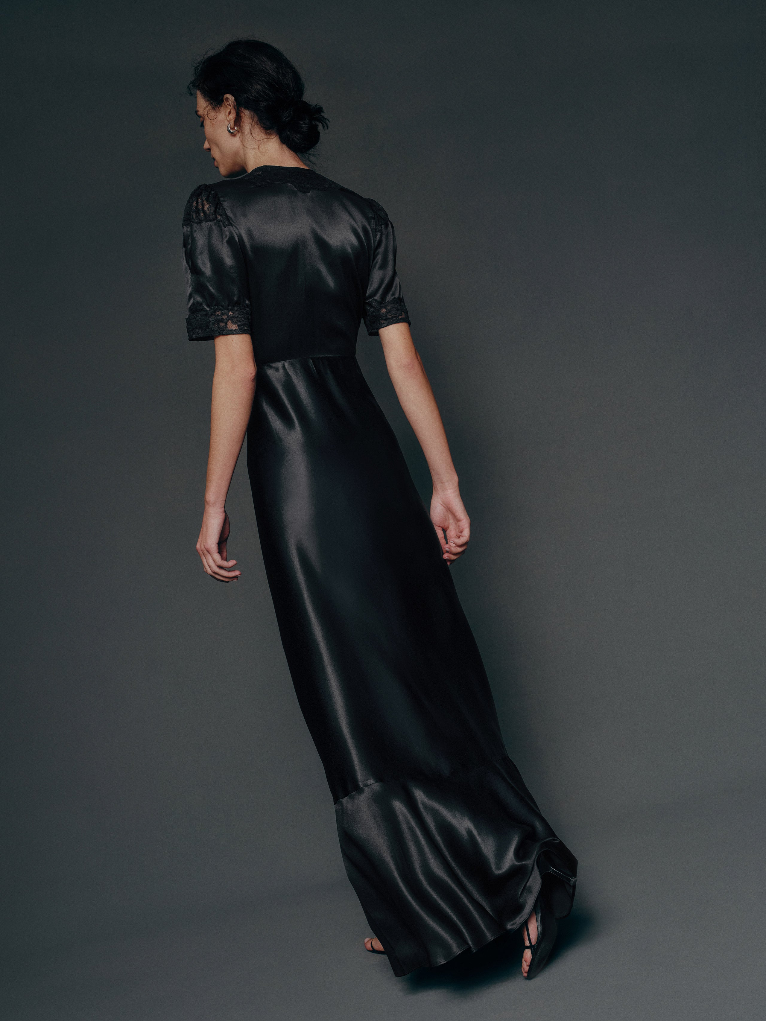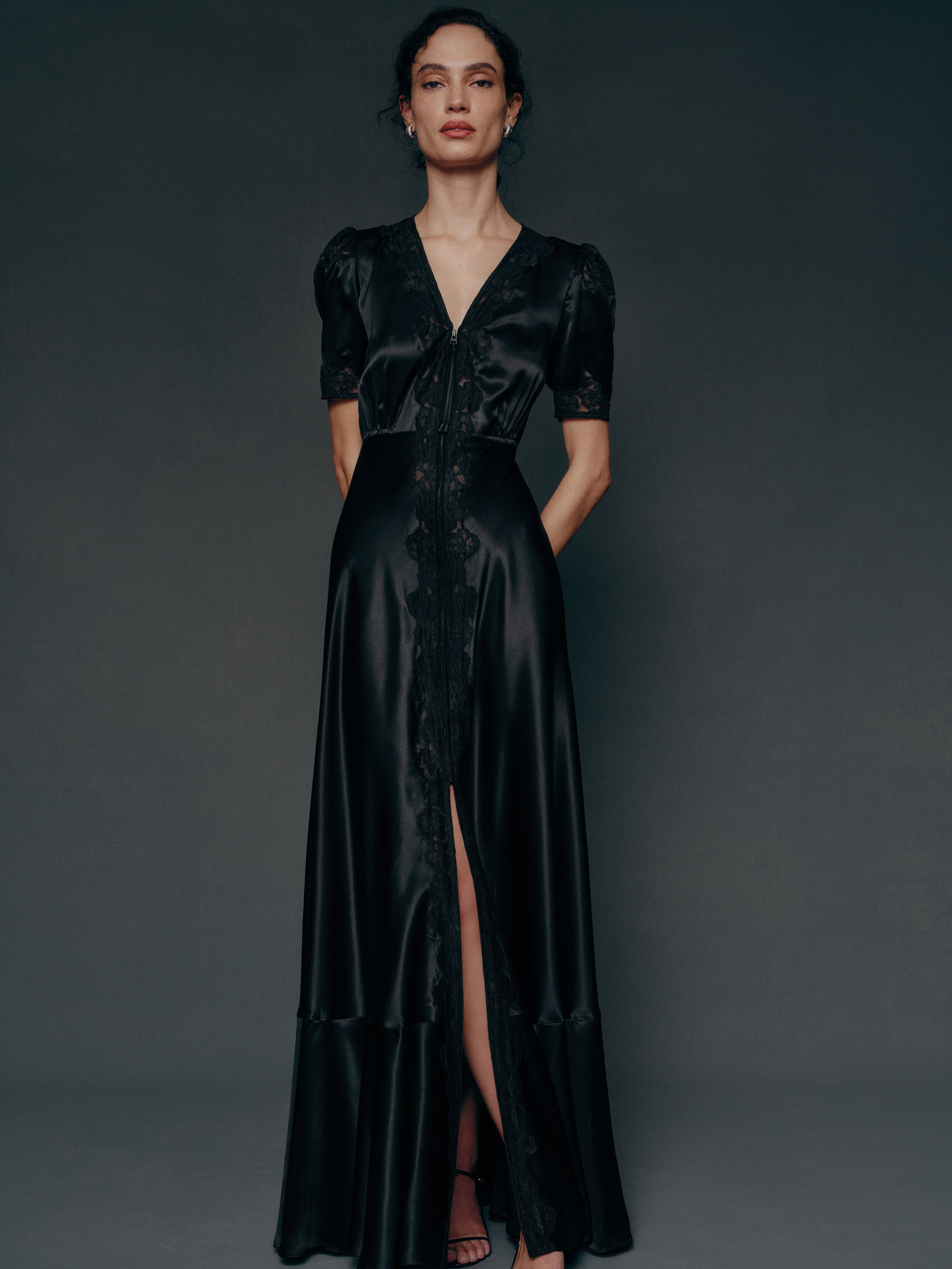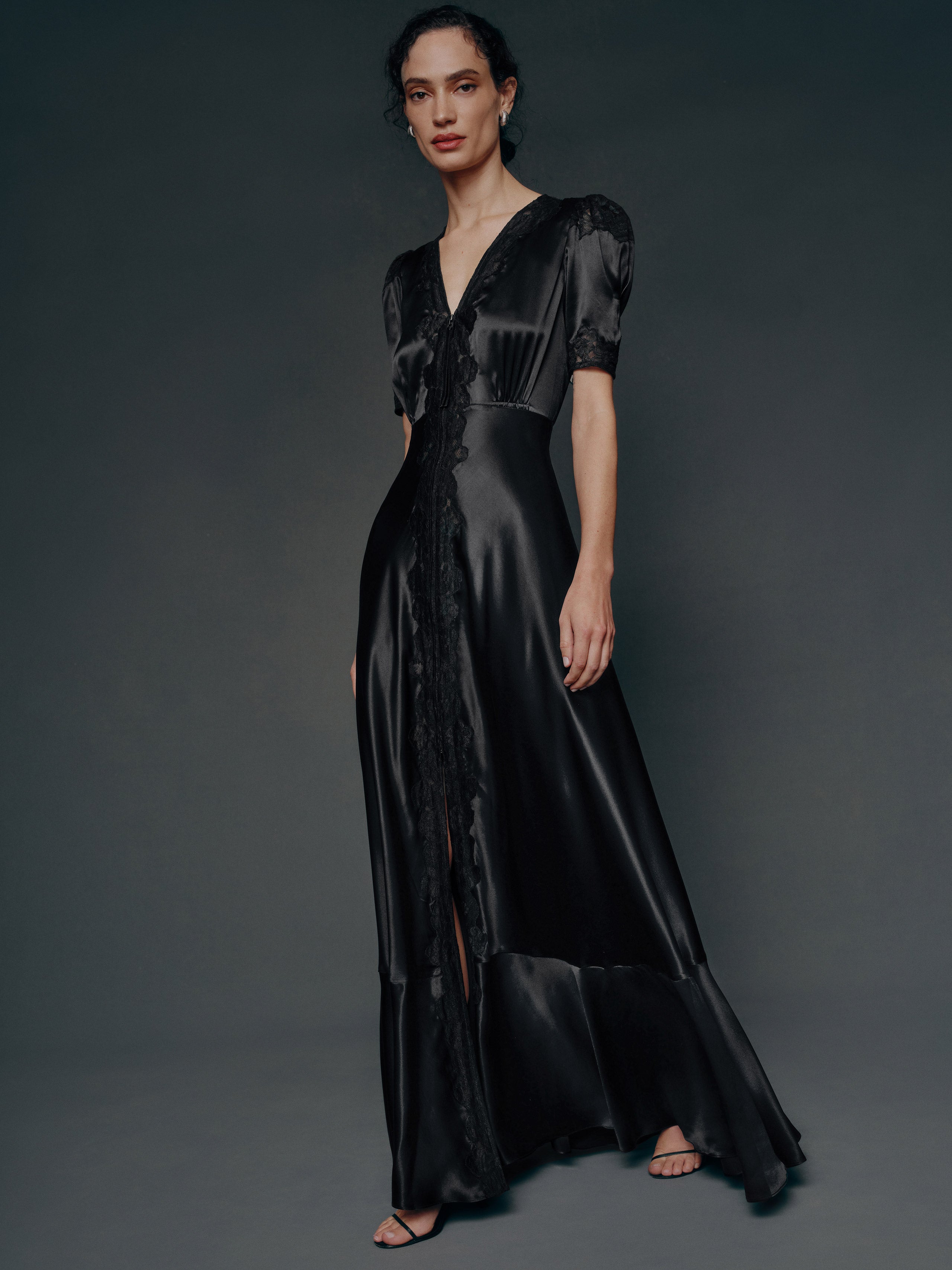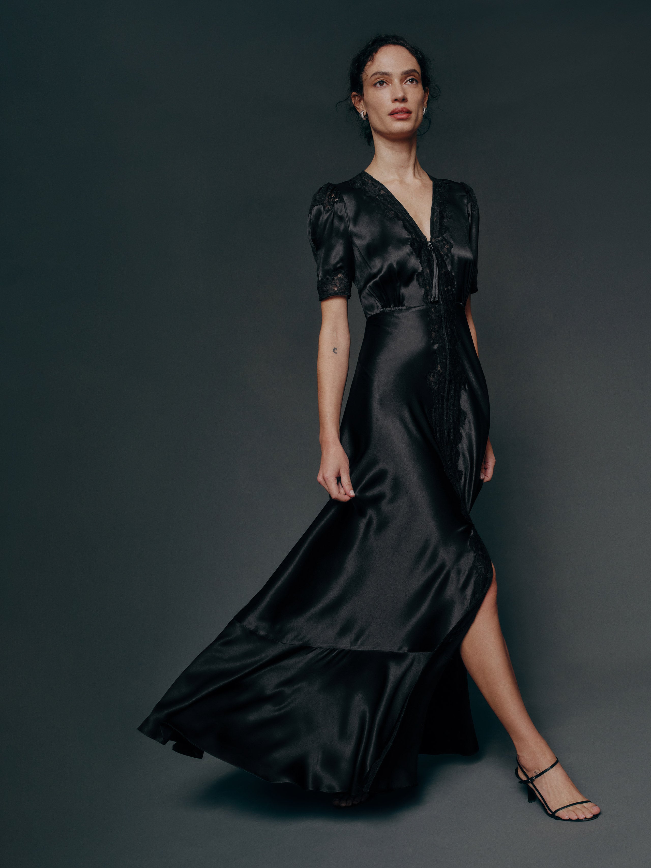 Romance for one. Shop the CHARLES DRESS from Reformation, a short-sleeve, full-length dress with a deep V-neckline...