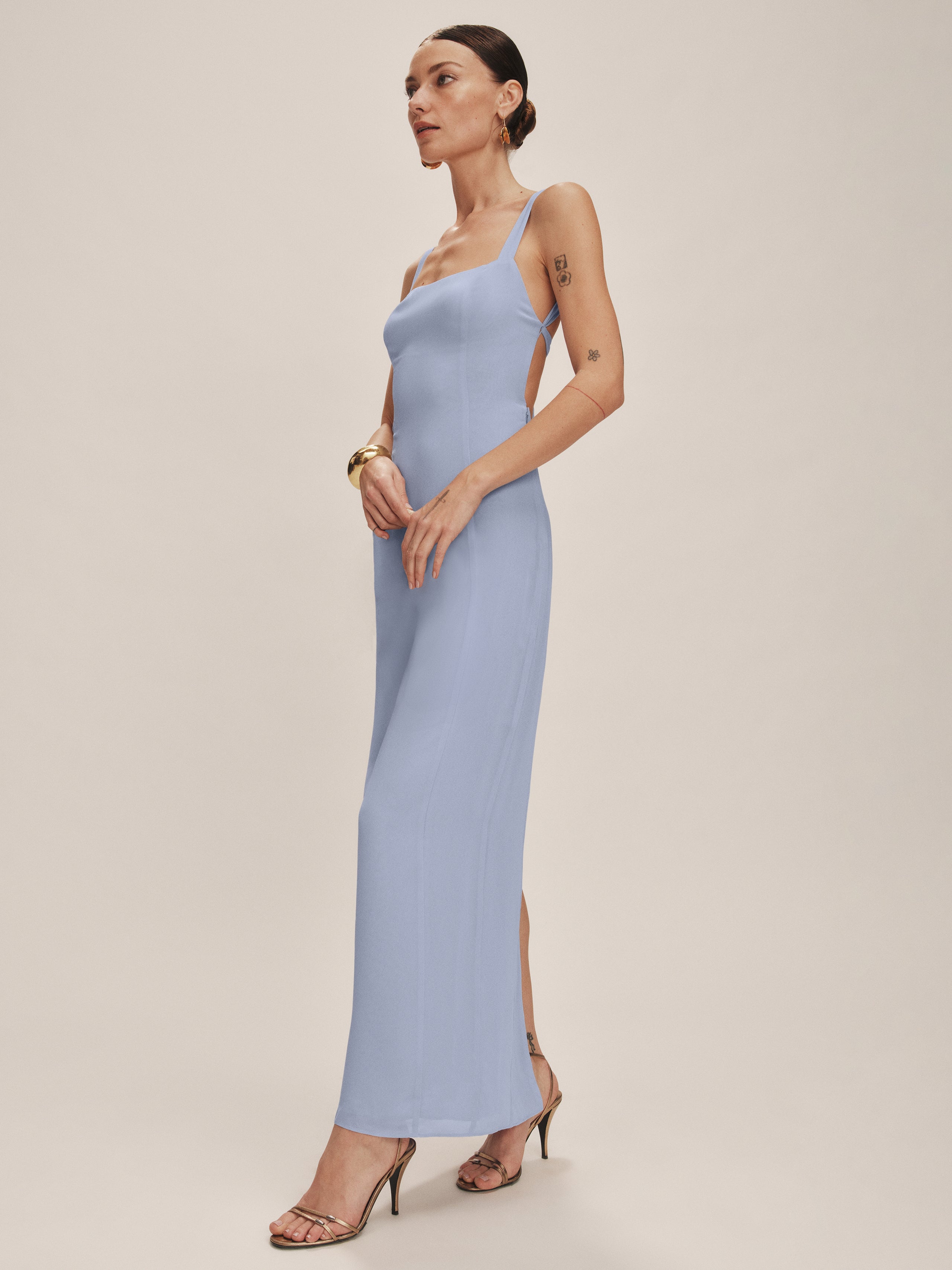 Wear me. Shop the Chime Dress from Reformation, a sleeveless full-length dress with a square neckline, open back with an adjustable tie, and center back slit.