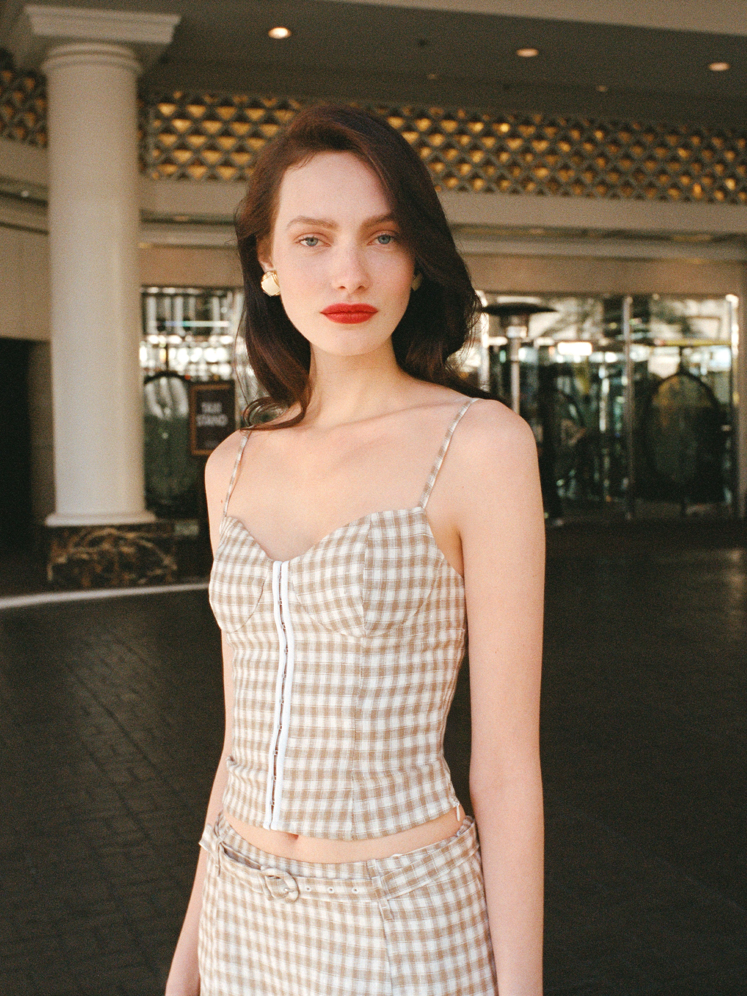 Up top. Shop the Christen Linen Top from Reformation, a sleeveless top with a sweetheart neckline, bust cup seams, and a hook-and-eye closure along the front.
