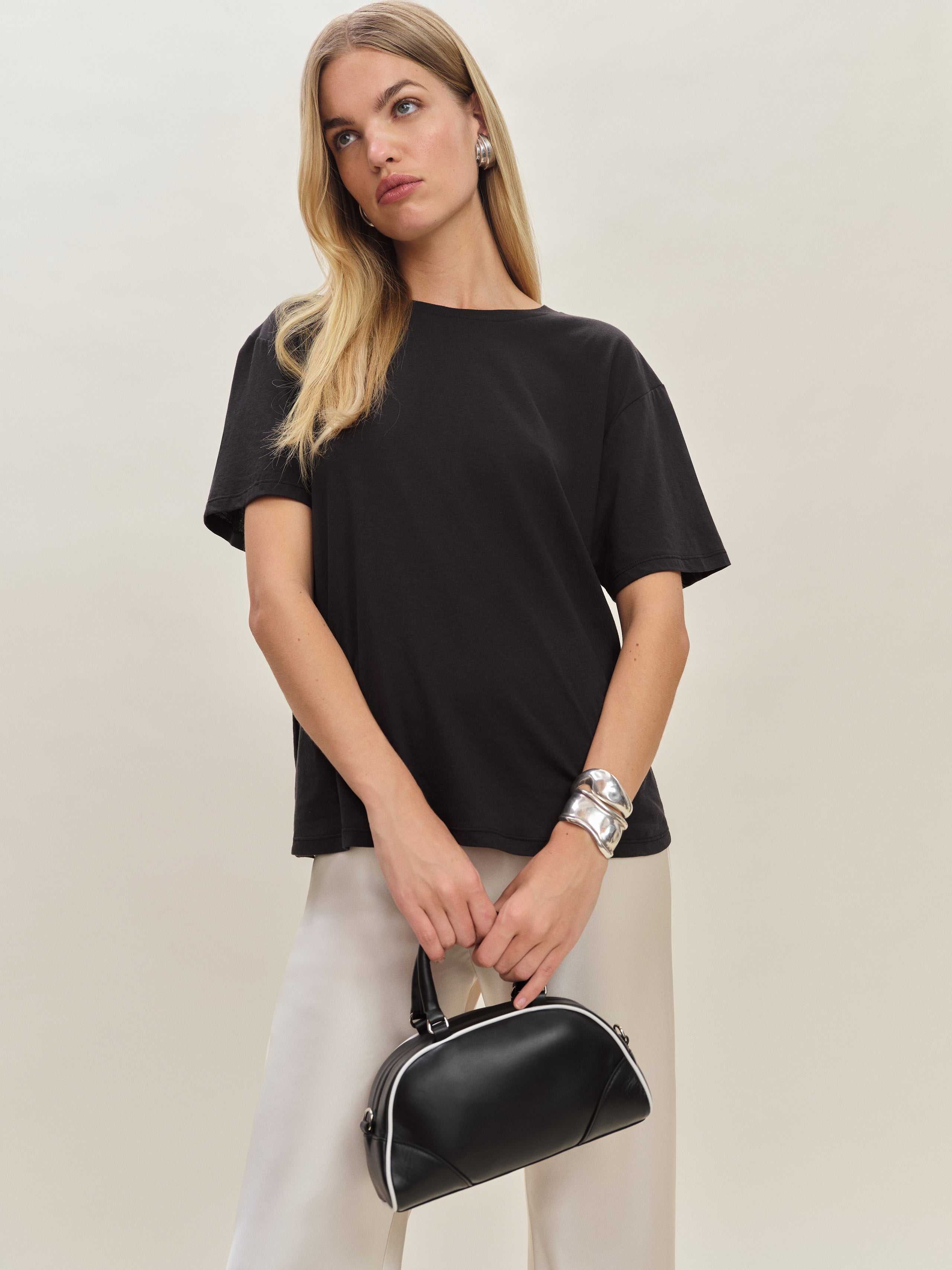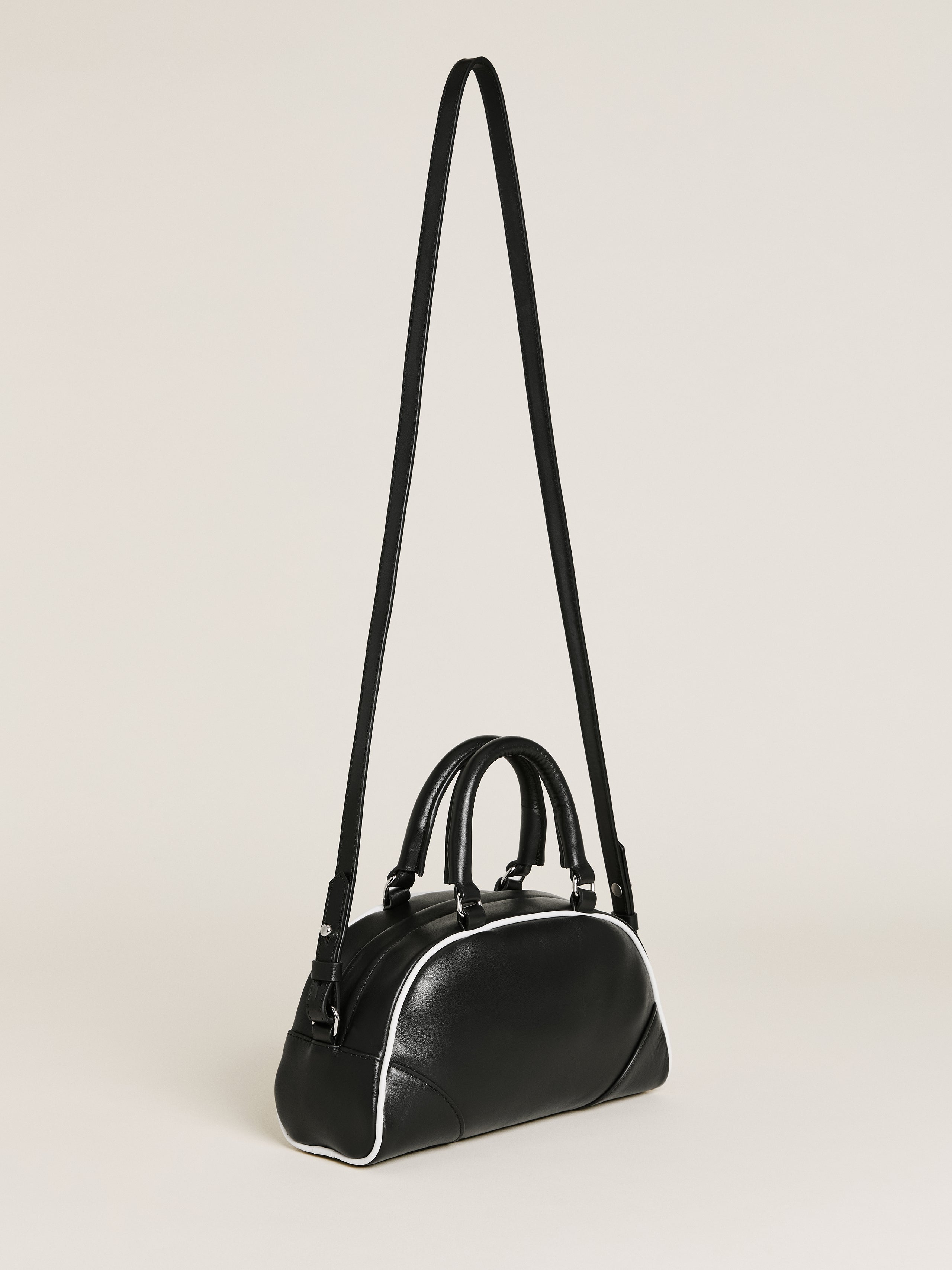 Hold me. Shop the Claudia Mini Bag from Reformation, a mini bowling bag with a short top handle and removable cross body strap.
