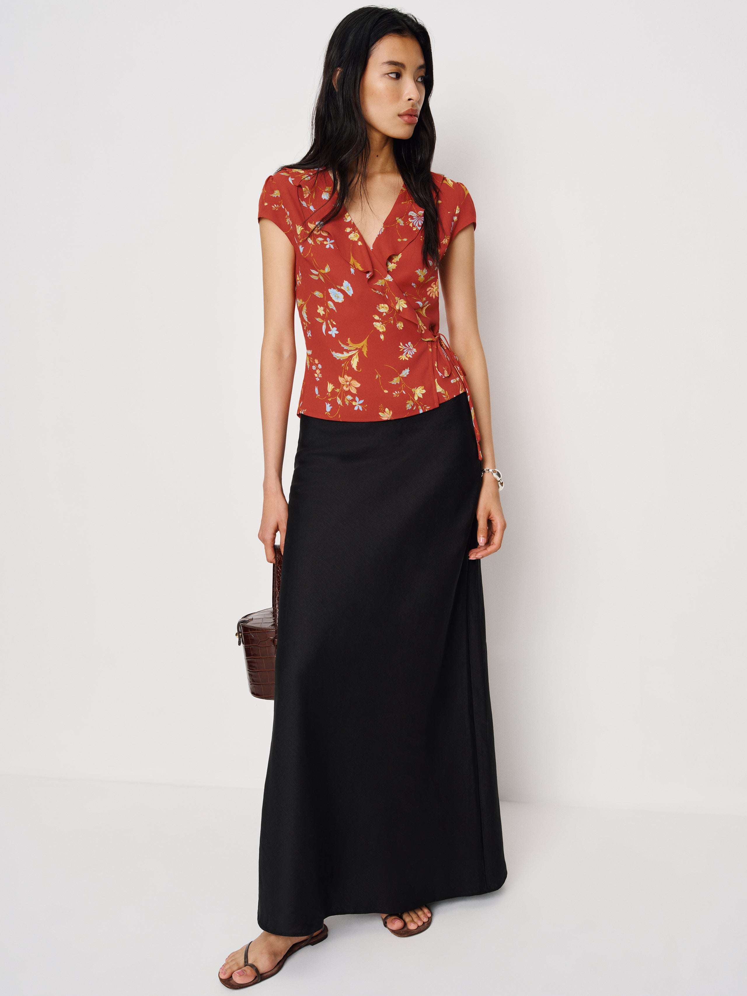 What do we have here? Shop the Clemence Top from Reformation, a short-sleeved adjustable wrap top with ruffle detailing.