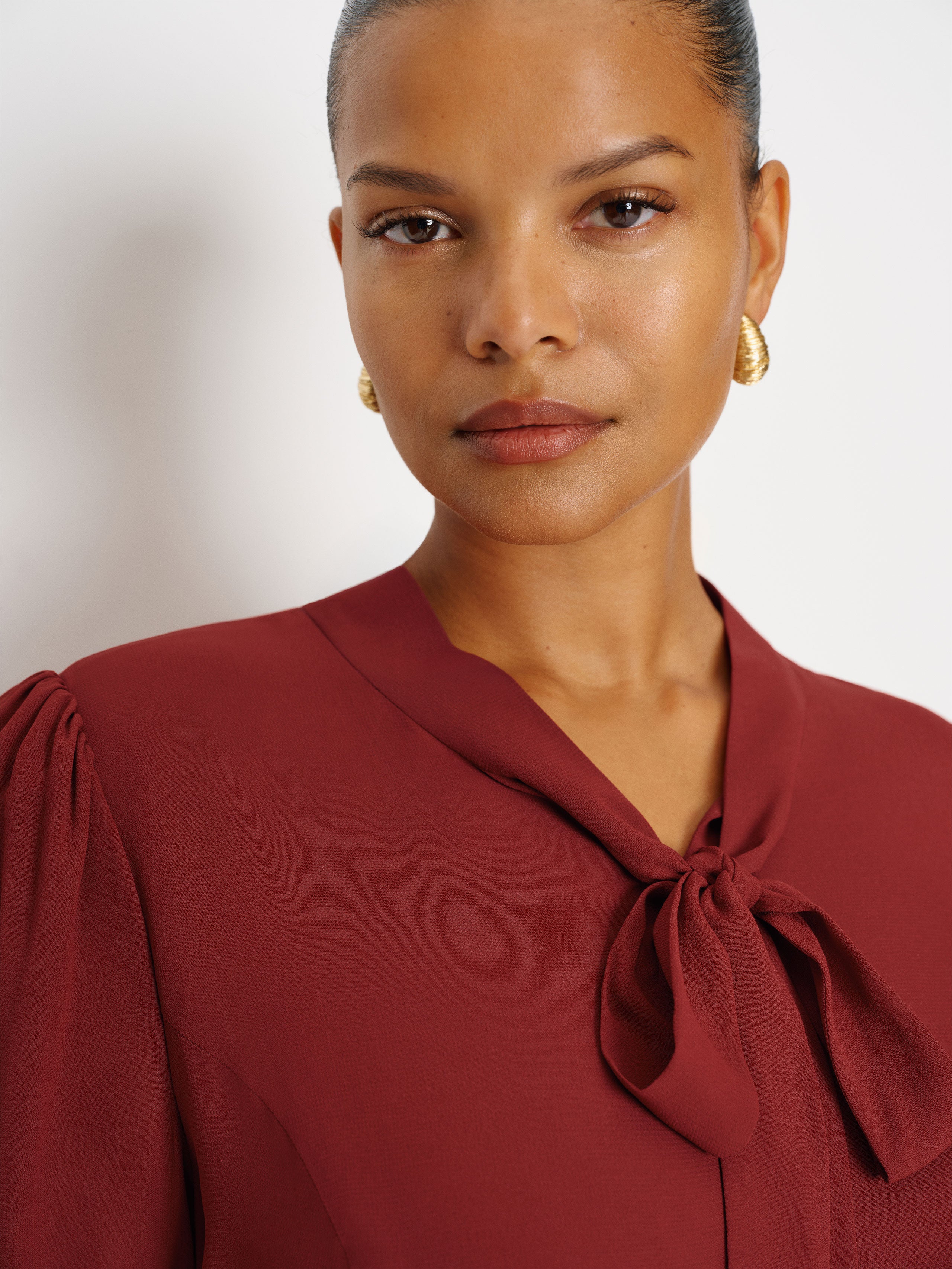 Cute top. Shop the Cloud Egg Blouse ES from Reformation, a short-sleeved top with a flutter sleeve, a bow at the neckline, and pleat detailing at the hem.
