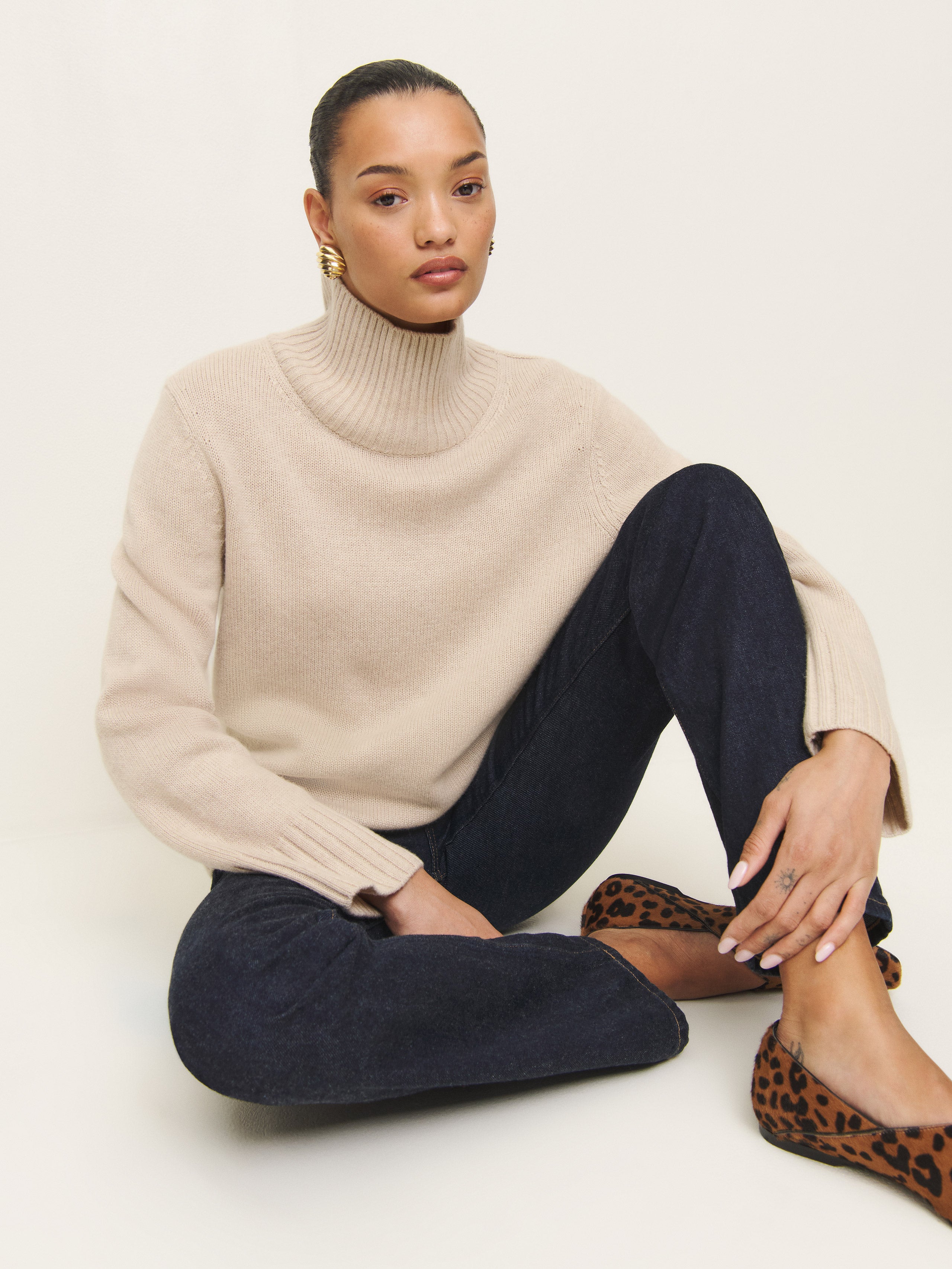 Cozy time. Shop the Conrad Cashmere Turtleneck from Reformation, a cashmere turtleneck sweater with ribbing at the sleeve, hem, and neck.