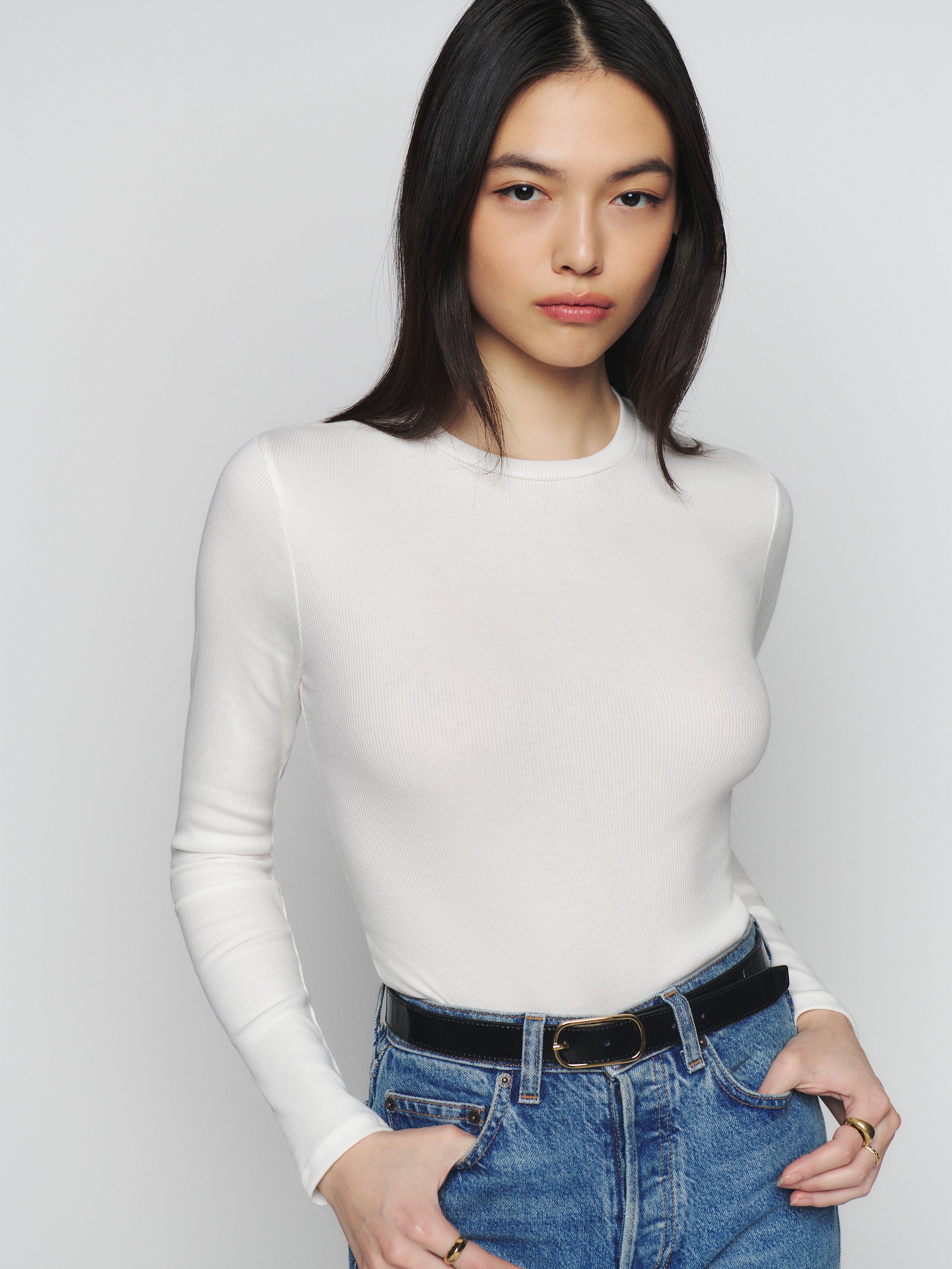 Sometimes we're basic. This is a tight fitting shirt with a crew neck and long sleeves.
