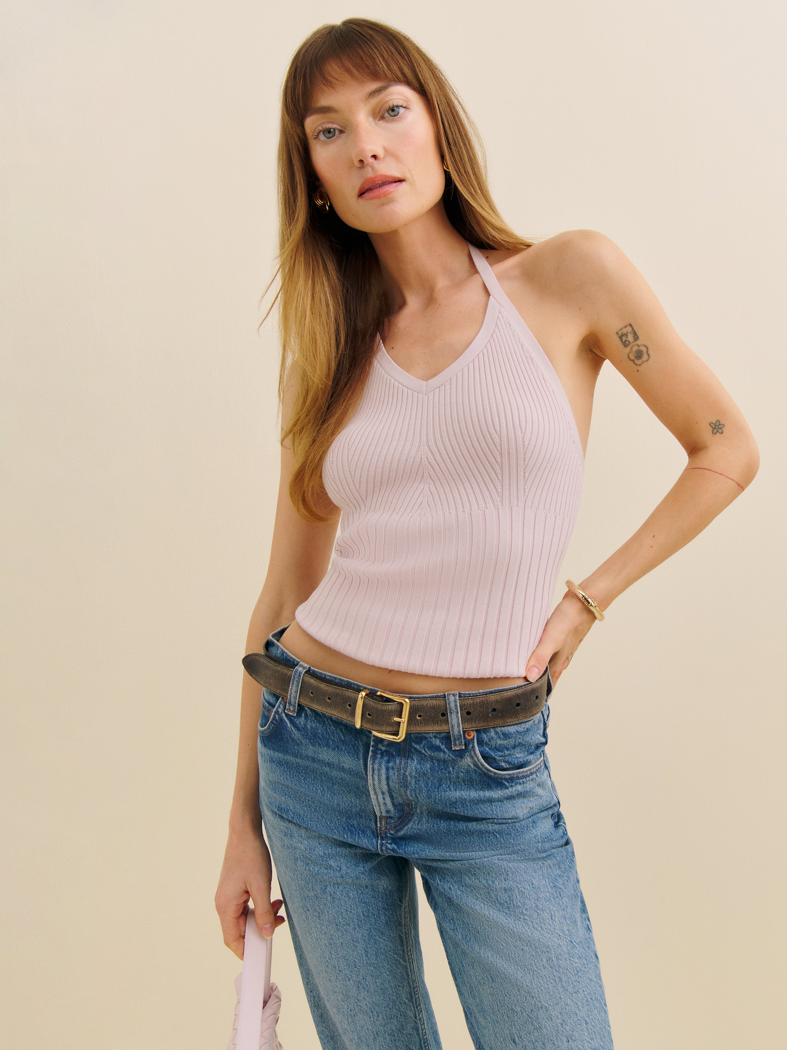 Up top. Shop the Delia Ribbed Halter Top from Reformation, a sleeveless top with a halter v...
