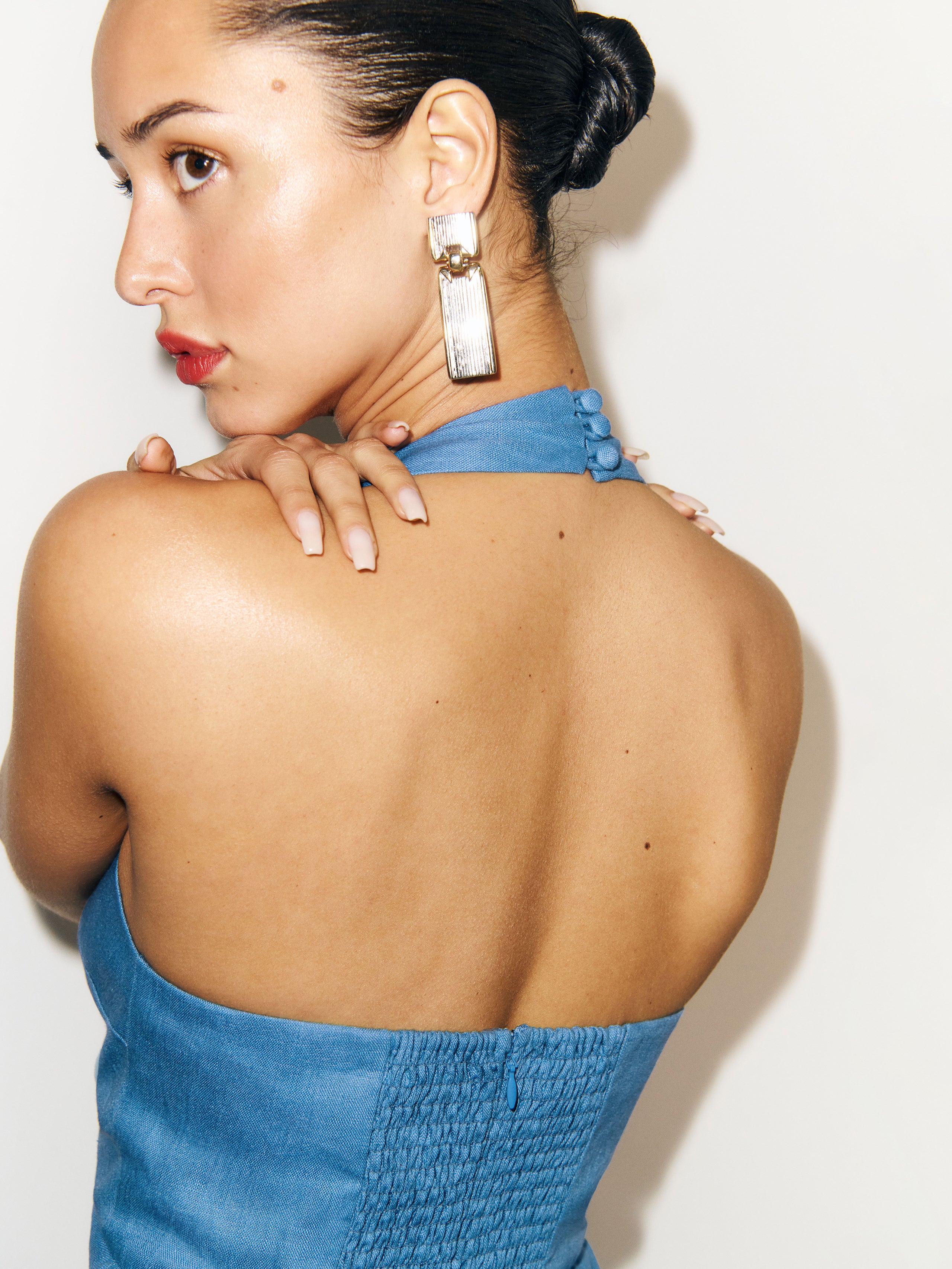 Romance for one. Shop the Delilah Linen Dress from Reformation, a maxi-length dress with a halter neckline.