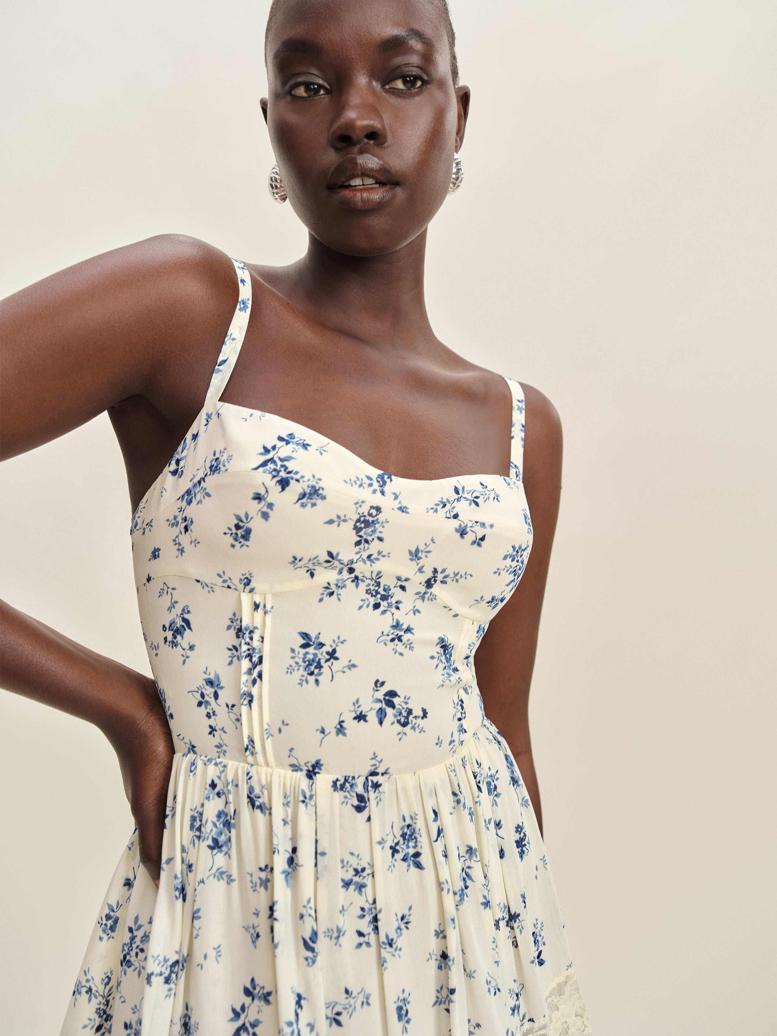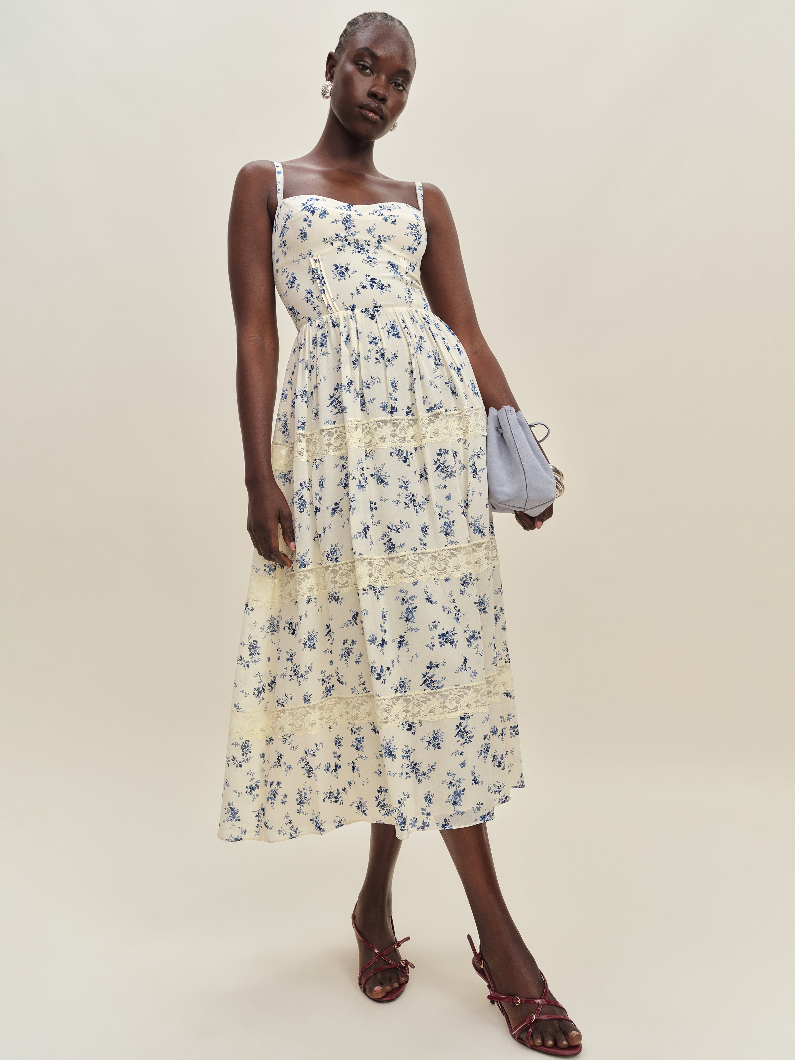 Shop the Dina Dress from Reformation, a sleeveless midi dress with a sweetheart neckline, pleated skirt, and lace detailing.