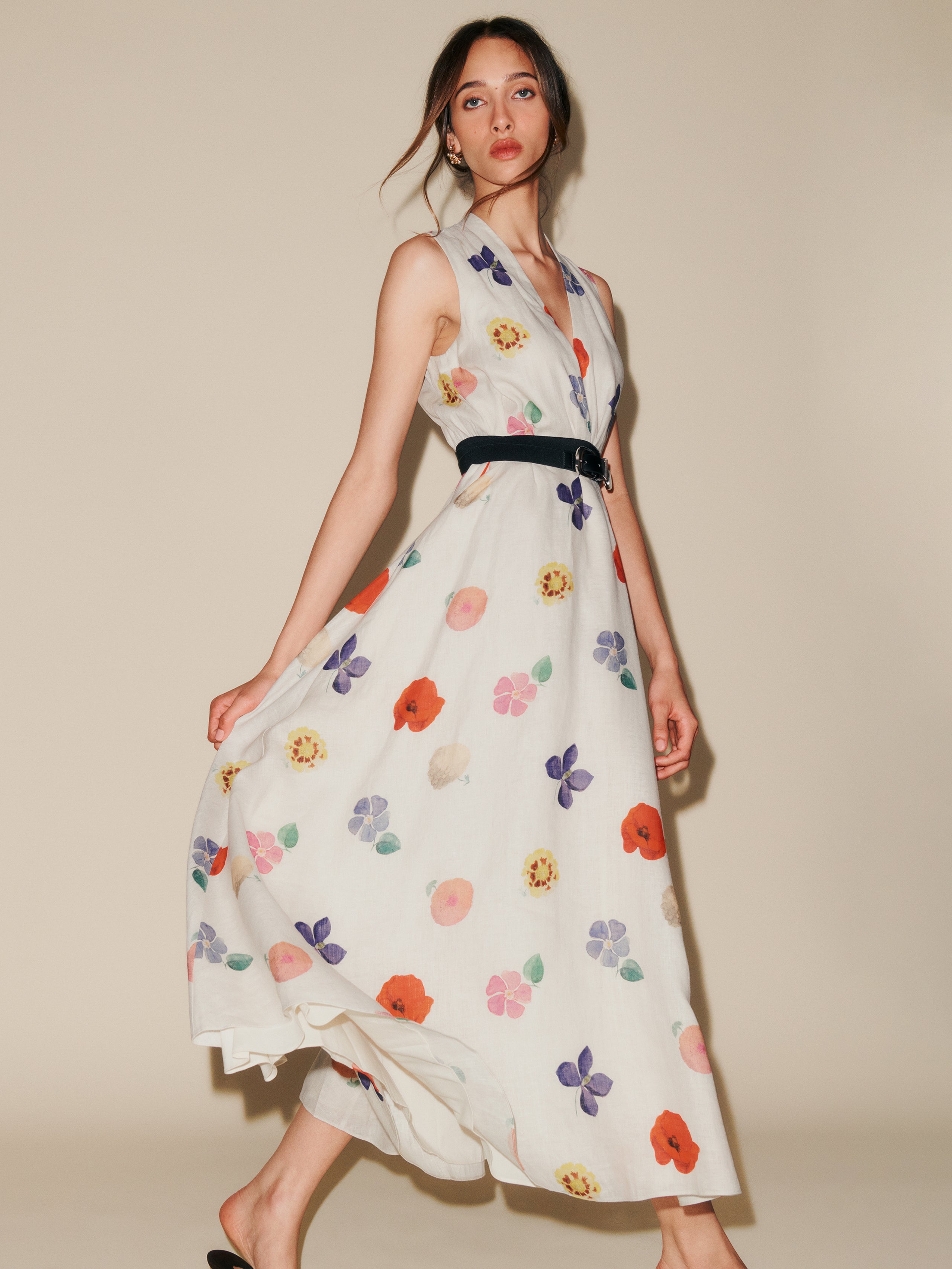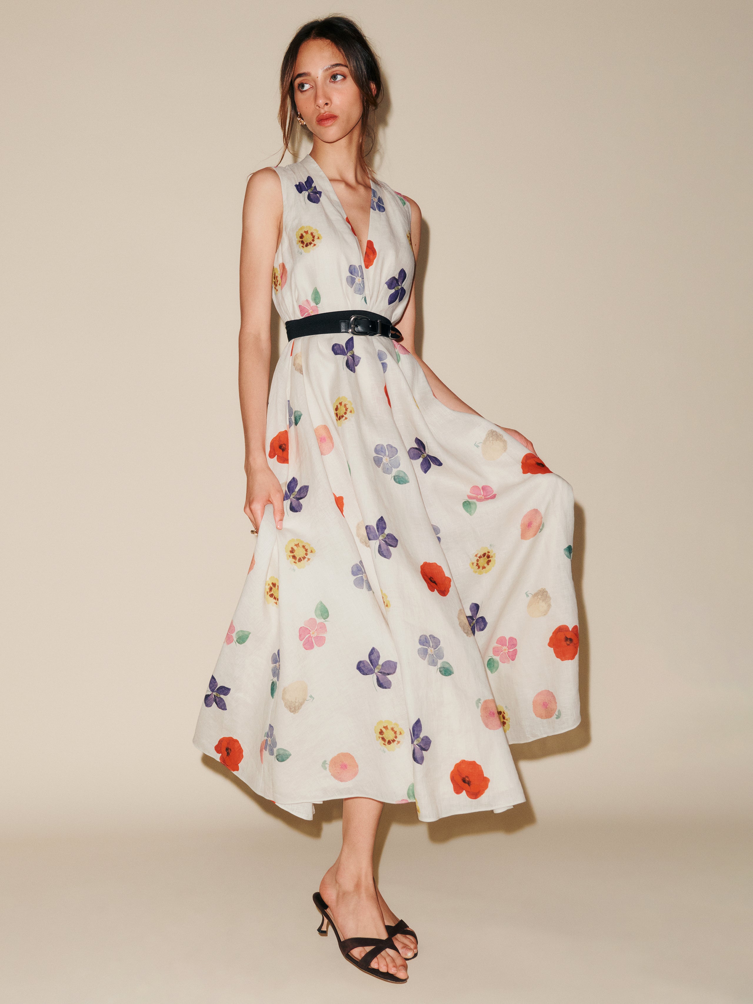 You flirt. Shop the Downing Dress from Reformation, a sleeveless midi dress with a deep v-neck, relaxed fit, and button-down front.